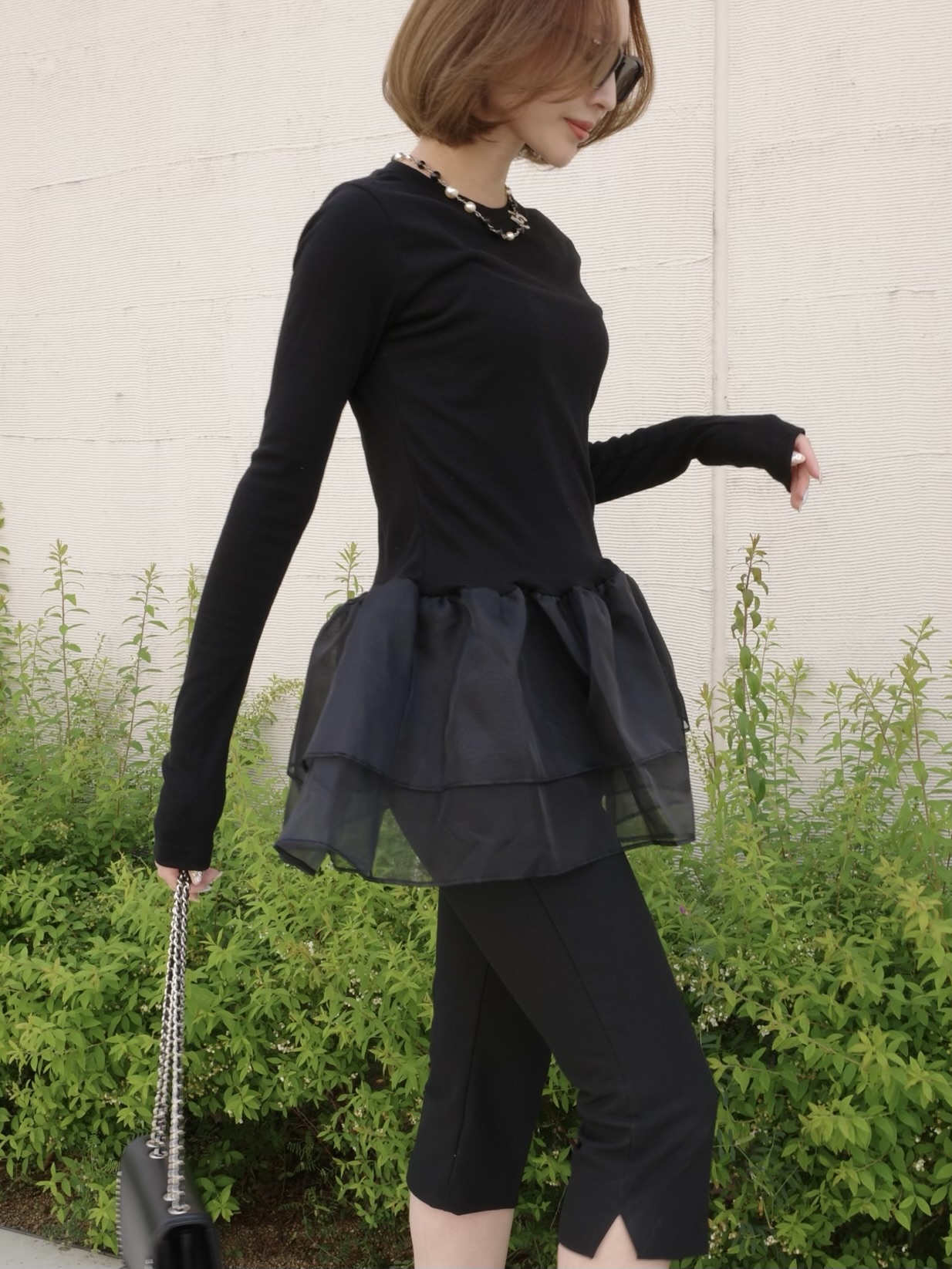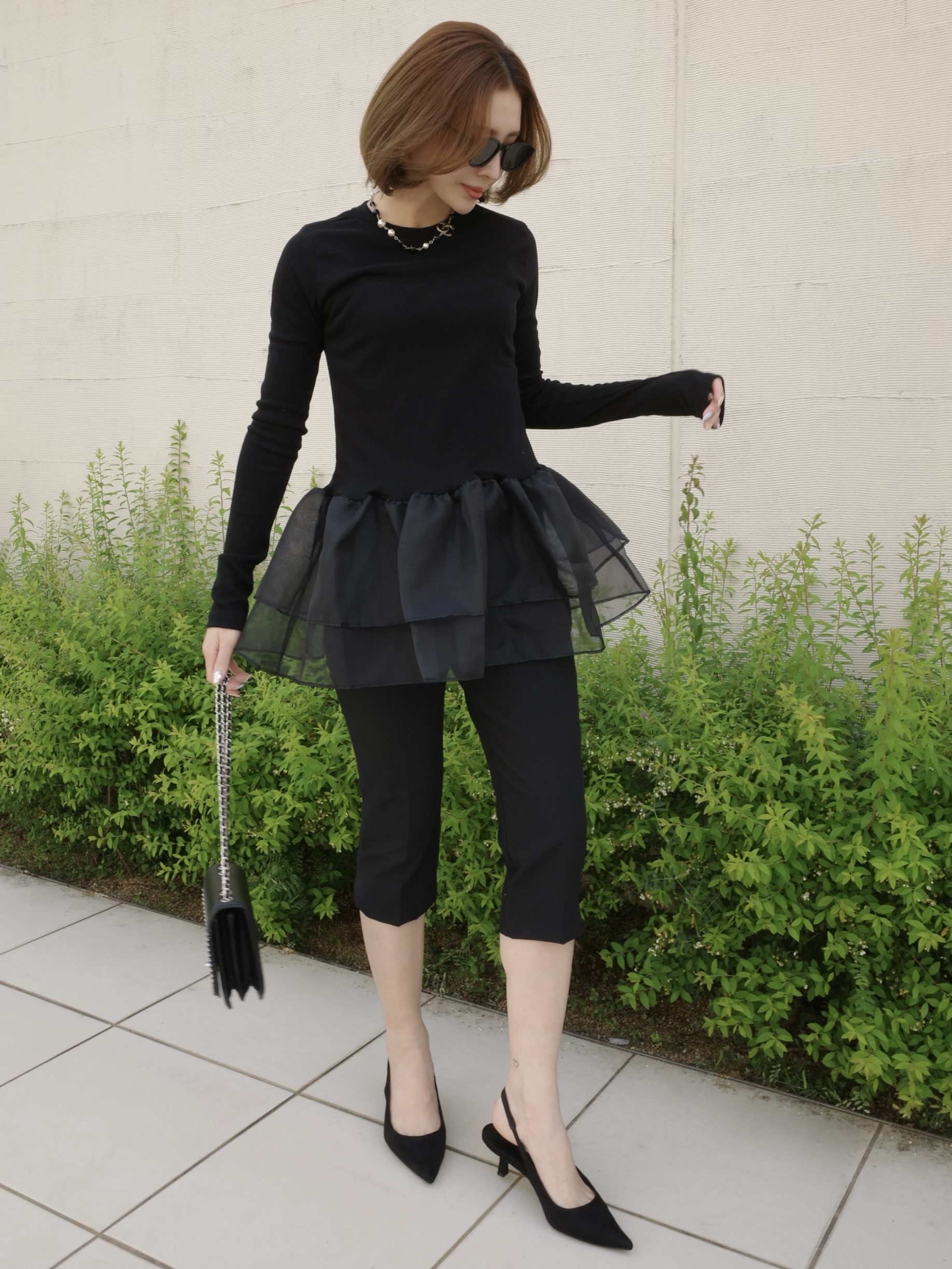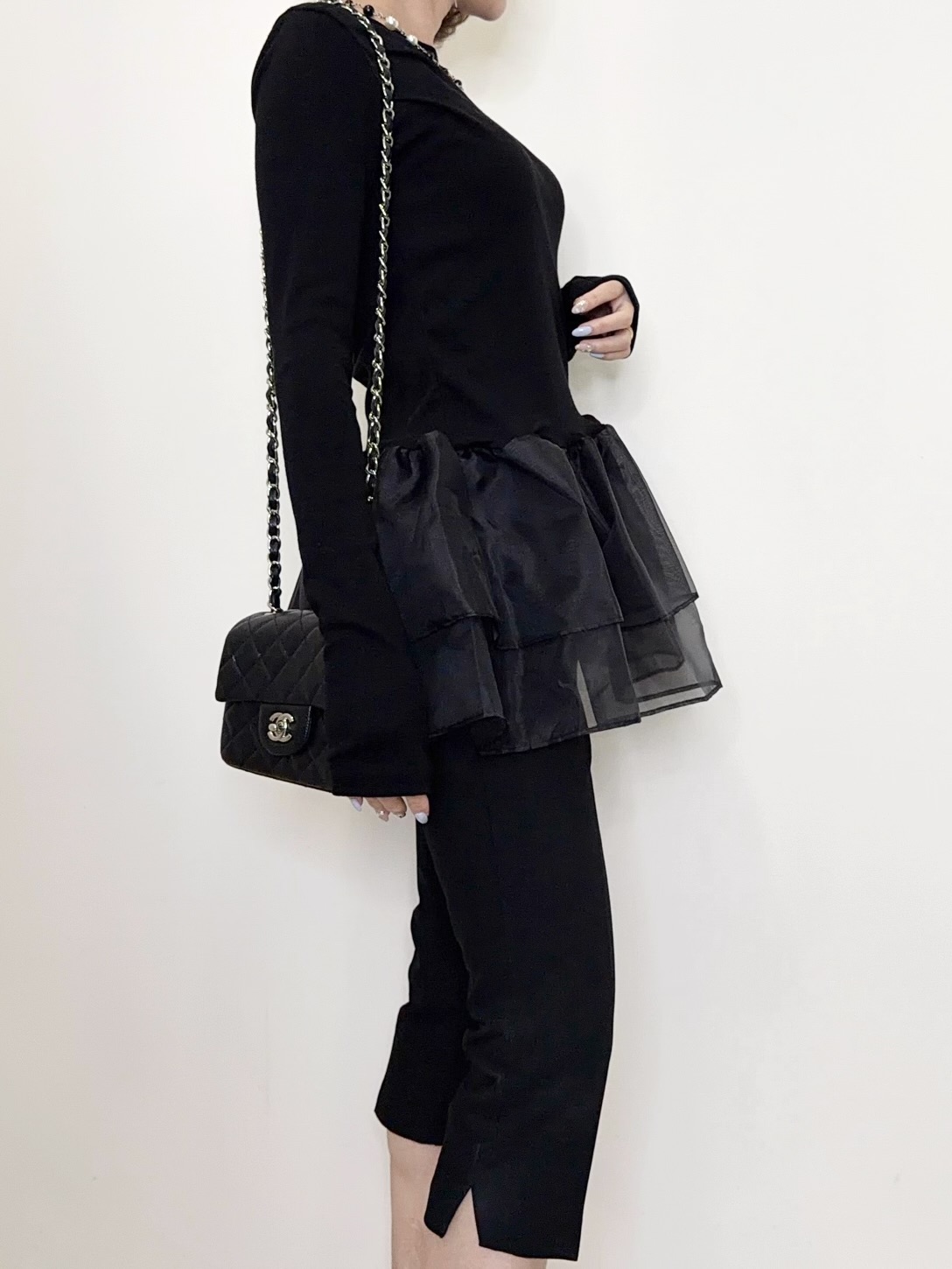 オーガンジーの立体的なフリルが目を引くトップス。