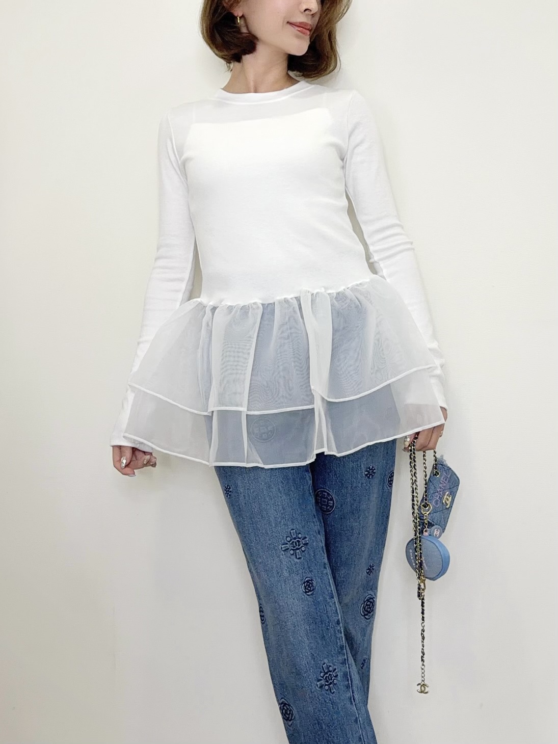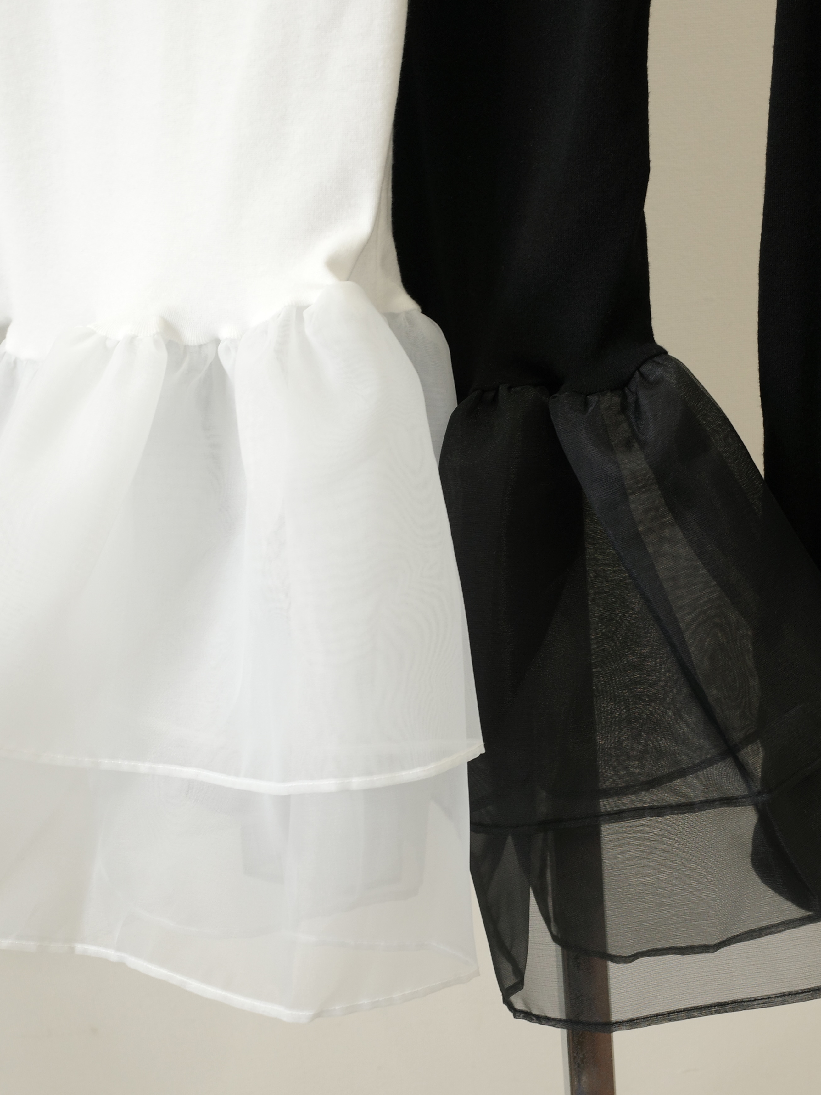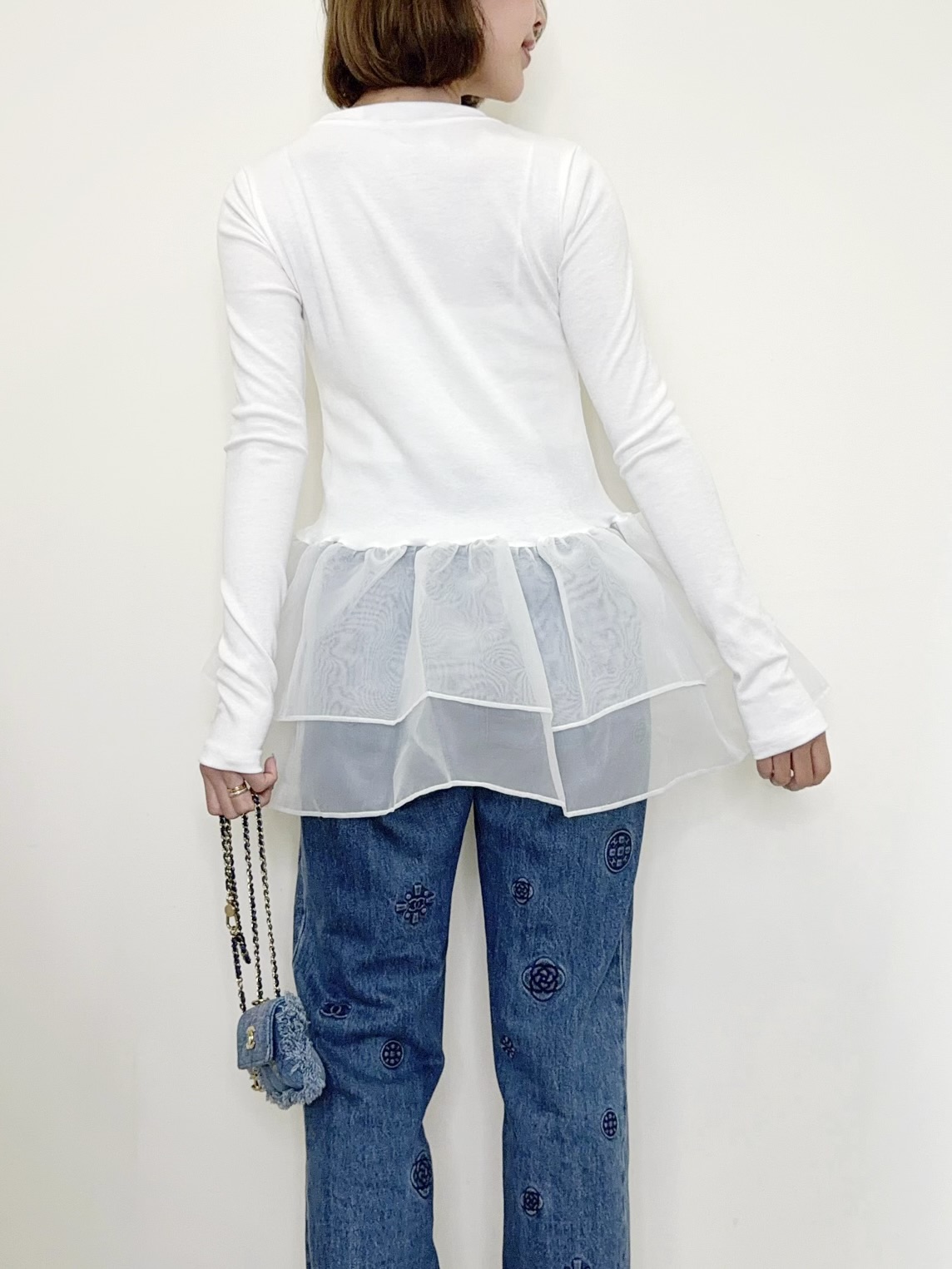 オーガンジーの立体的なフリルが目を引くトップス。