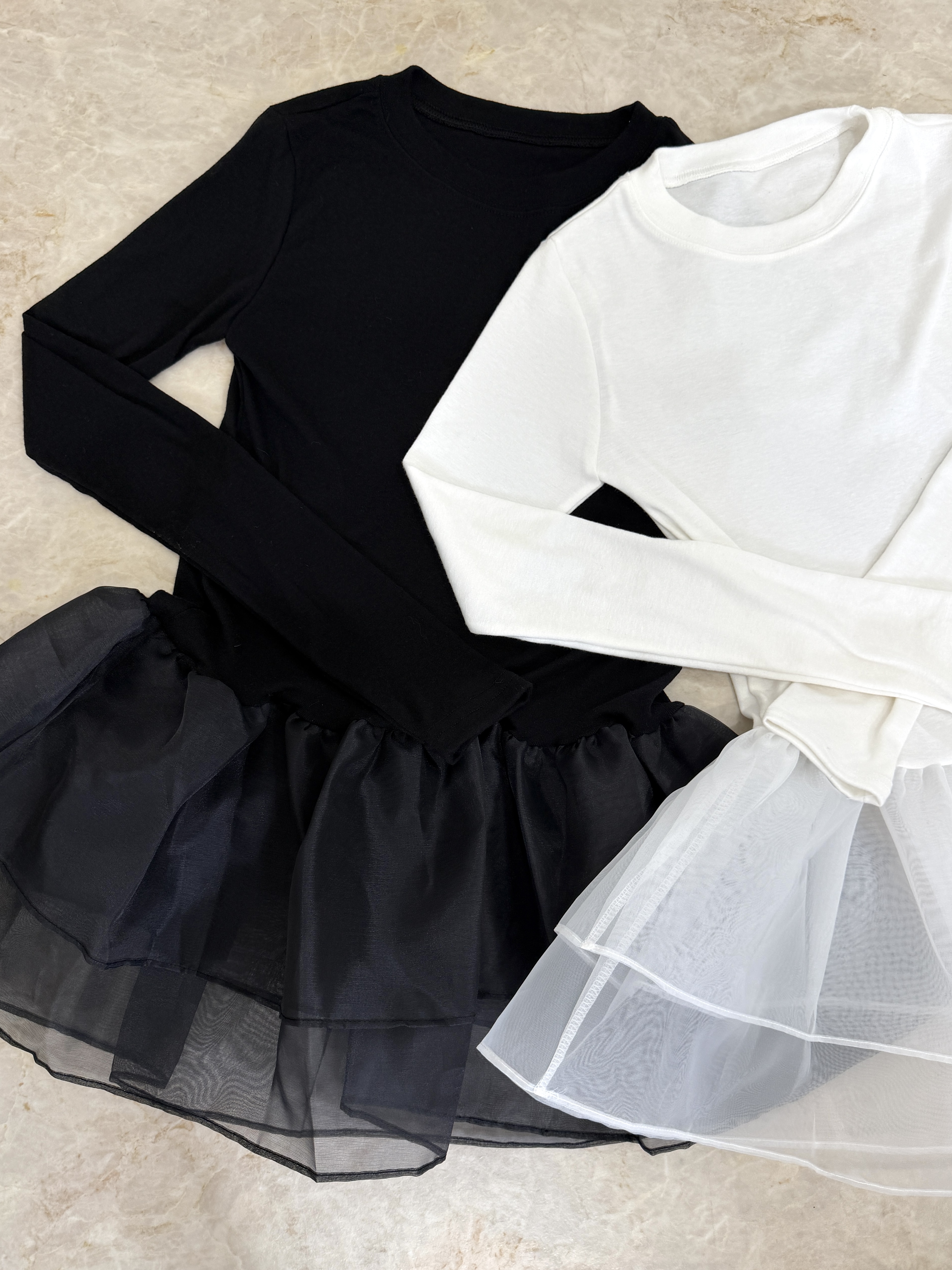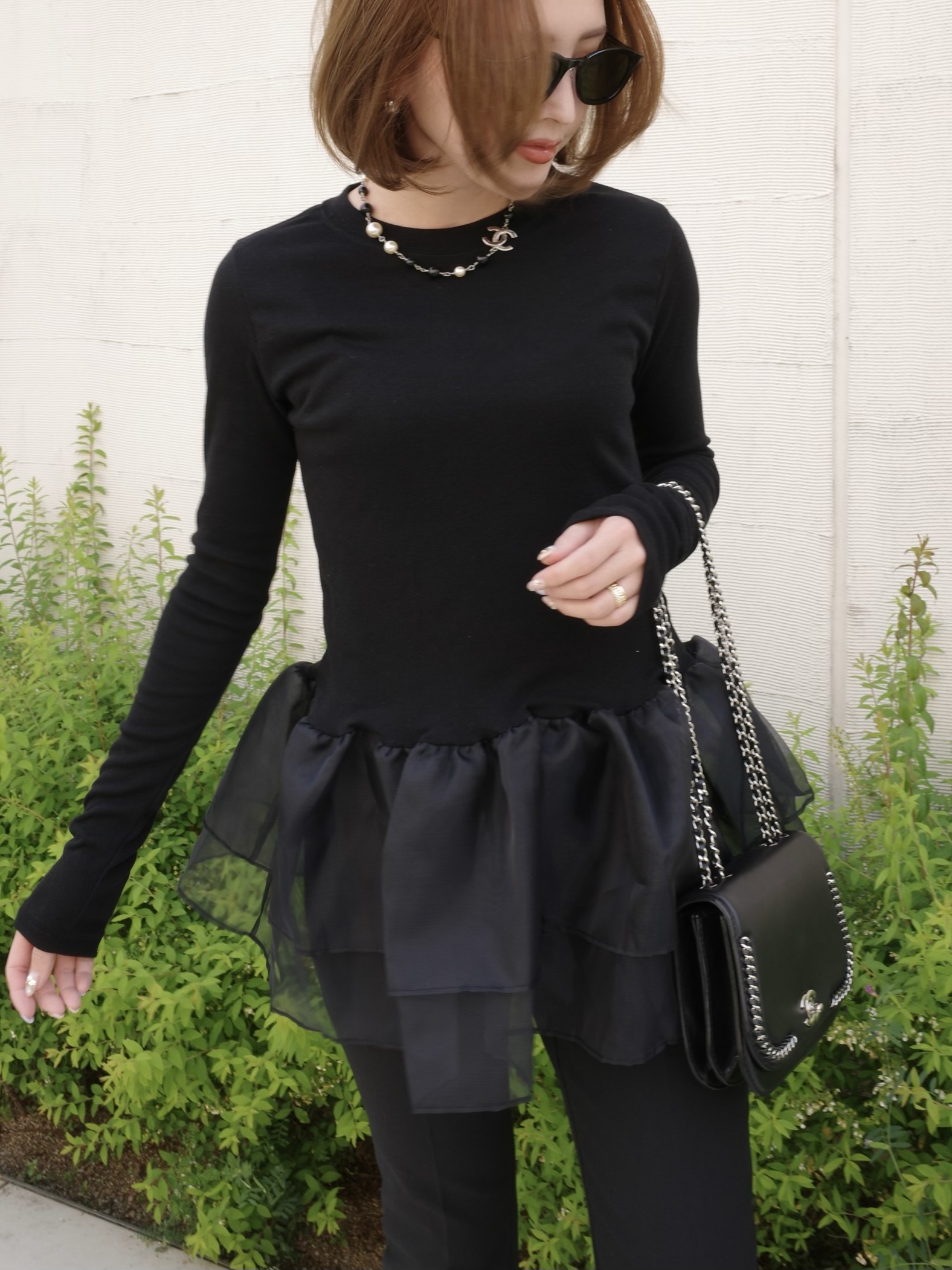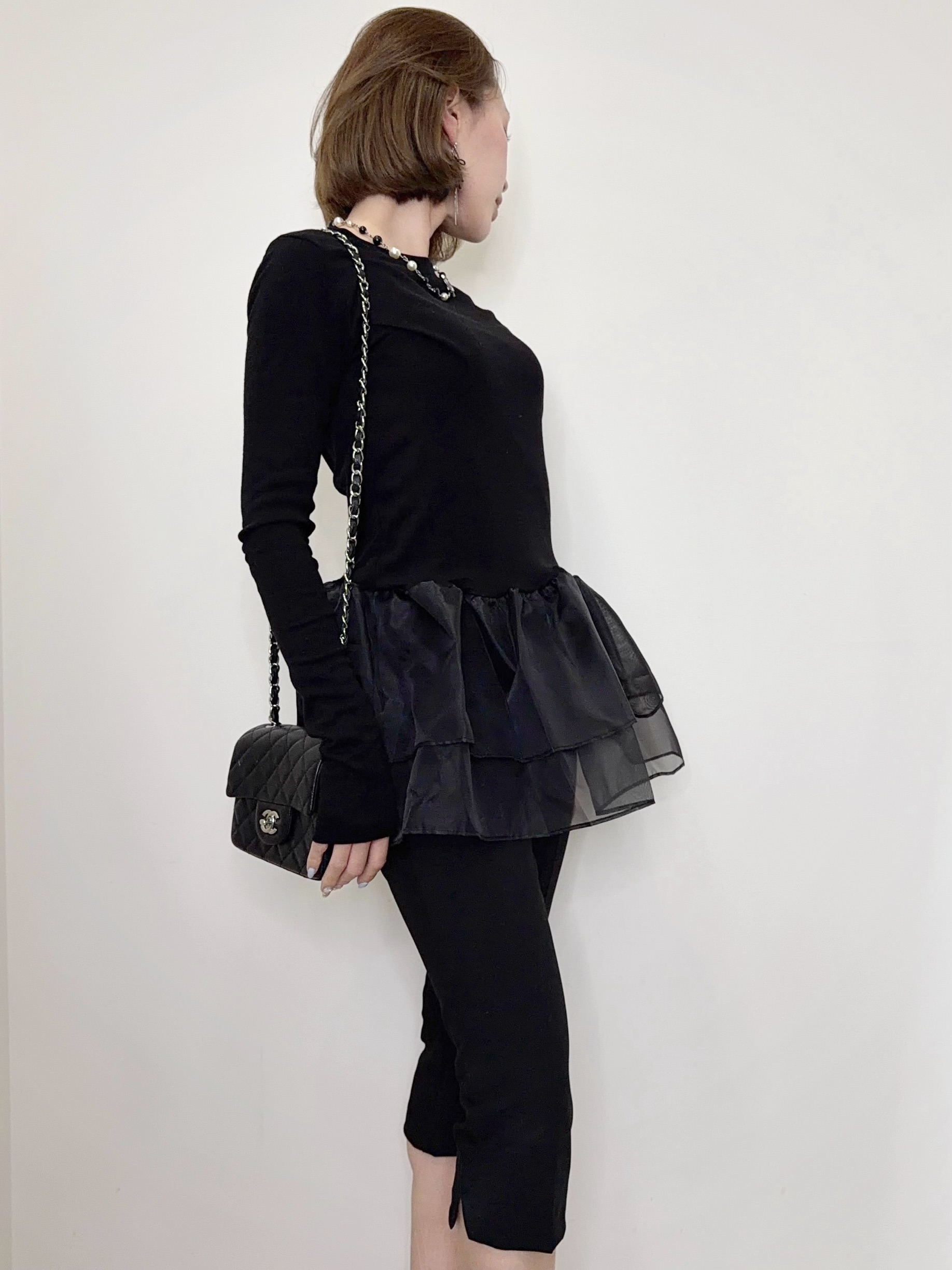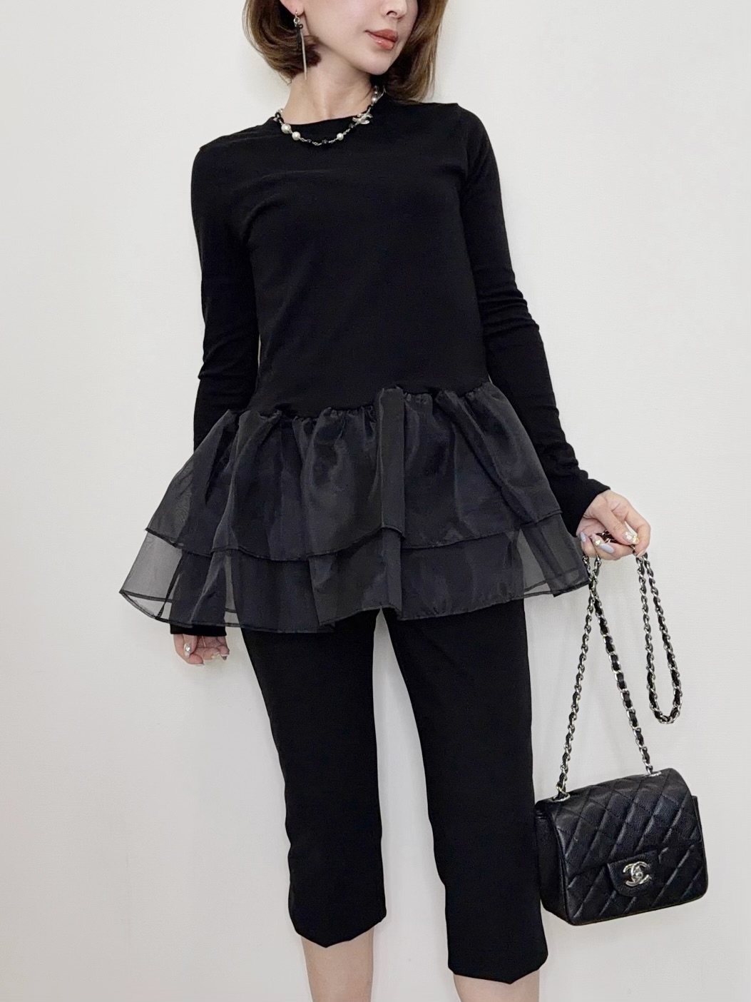 オーガンジーの立体的なフリルが目を引くトップス。