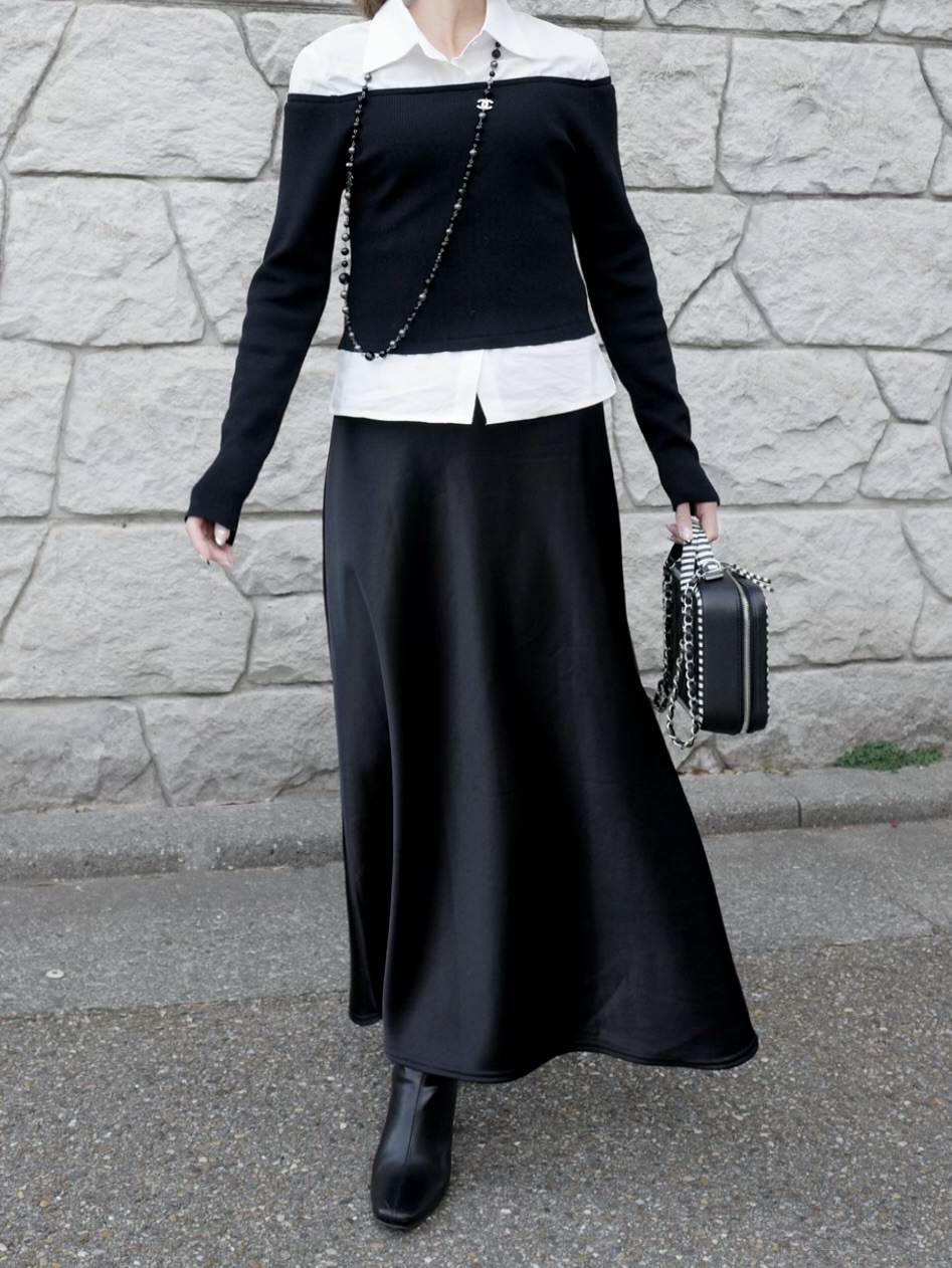 Glossy drape skirt(BLK/IVO)