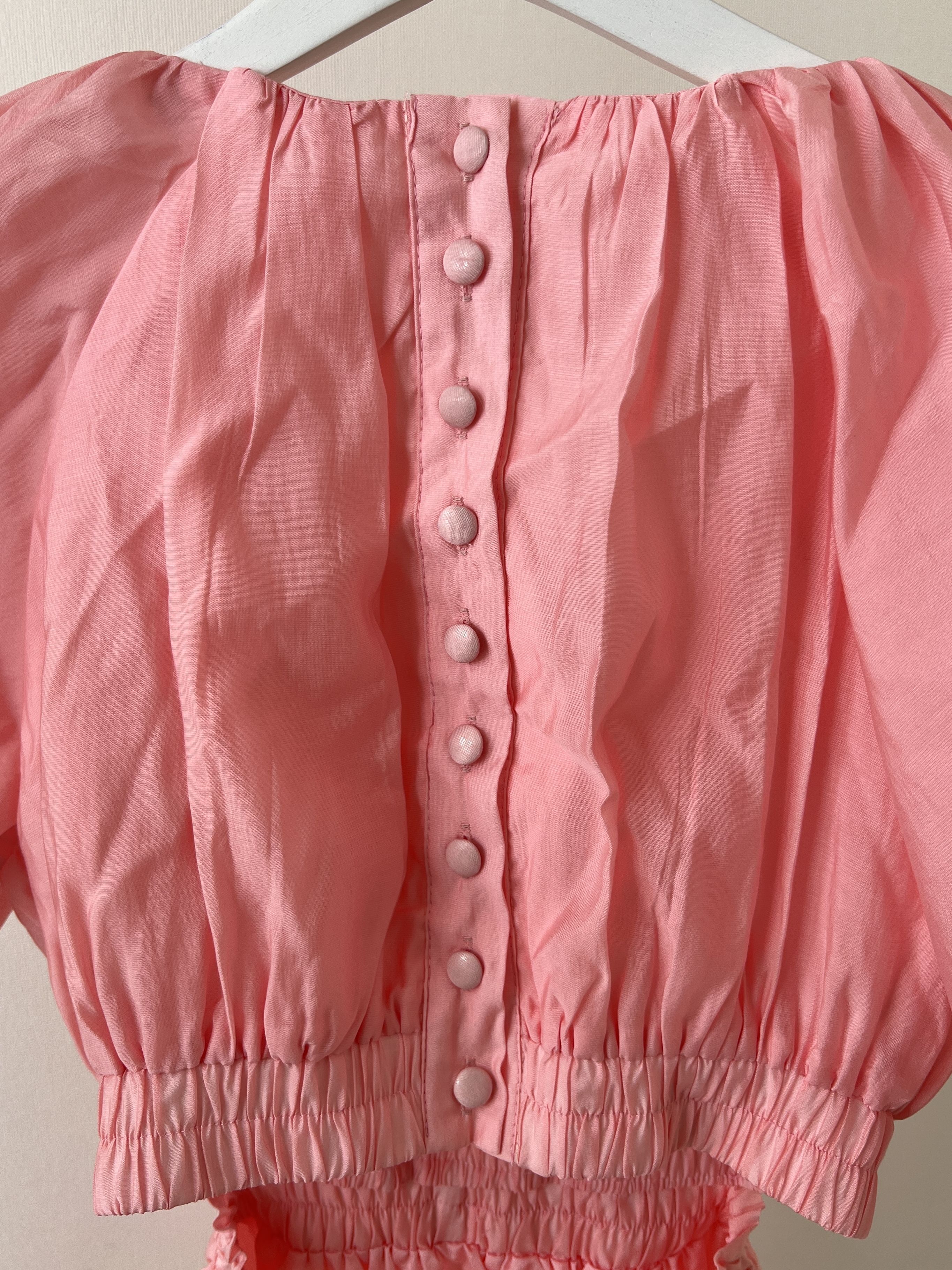 バルーンスリーブとバックの開きがポイント。