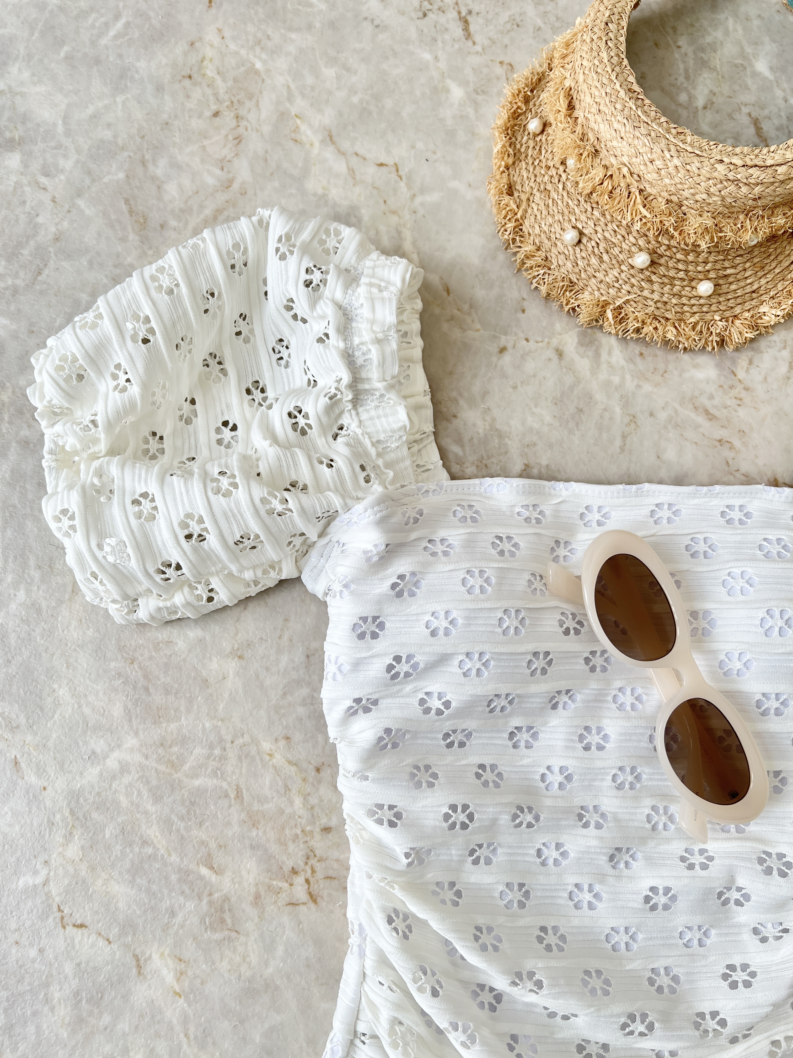 【※ネコポス送料無料】システムの構造上、【ネコポス送料無料】と記載の商品と他の商品との同時注文ができない為、他の商品もご注文頂く場合は大変お手数では御座いますが分けてのご注文をお願いいたします。【ネコポス送料無料】と記載の商品を複数点ご注文頂く際も分けてのご注文をお願いいたします。大人に嬉しい露出控えめのワンピースタイプのスイムウエア。気になる二の腕をカバーしてくれるパフスリーブがポイント。フラワーのカットワーク生地がフェミニンな雰囲気を演出します。オフショルダーとしても着用可能な2wayデザイン。ショートパンツ等を履けば、洋服のようにもお召し頂けます。ホワイトは透け感がある為、インナーショーツの着用をお願い致します。※こちらの商品は衛生上、返品交換不可となります。予めご了承ください。【SIZE】バスト約83cmヒップ約87~93cm【素材】ポリアミド82%、エラスタン18%■クロネコ代金後払いをご利用のお客様■商品到着後に請求書(払込用紙)が到着します。14日以内にお支払いをお願いします。全国の主要なコンビニで、請求書をレジに持っていくだけでお支払いが可能です。全国の郵便局でも同じ請求書でお支払いできます。※ご請求書が圧着ハガキタイプの場合、郵便局でのお支払いはできません。※弊社の銀行口座宛にお振込頂くものでは御座いません。ご注意下さい。