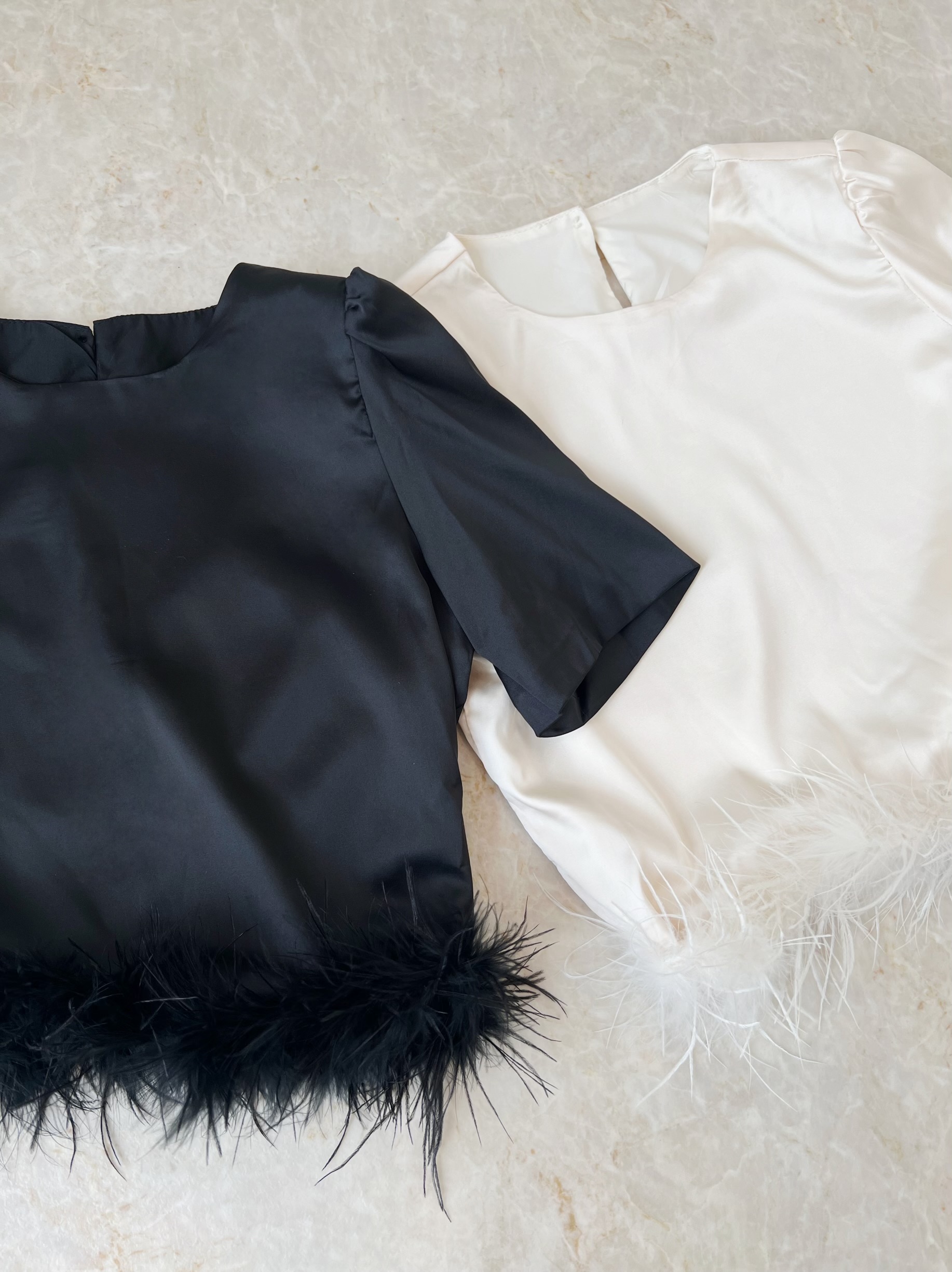 夏から秋へ。ふわふわフェザーが裾にあしらわれた2カラー展開のトップス。