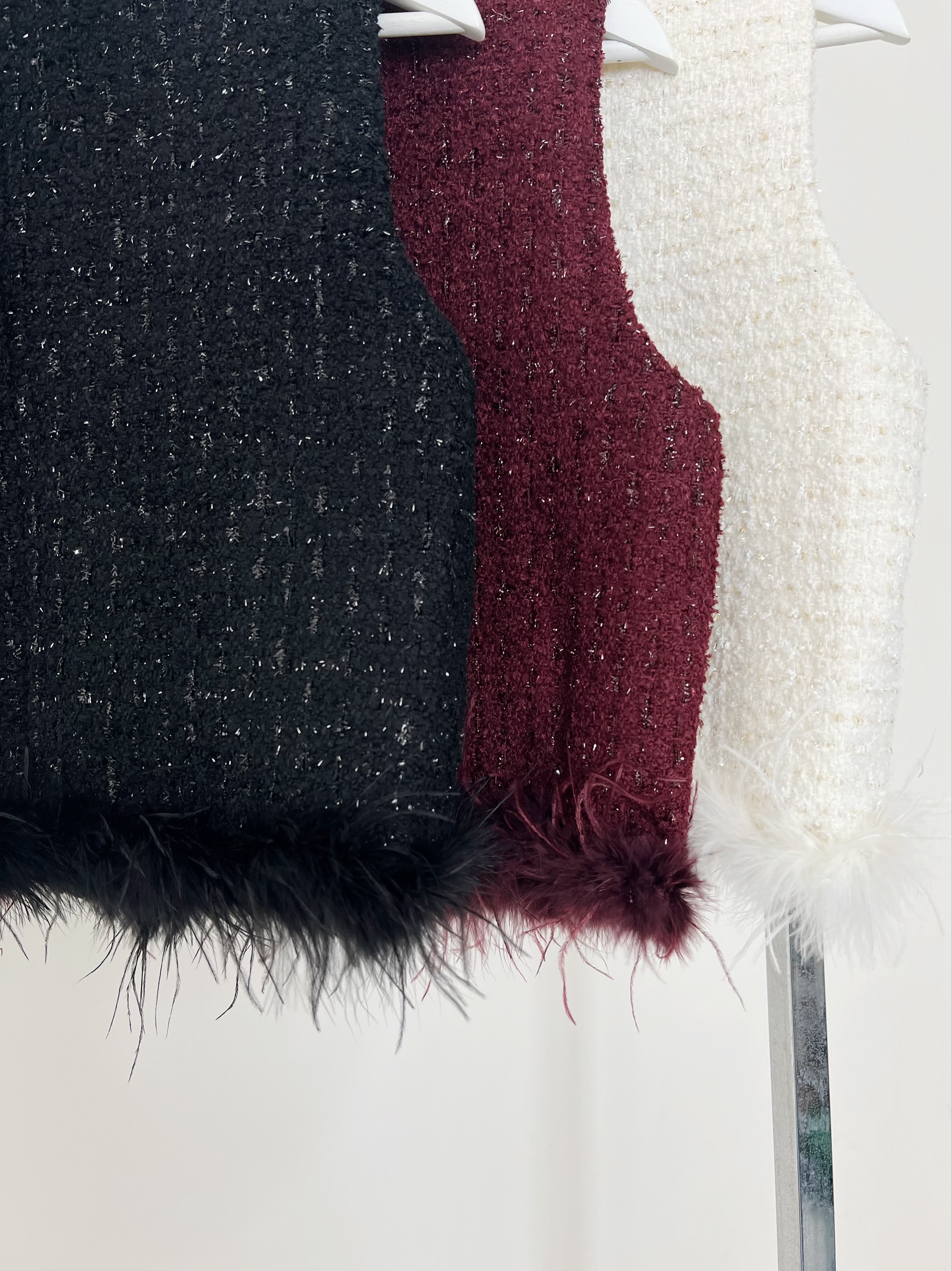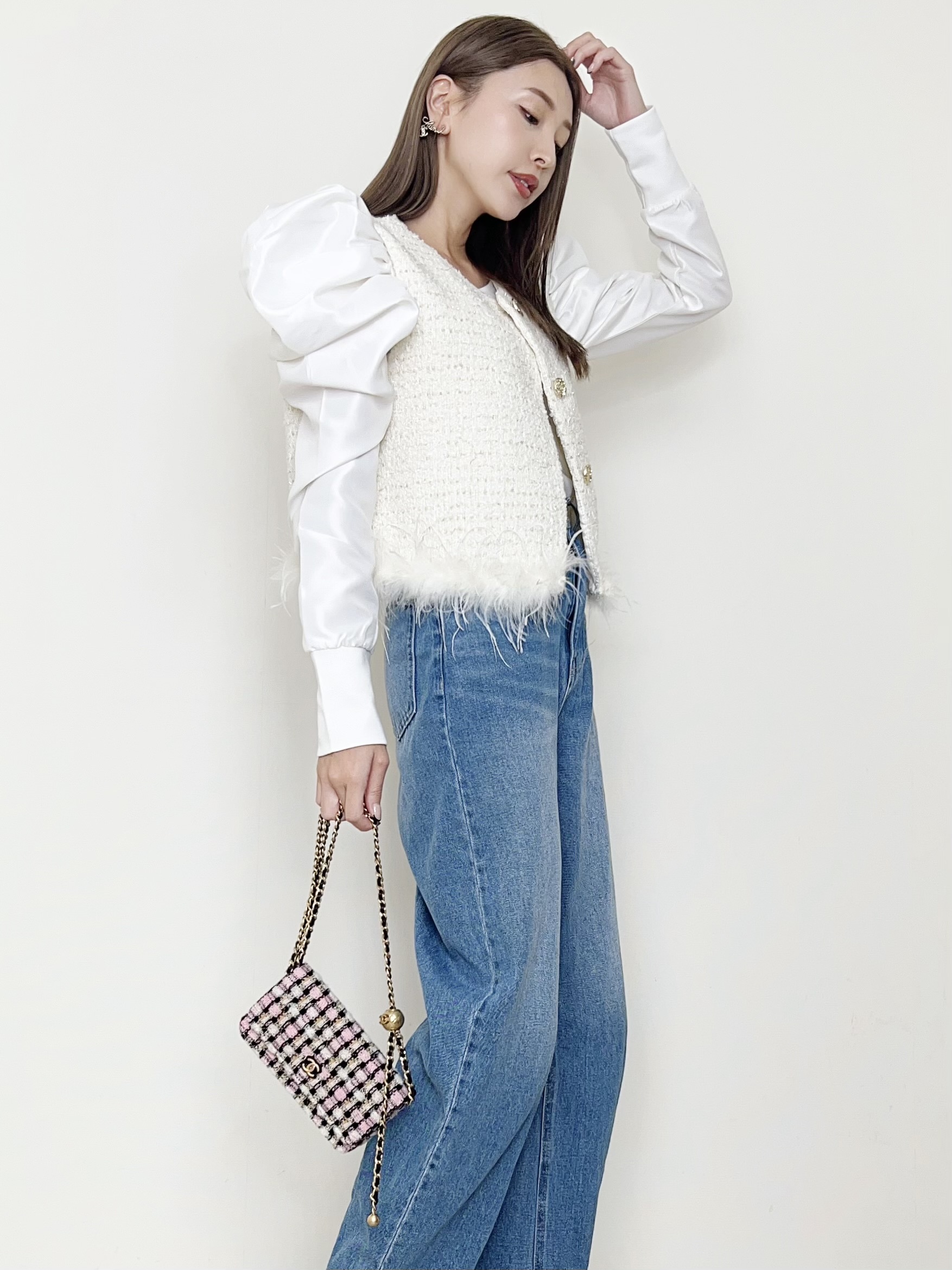 裾のフェザーがポイントのツイードジレ。キラキラ輝くツイードがラグジュアリーな雰囲気を演出。ブラック、アイボリー、バーガンディーの3カラー展開。シンプルなコーディネートのワンポイントにピッタリな1枚です。コンパクトなシルエットでバランス良くお召し頂けます。フェザーは取り外し不可となります。STAFF:158cm【サイズ】(平置き採寸/約)着丈47cm 肩幅34cm 身幅45cm 【素材】本体:ポリエステル100% 付属部分:フェザー100% ■クロネコ代金後払いをご利用のお客様■商品到着後に請求書(払込用紙)が到着します。14日以内にお支払いをお願いします。全国の主要なコンビニで、請求書をレジに持っていくだけでお支払いが可能です。全国の郵便局でも同じ請求書でお支払いできます。※ご請求書が圧着ハガキタイプの場合、郵便局でのお支払いはできません。※弊社の銀行口座宛にお振込頂くものでは御座いません。ご注意下さい。