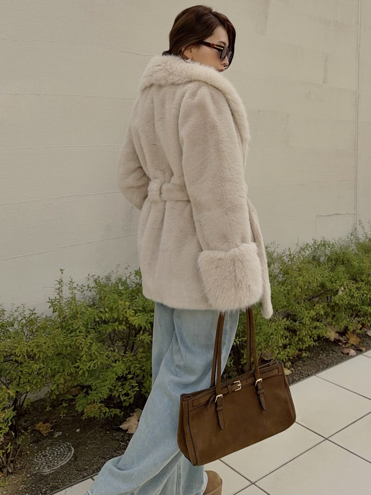 カジュアルにも綺麗目なスタイリングにもマッチするふわふわな肌触りのフェイクファーコート。