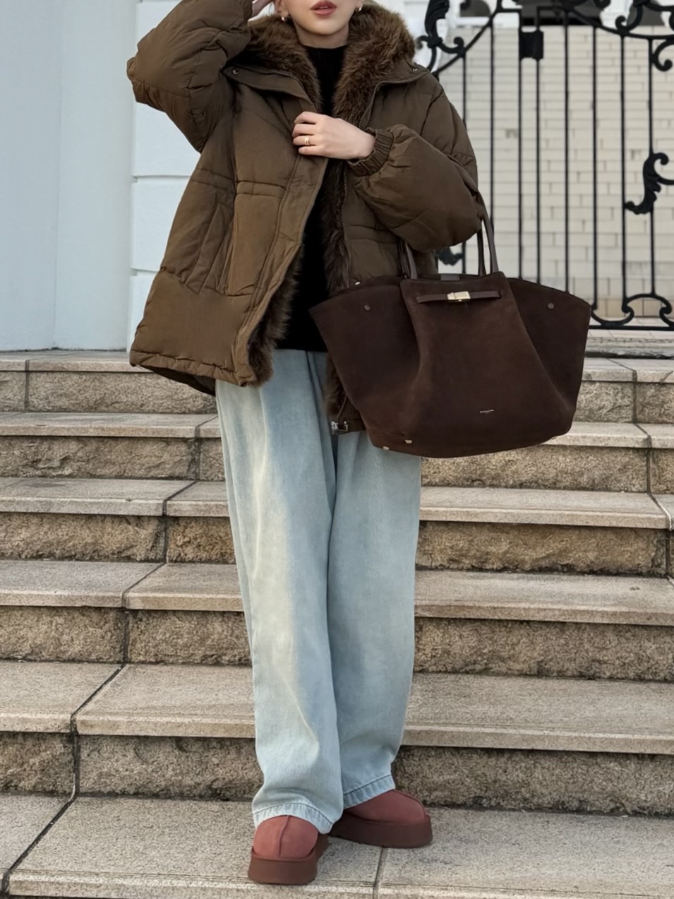 お顔周りのボリューミーなファーで小顔効果も叶えます。