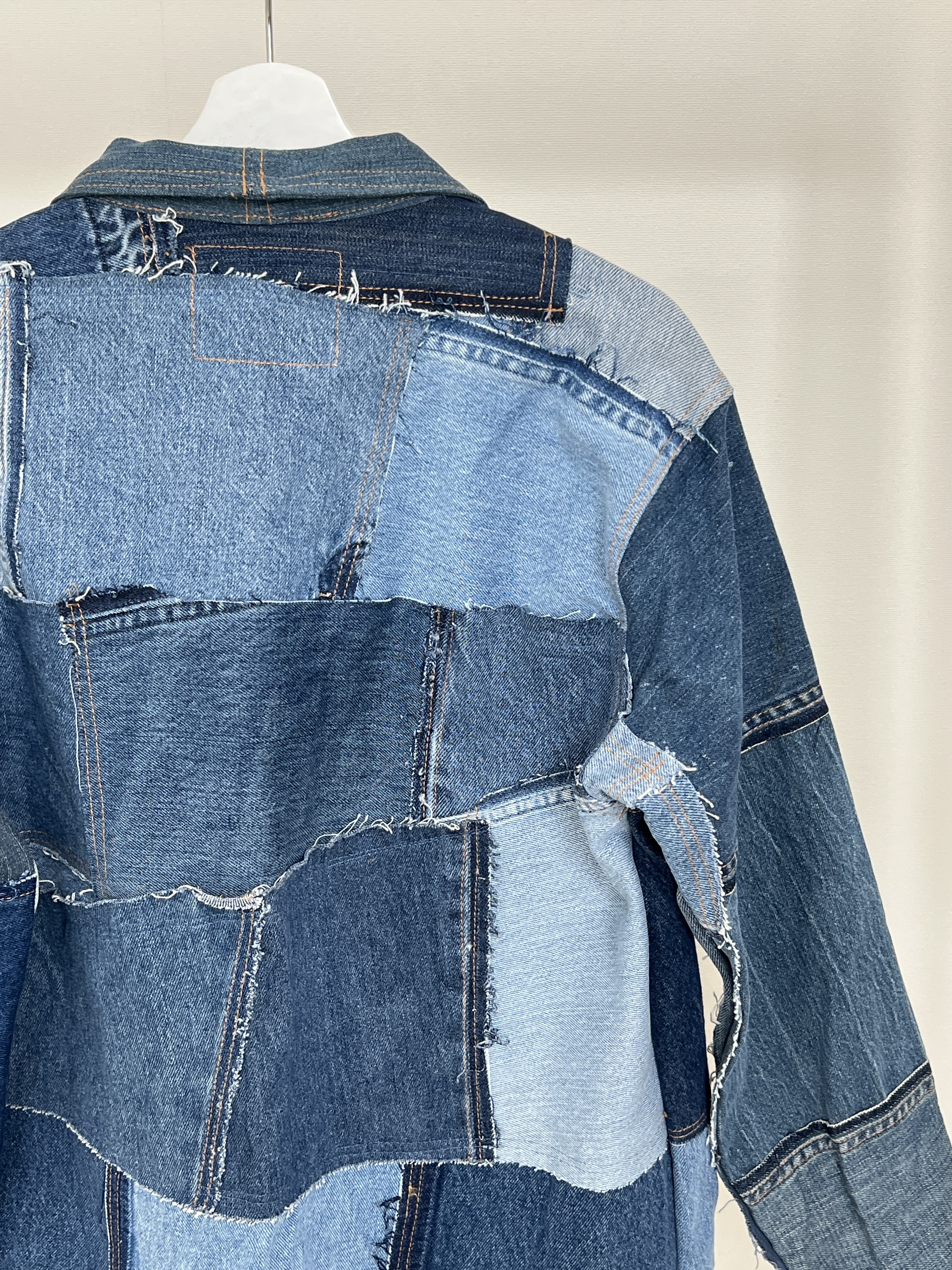 同系色のブルーのデニムをつぎはぎしたデニムジャケット。