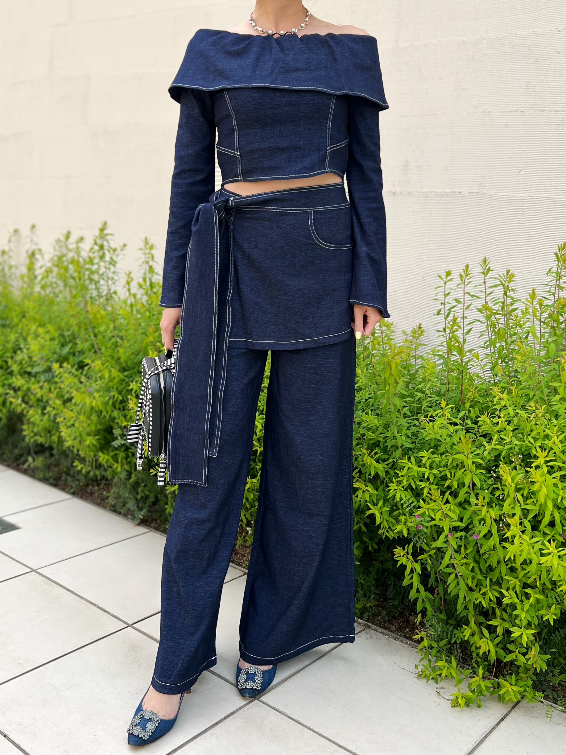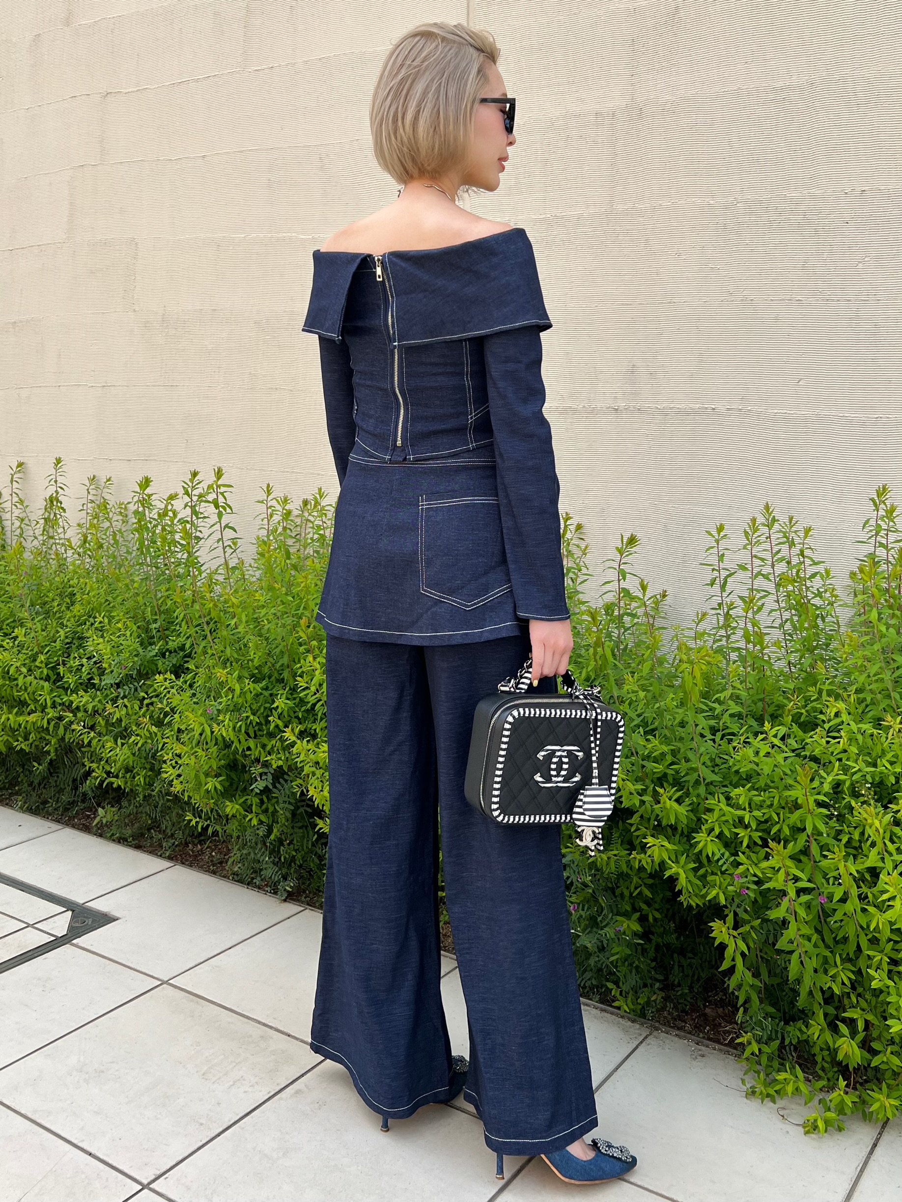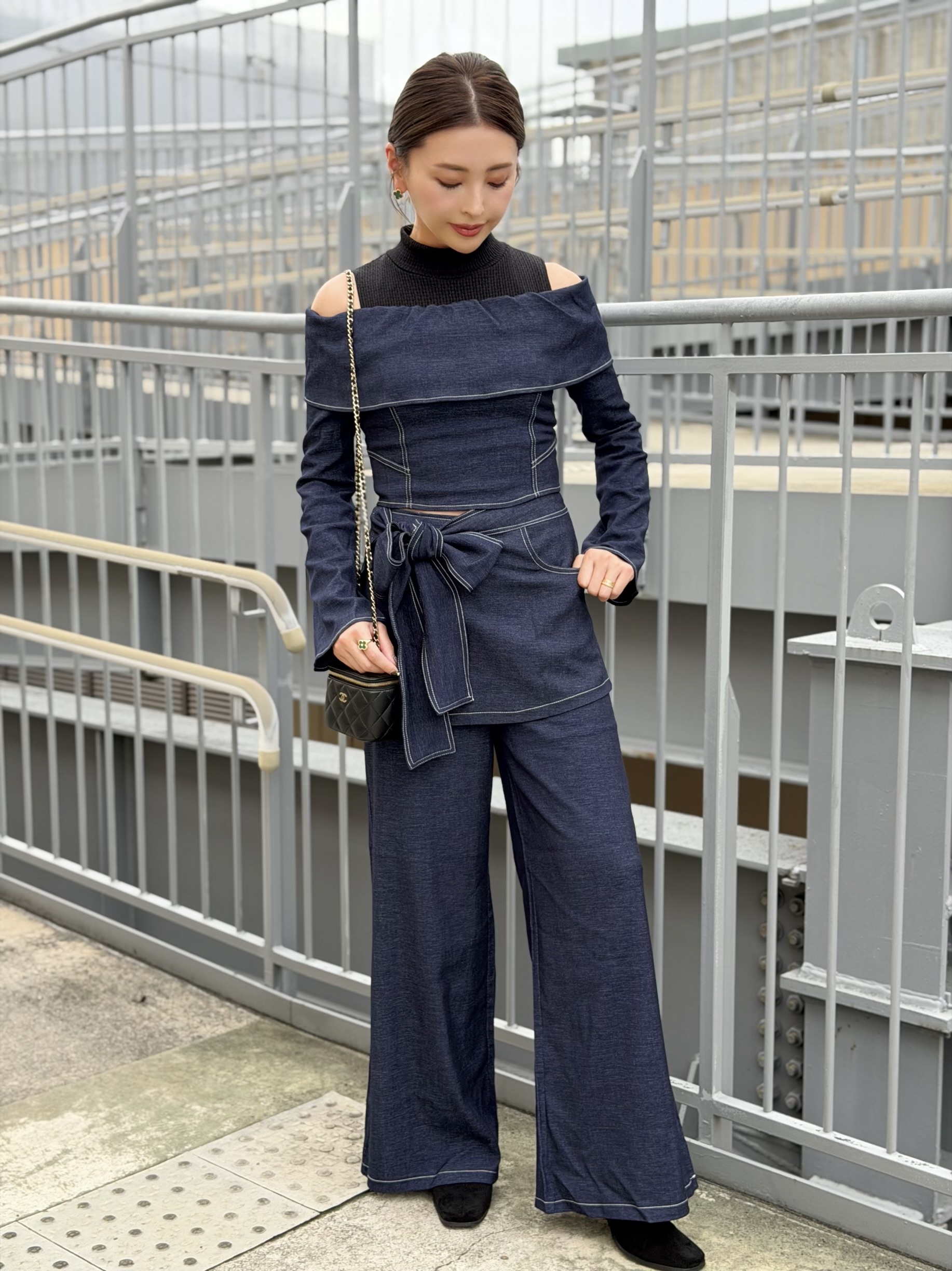 オフショルダーのデニムトップスはフリルデザインがポイント。