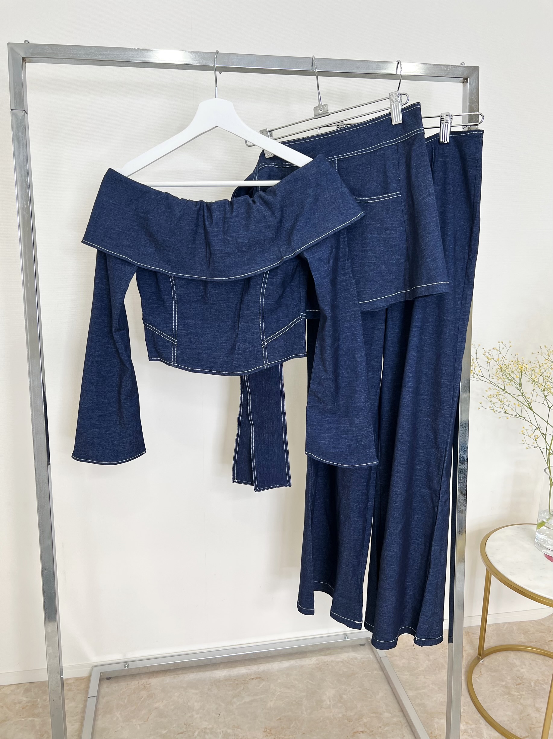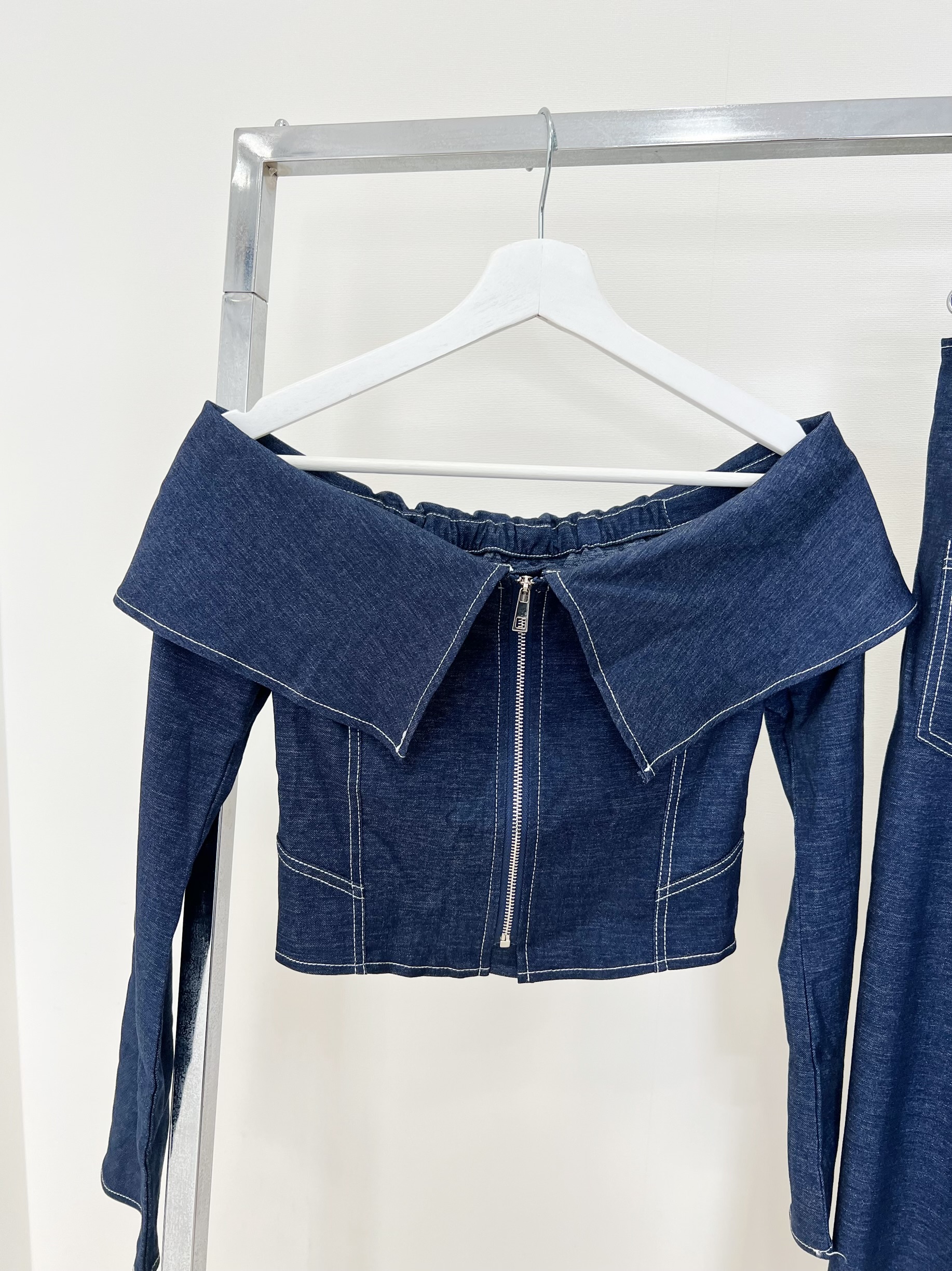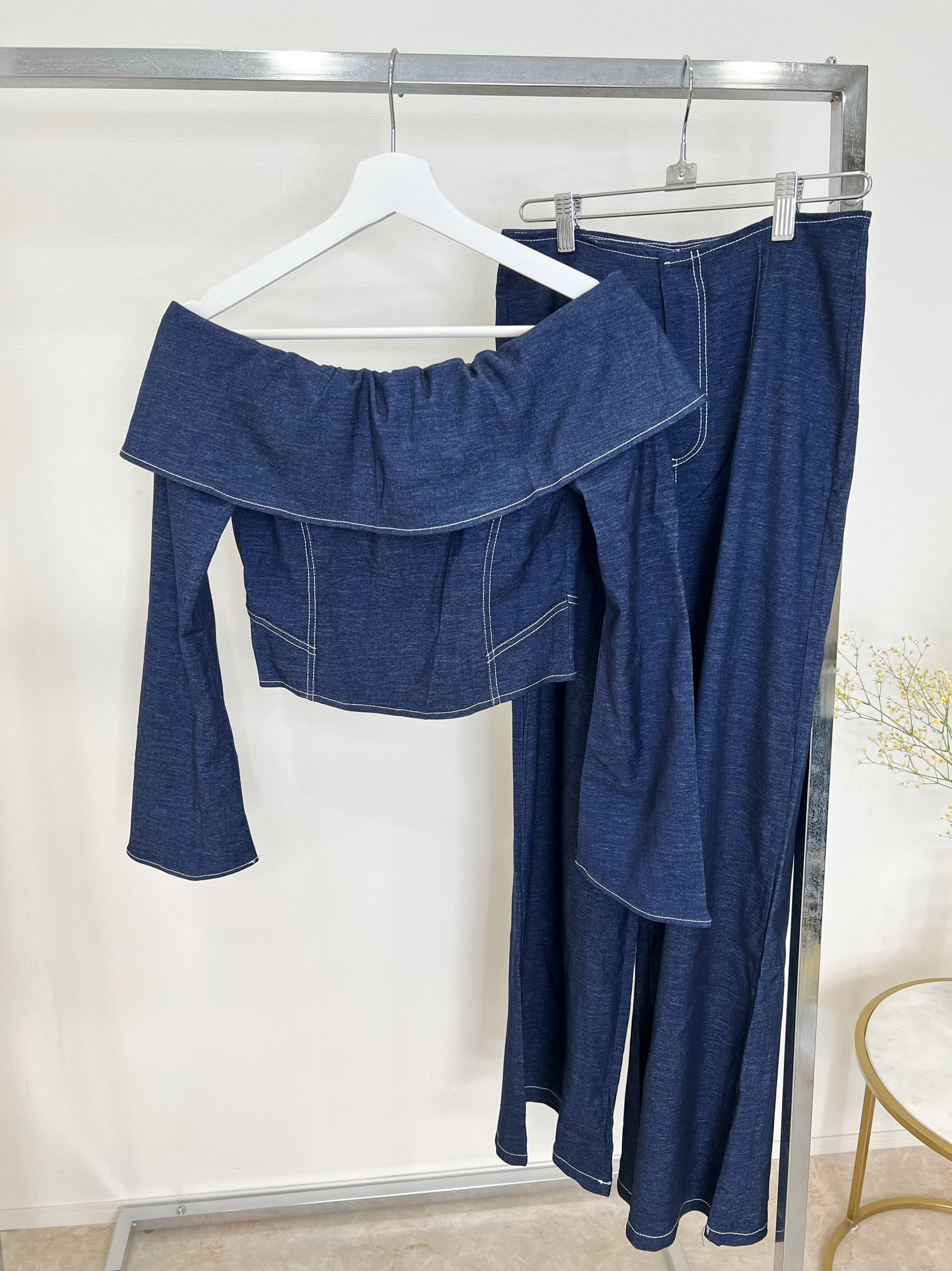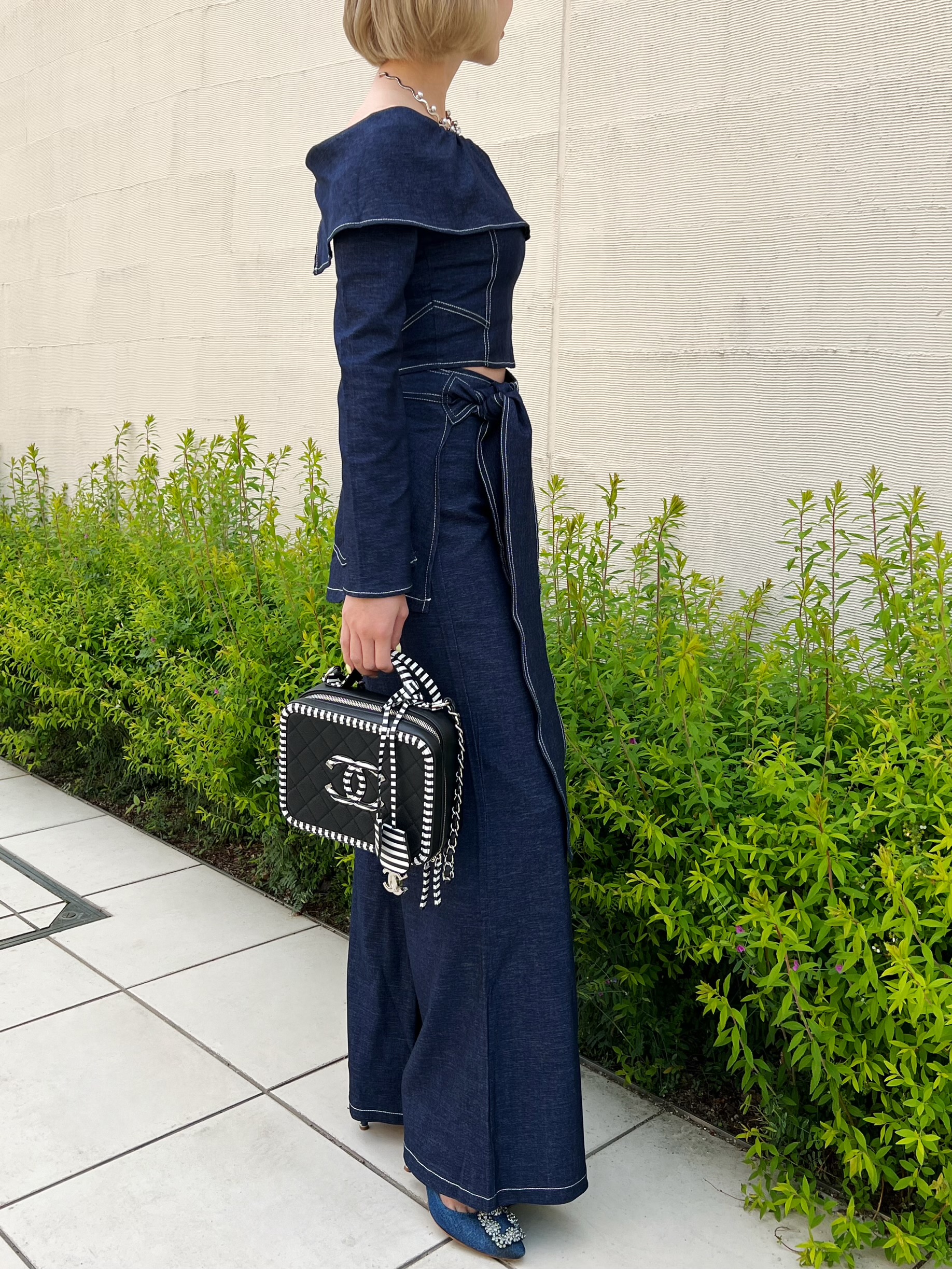 オフショルダーのデニムトップスはフリルデザインがポイント。