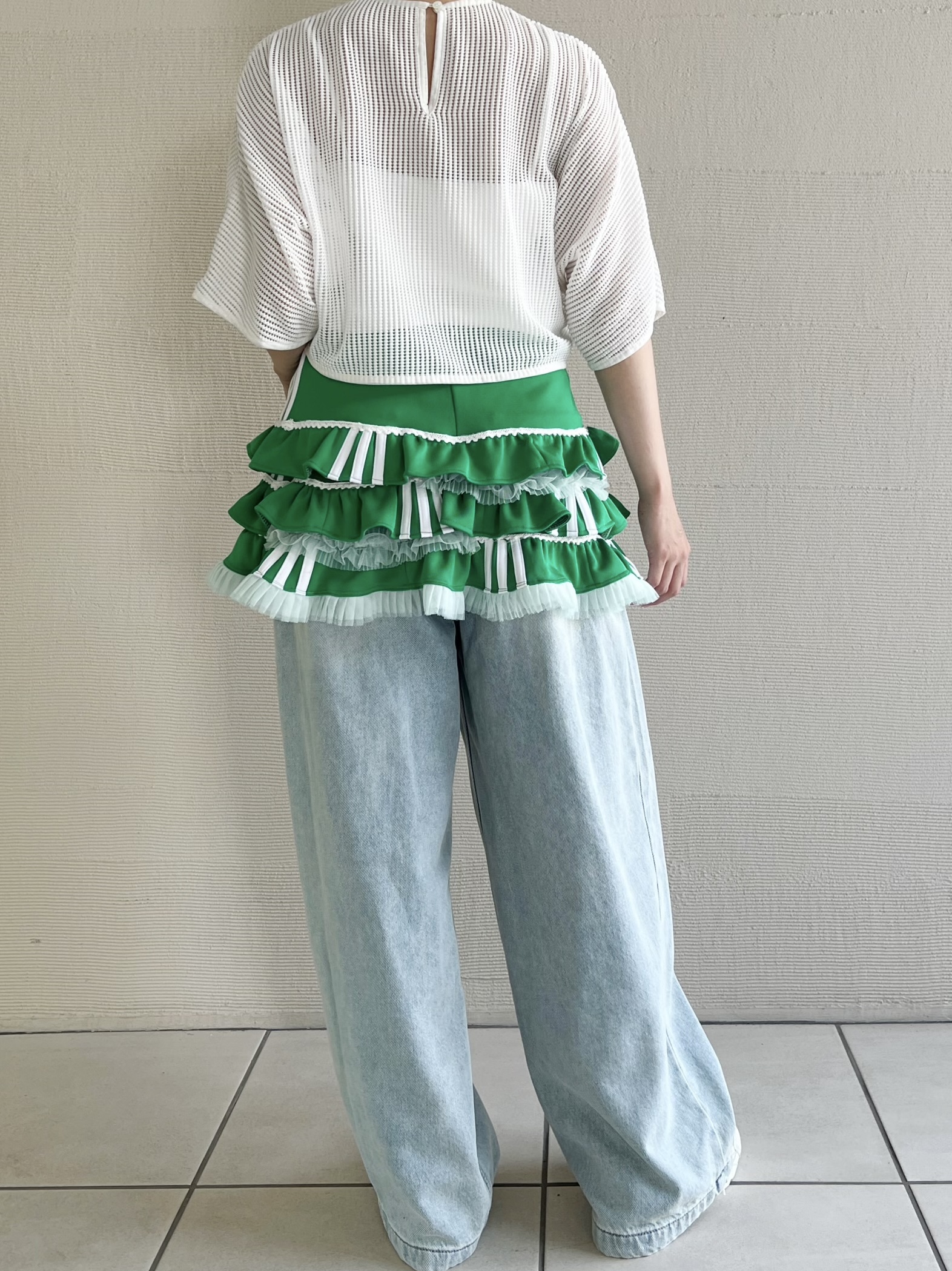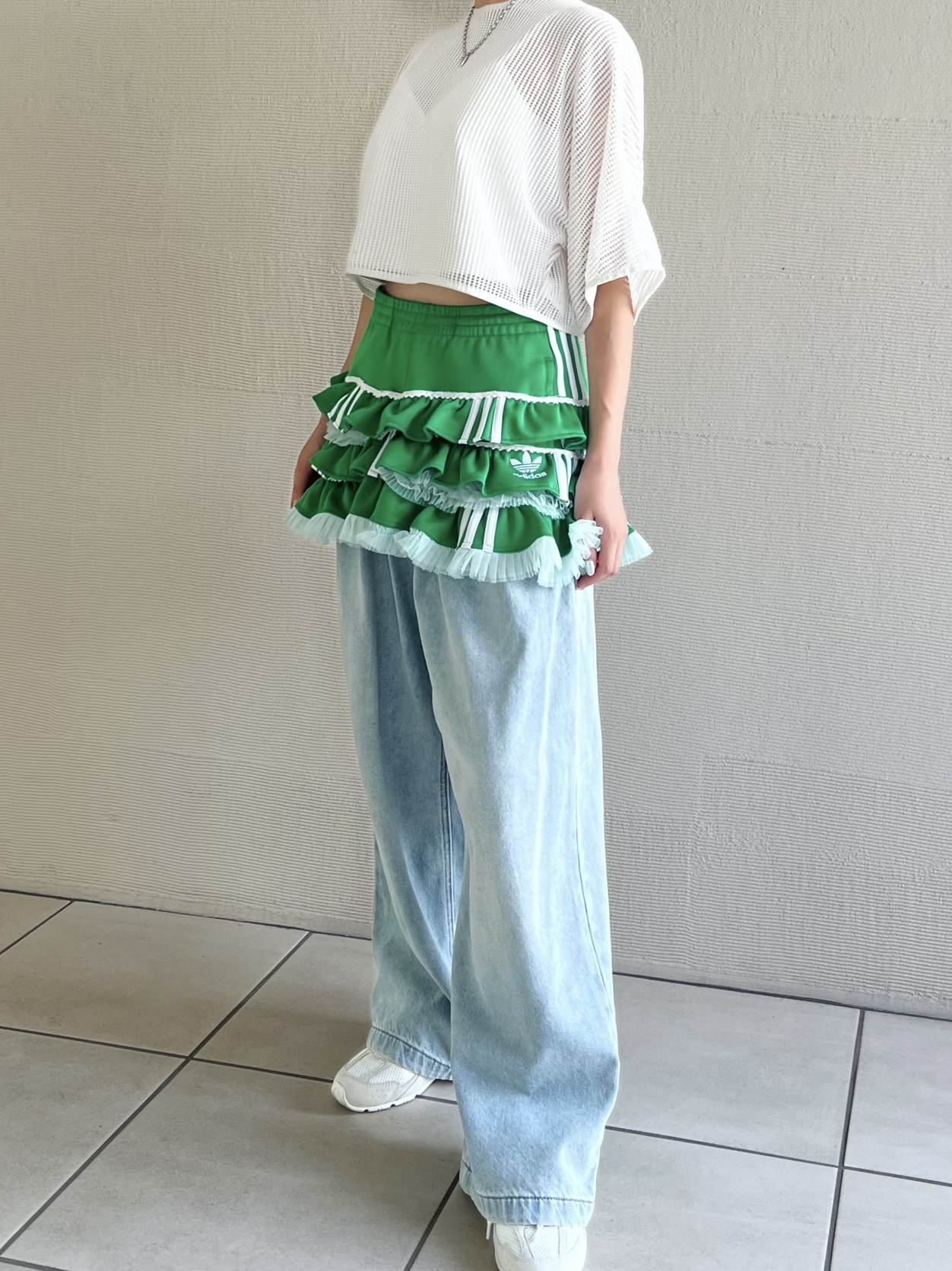 綺麗な発色のグリーンのadidasのジャージを裁断し、スカートにリメイクしました。フリルとの間にチュールとコットンフリルをレイヤードさせて甘さをプラス。ぷりっと広がるシルエットが可愛いスカートです。デニムやバイカーパンツの上にレイヤードさせたスタイリングがお勧めです。こちらは1点物のアイテムとなります。同じものは一つとして無いあなただけの一着をお届けします。※こちらの商品はUSEDの生地を使用しております。多少の汚れやほつれ等ダメージがある場合が御座います。商品特有の風合いをご理解、ご了承頂いた上でのご注文をお願い致します。返品交換は対応致しかねます。神経質な方や商品の特性をご理解、ご了承頂けない方は手に取ってご購入頂けるショップでのご購入をお願い致します。STAFF:158cm【サイズ】(平置き採寸)スカート丈33cm ウエスト34cm ヒップ46cm【素材】本体:ポリエステル87%,コットン13%■クロネコ代金後払いをご利用のお客様■商品到着後に請求書(払込用紙)が到着します。14日以内にお支払いをお願いします。全国の主要なコンビニで、請求書をレジに持っていくだけでお支払いが可能です。全国の郵便局でも同じ請求書でお支払いできます。※ご請求書が圧着ハガキタイプの場合、郵便局でのお支払いはできません。※弊社の銀行口座宛にお振込頂くものでは御座いません。ご注意下さい。