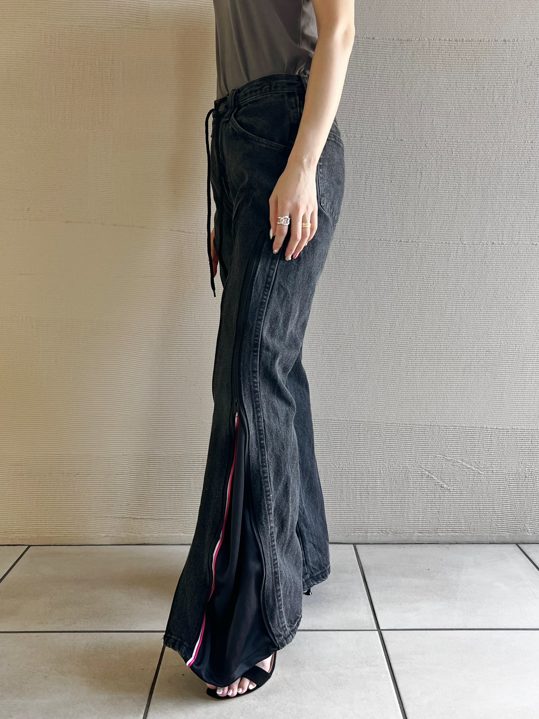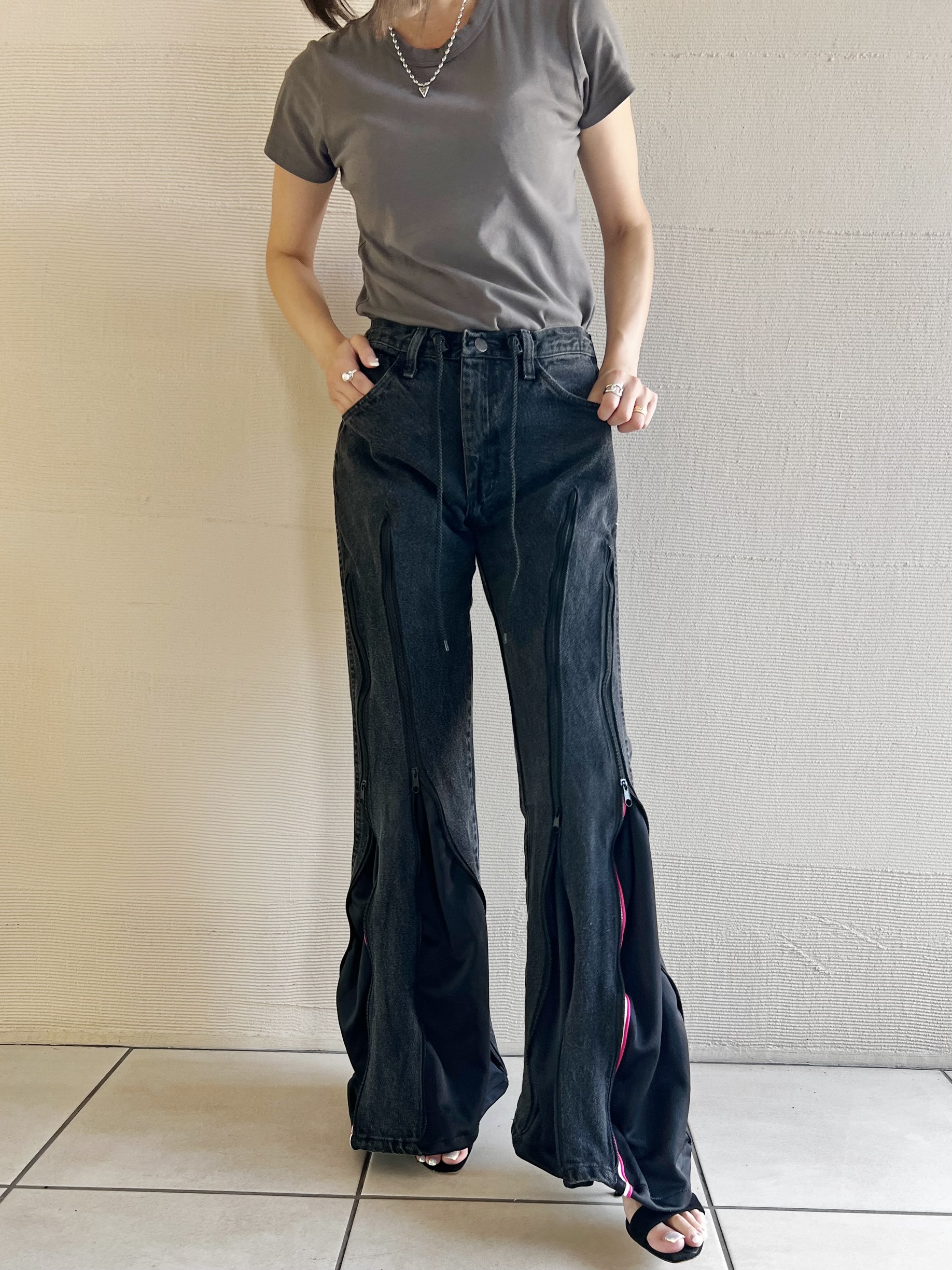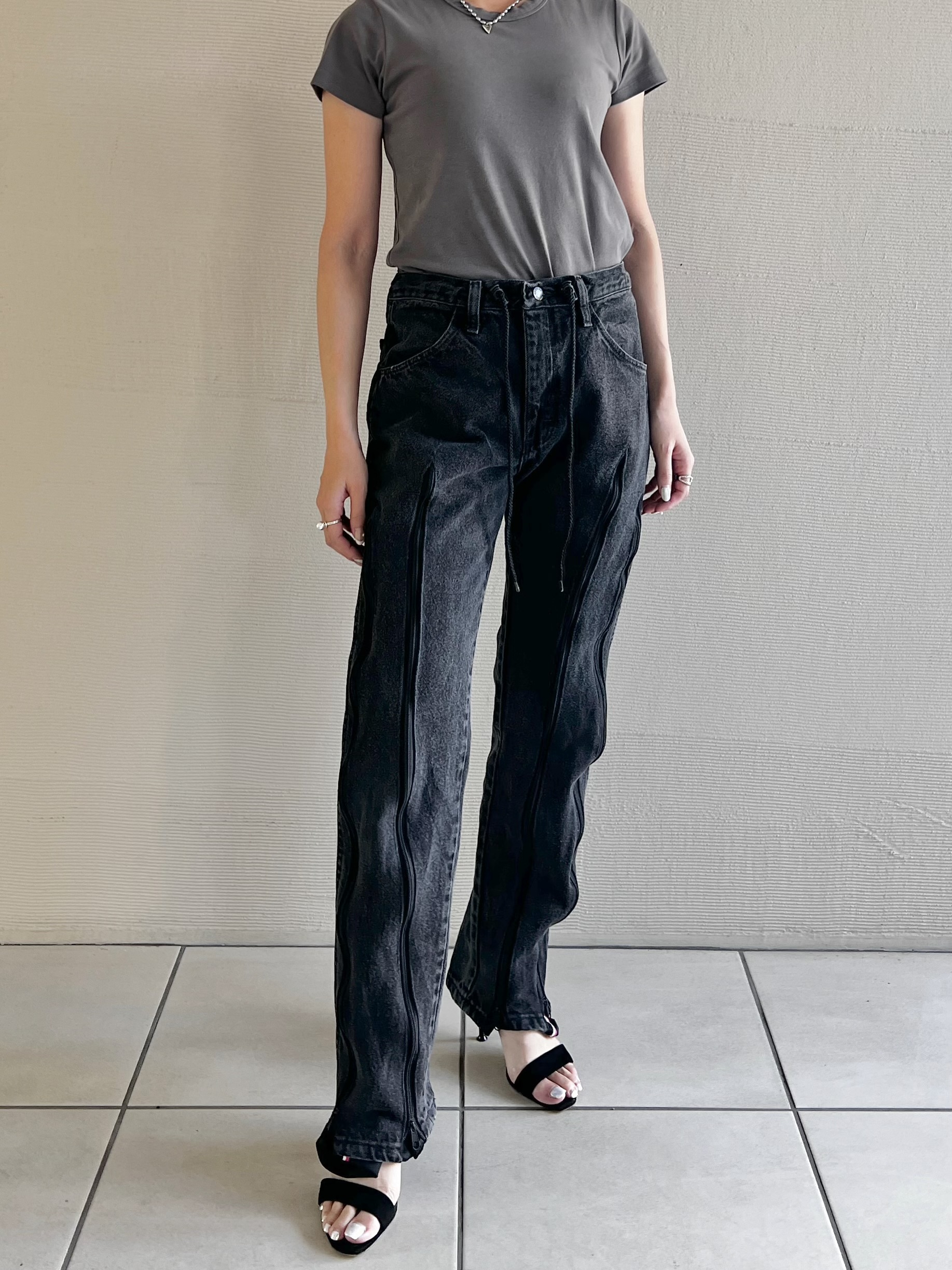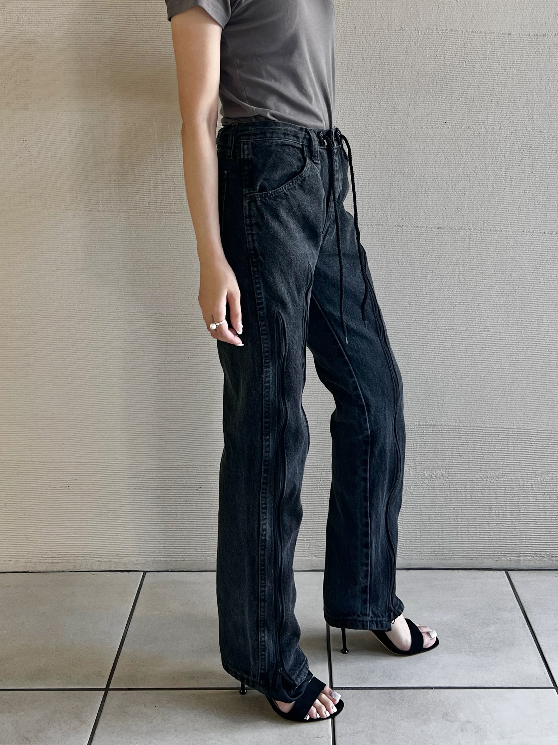 ファスナーの下げ具合でシルエットを変えて履いて頂けます。