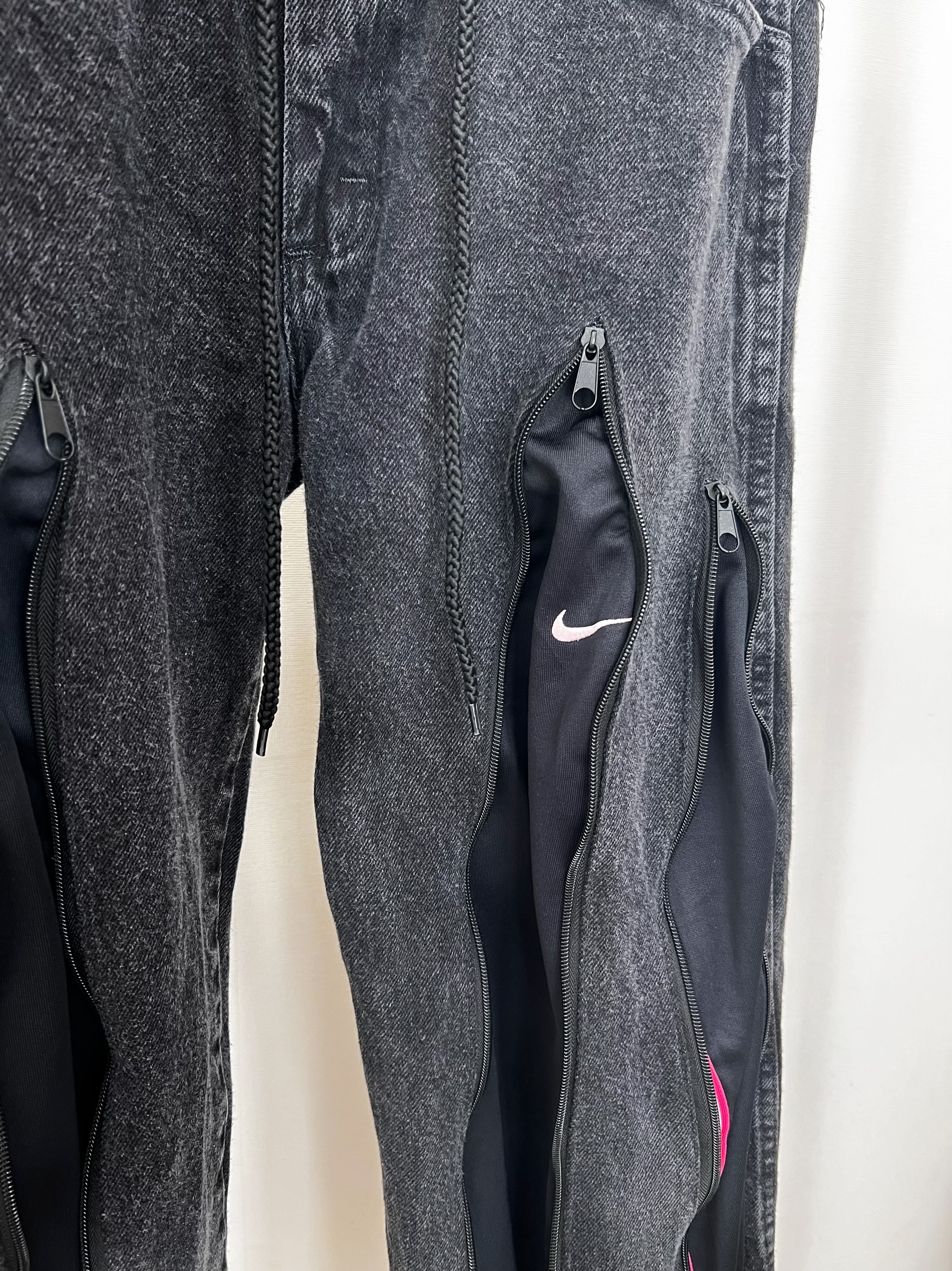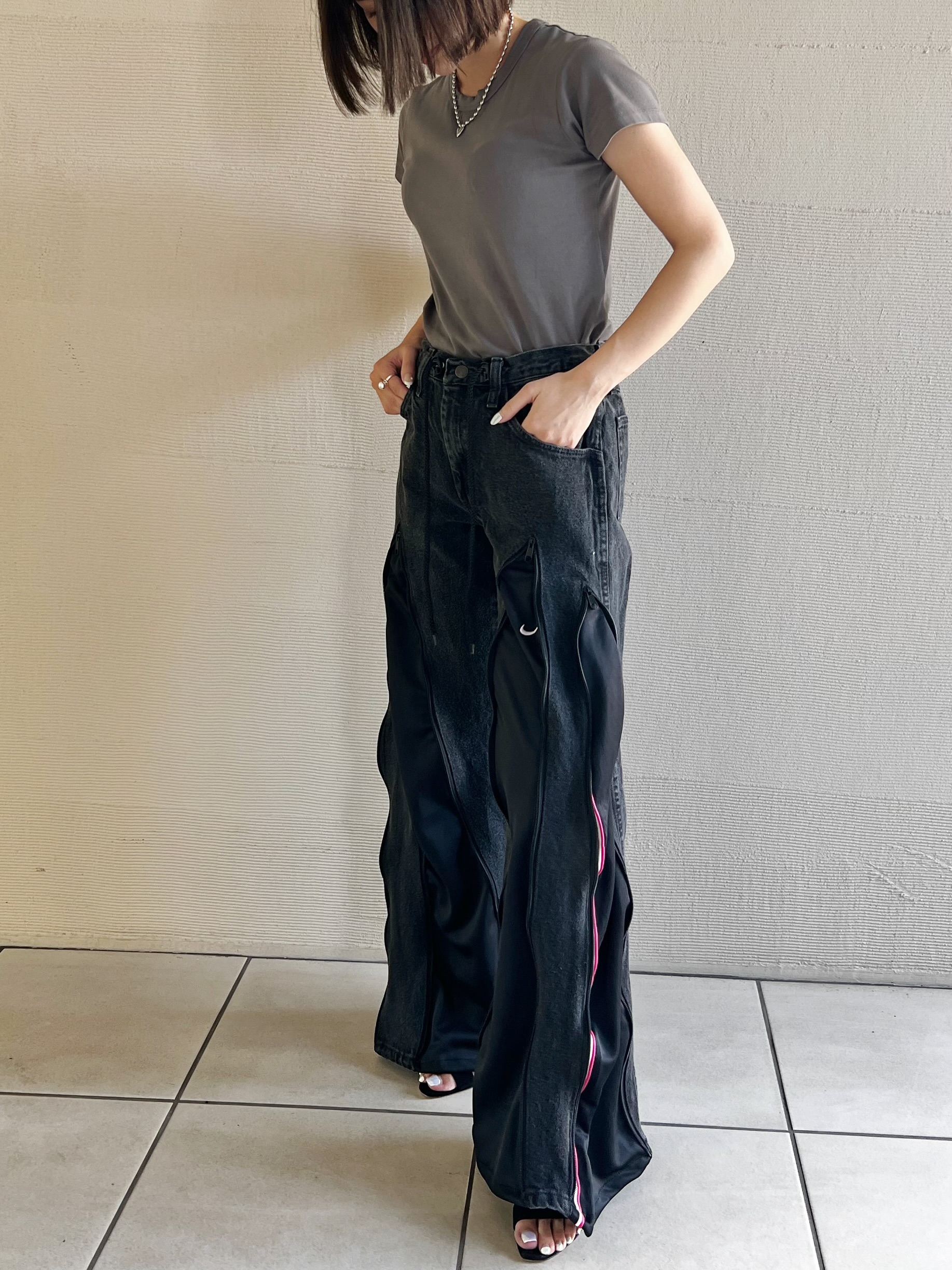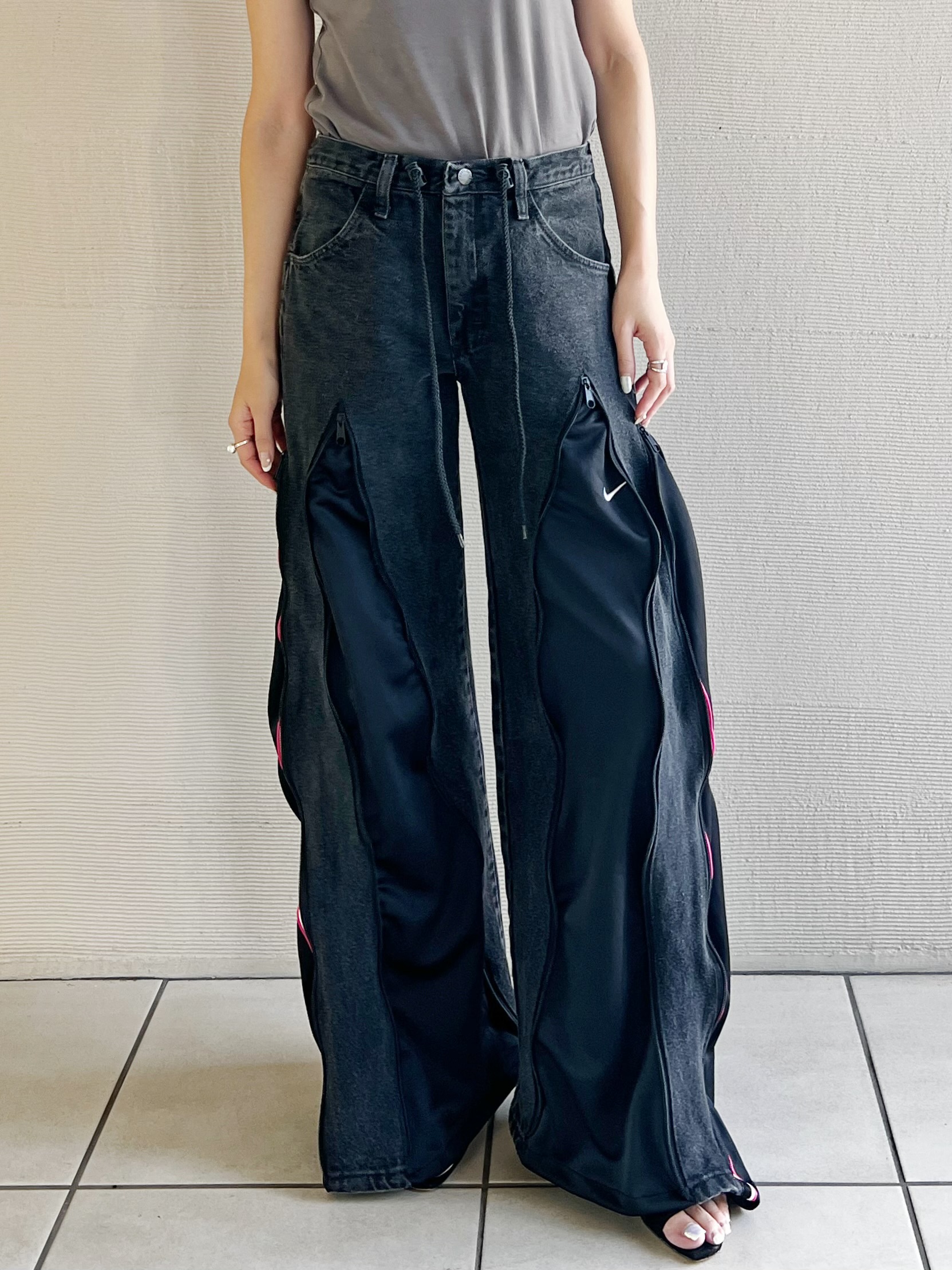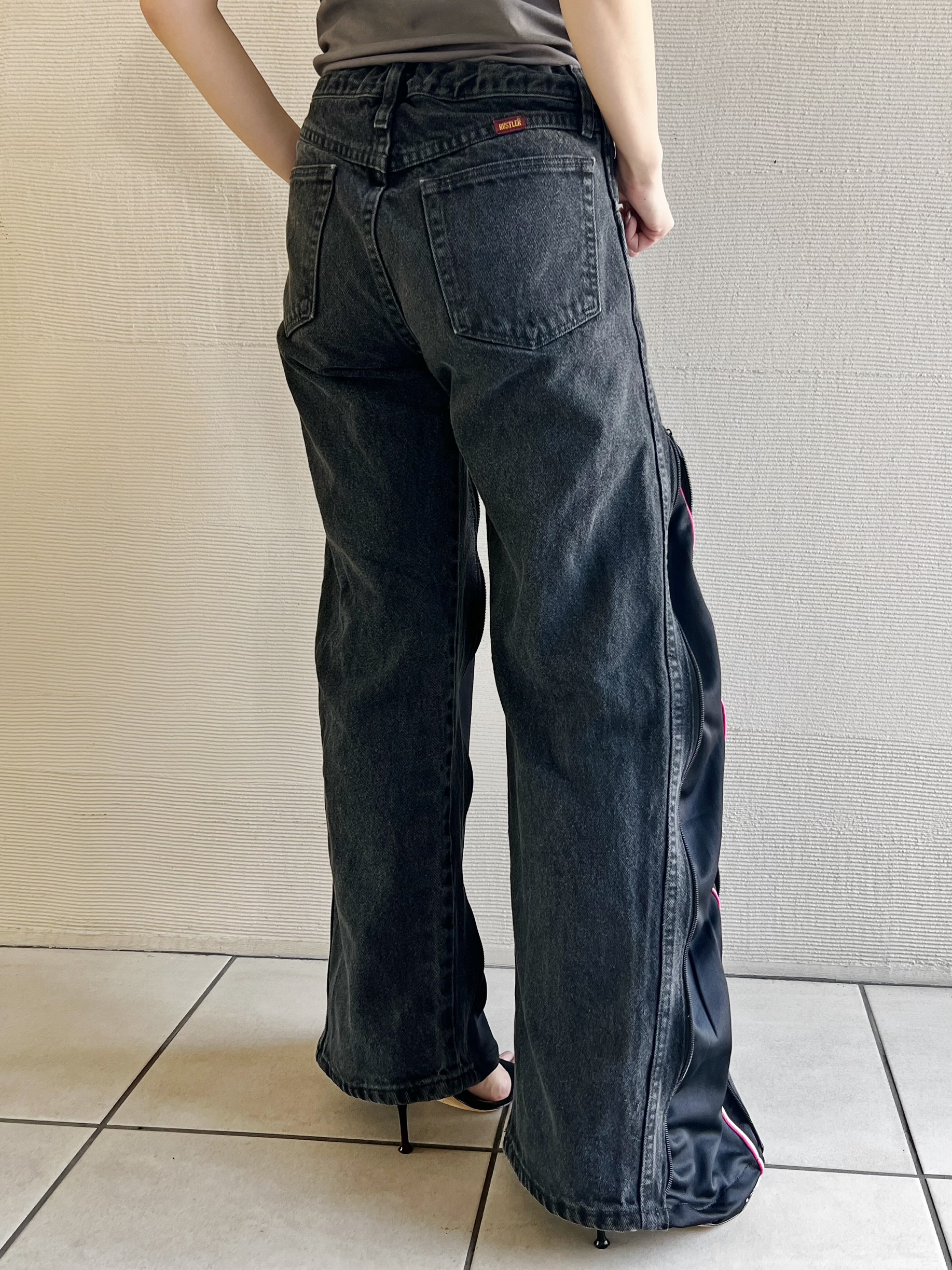 WranglerのサブレーベルRUSTLERのブラックデニムにNIKEのジャージを組合せたリメイクデニム。