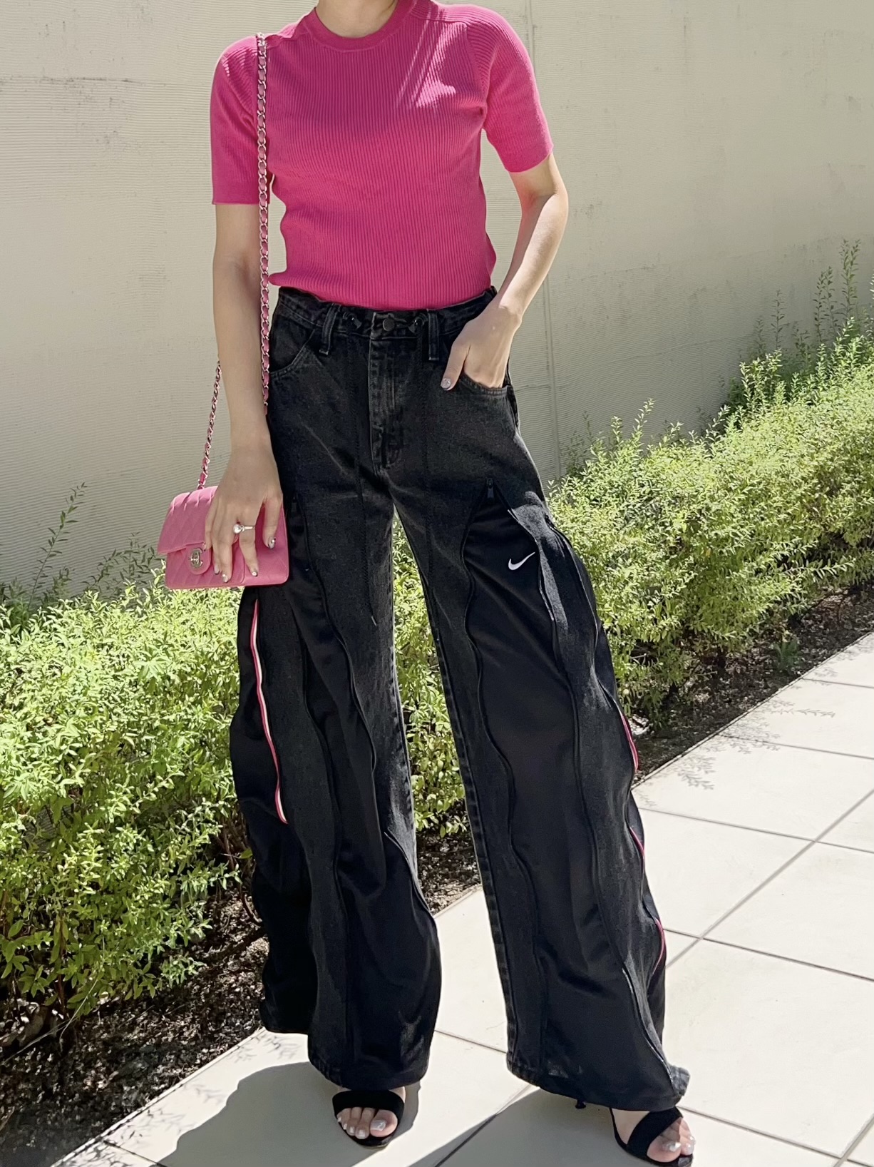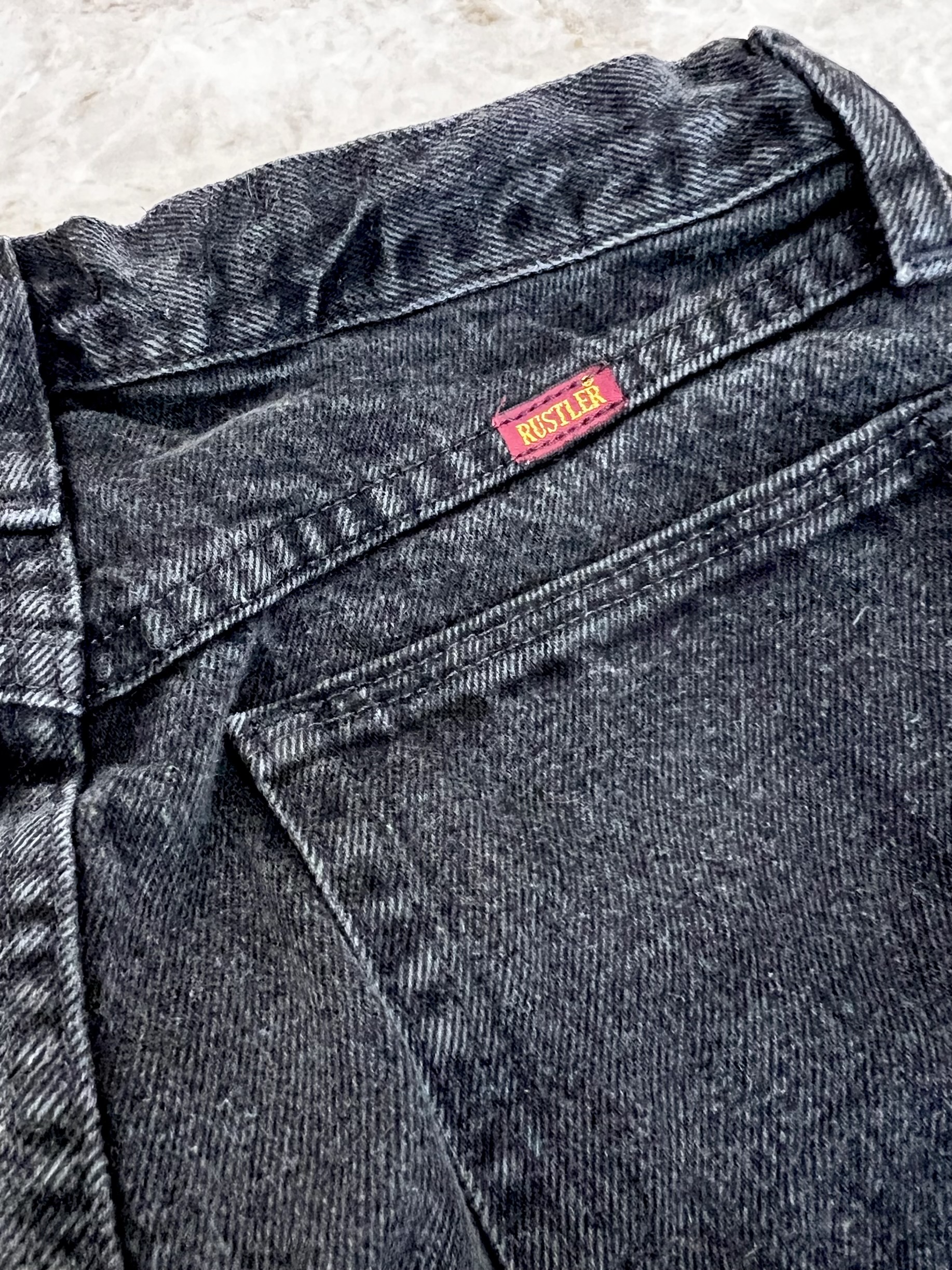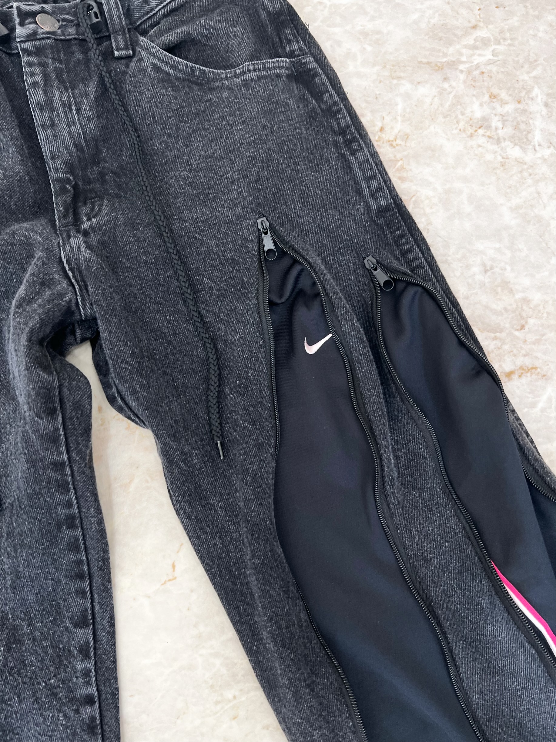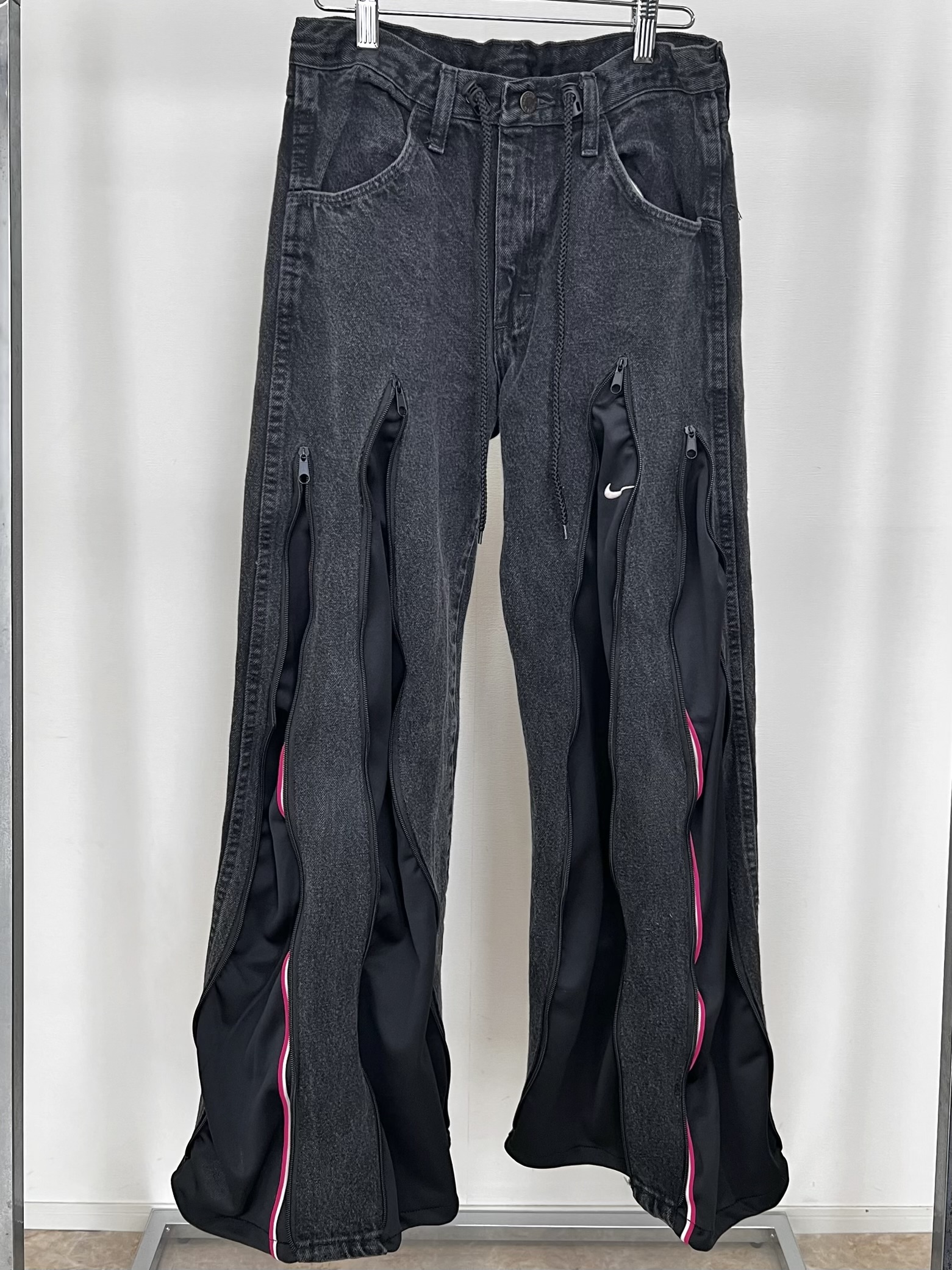 WranglerのサブレーベルRUSTLERのブラックデニムにNIKEのジャージを組合せたリメイクデニム。