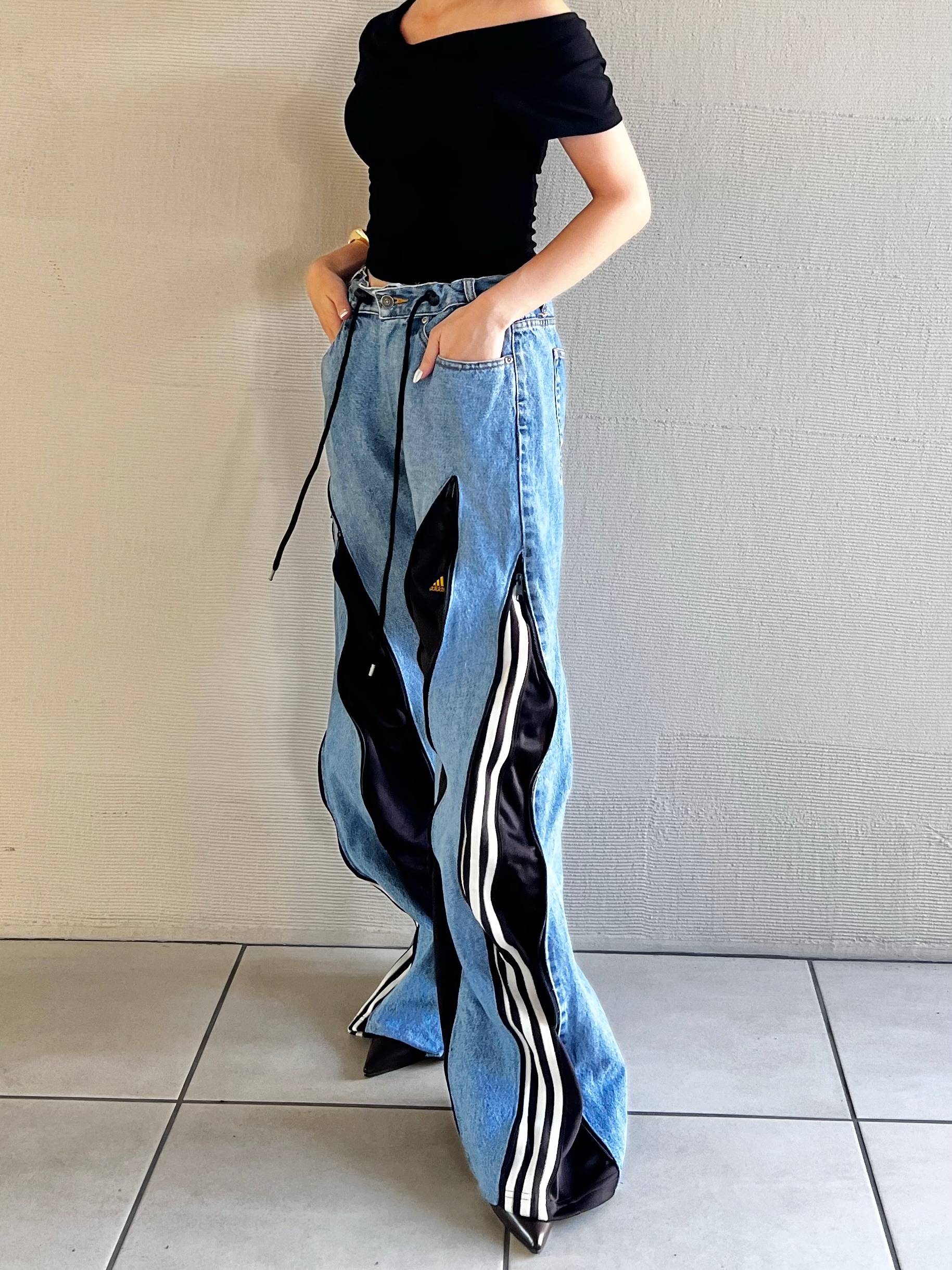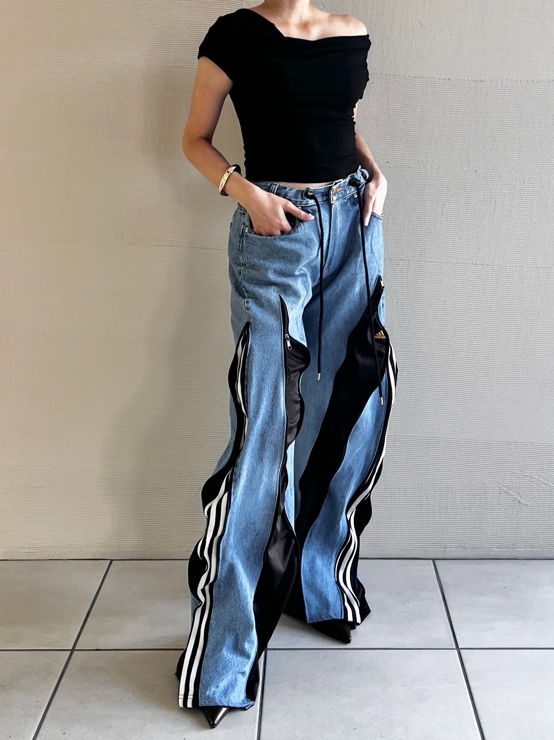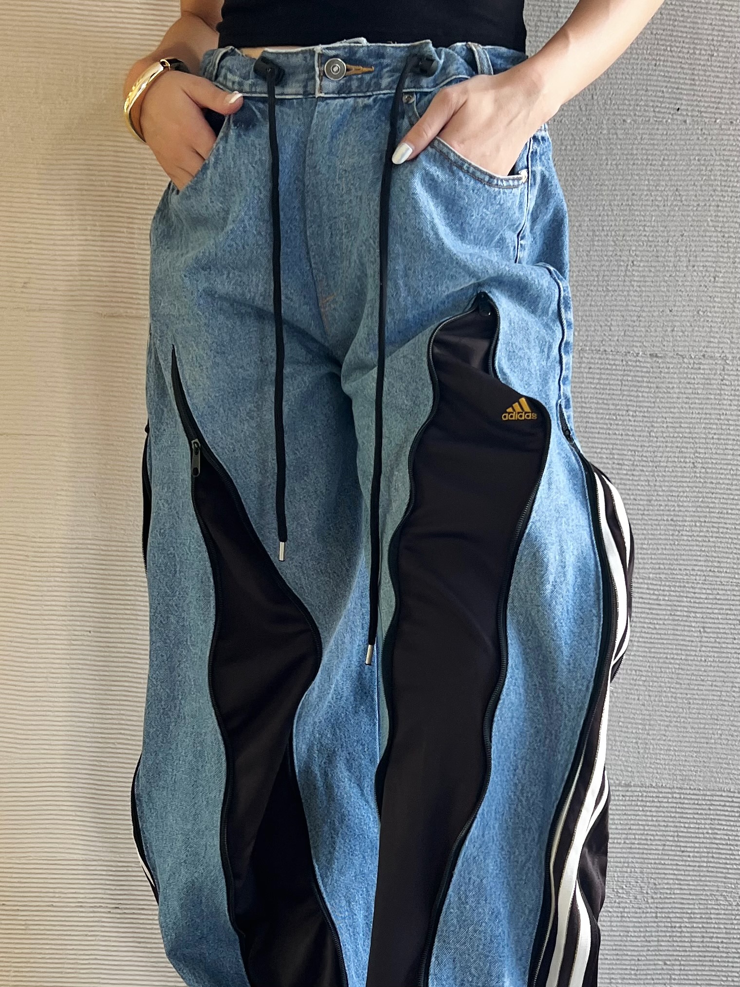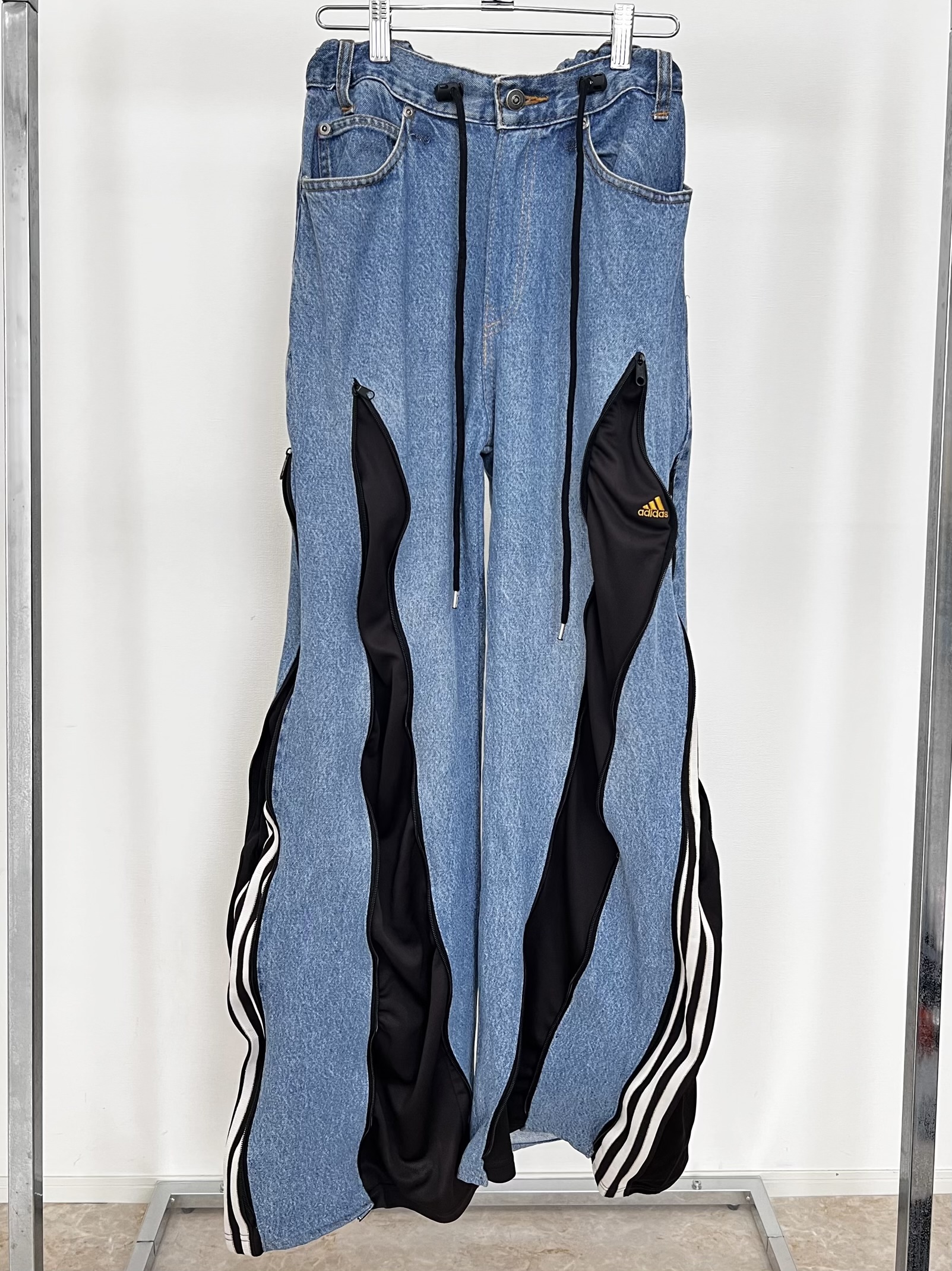 デニムにadidasのジャージを組合せたリメイクデニム。