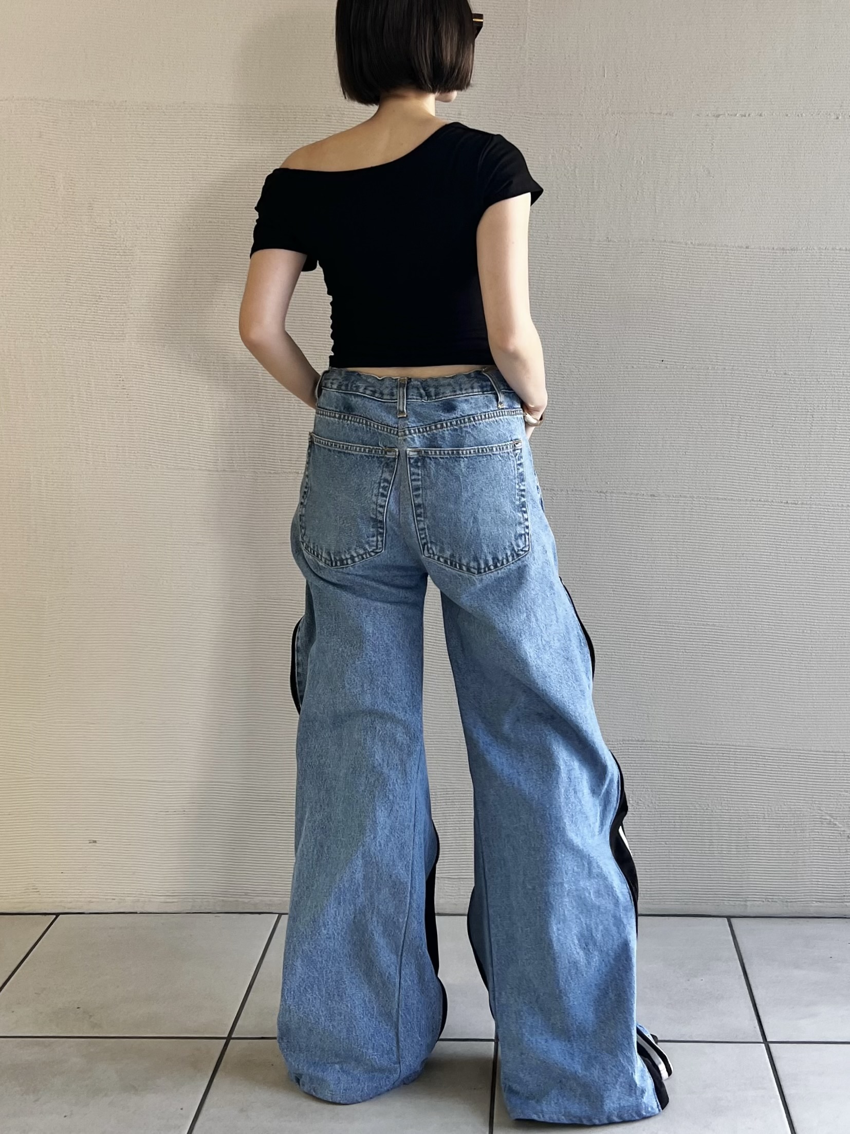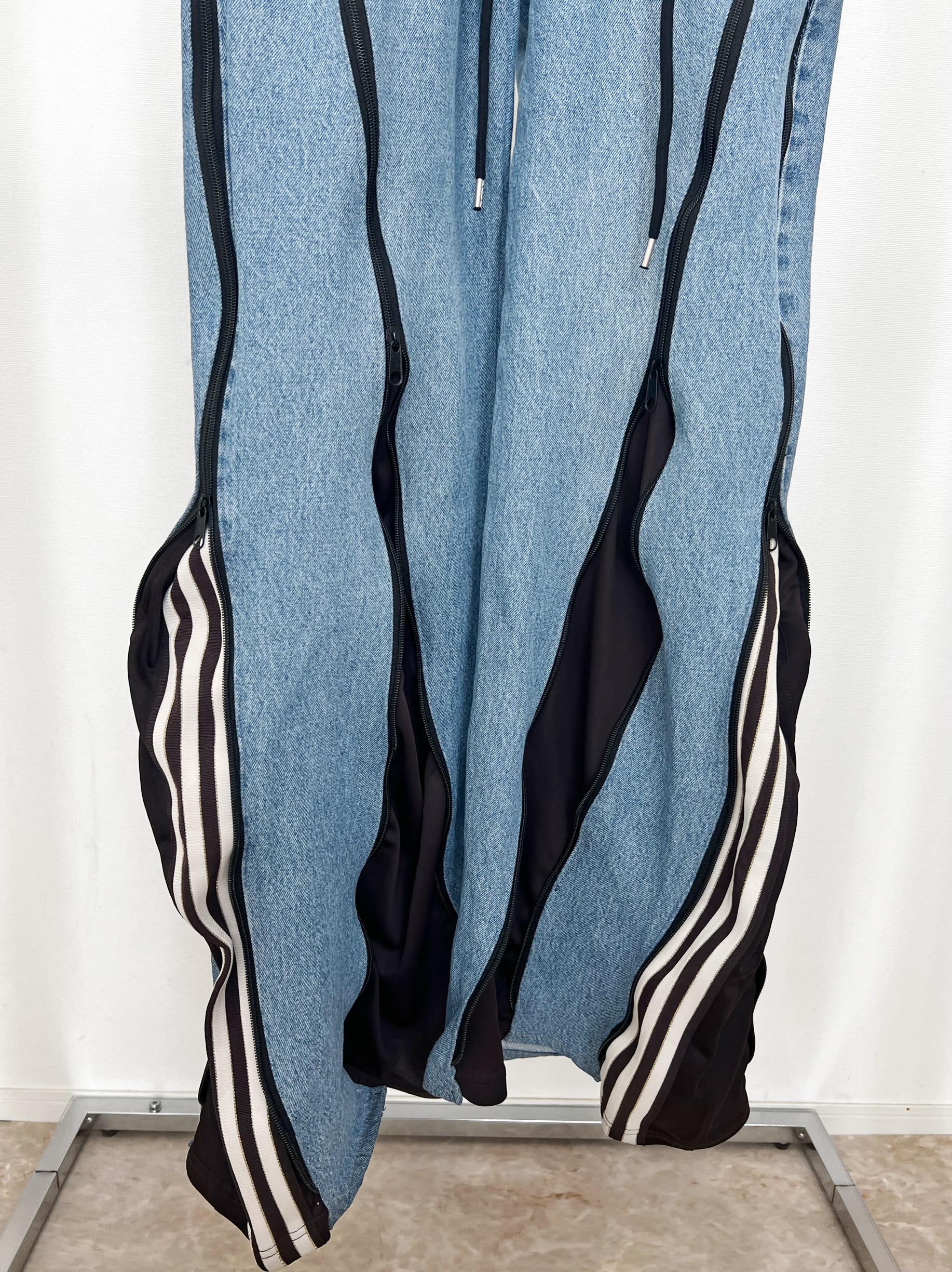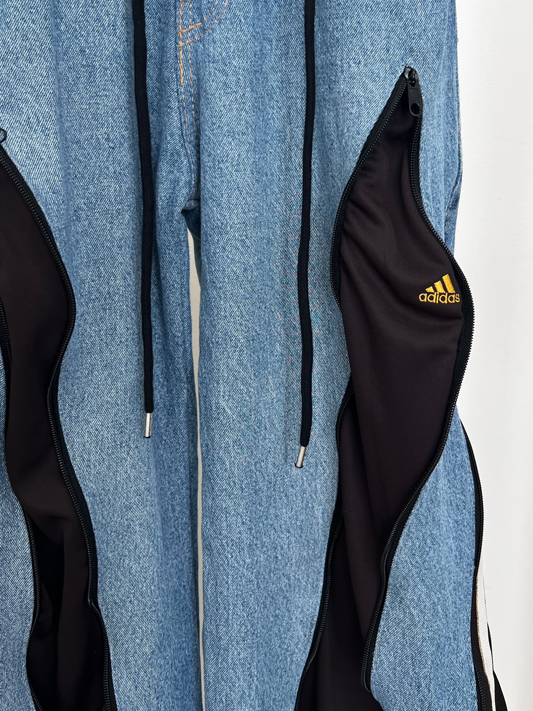 デニムにadidasのジャージを組合せたリメイクデニム。