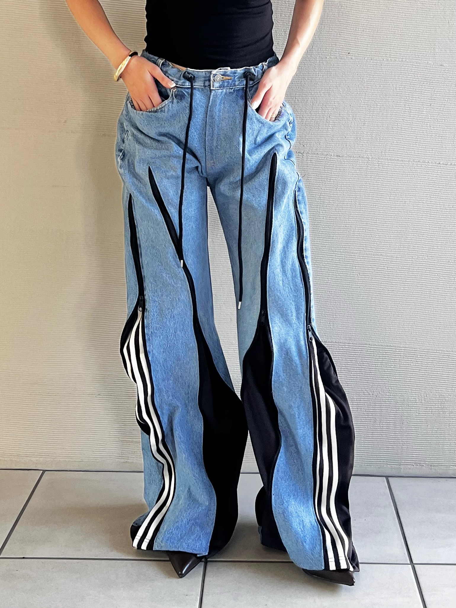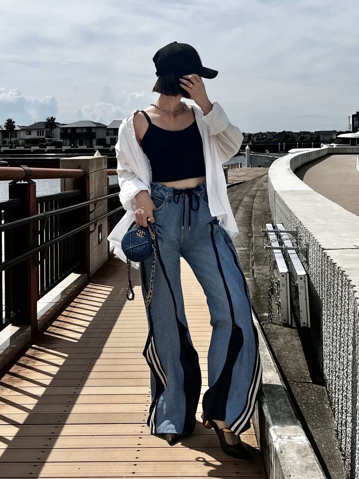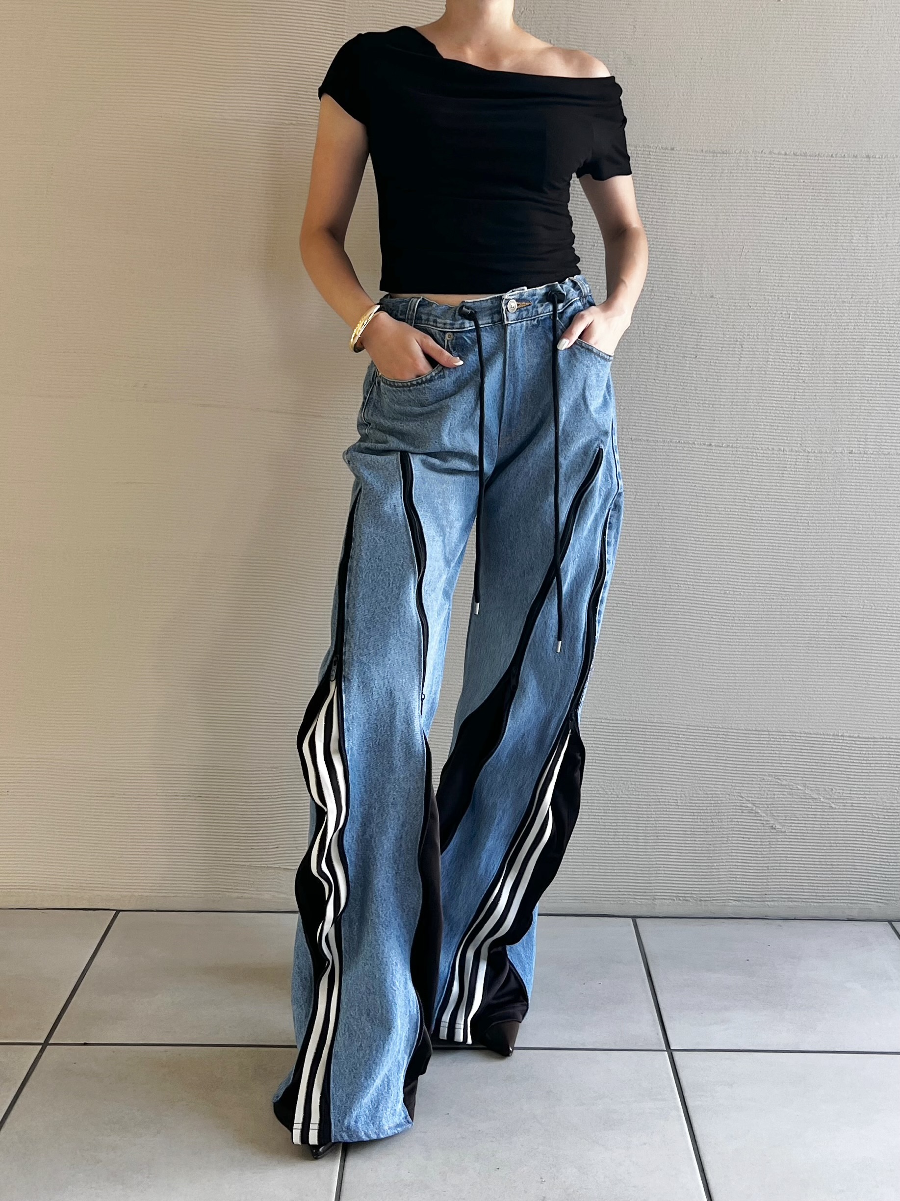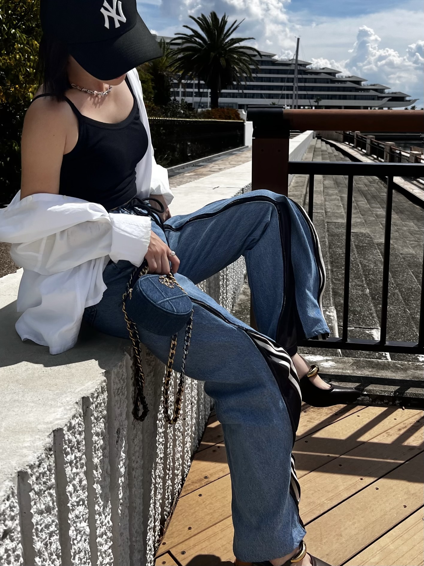 デニムにadidasのジャージを組合せたリメイクデニム。