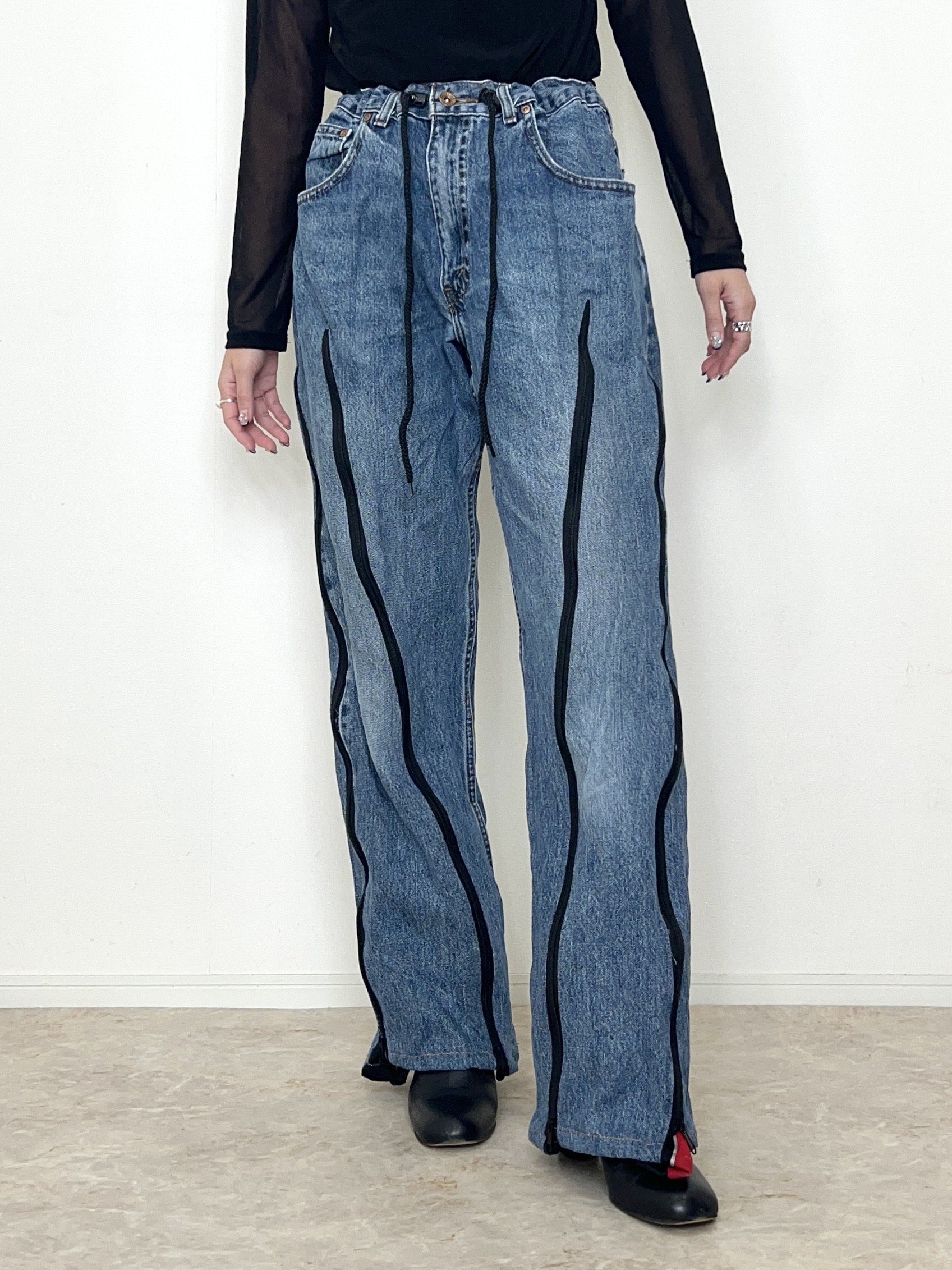 HOUSE OF VINTAGEが新たにスタート。 ヴィンテージデニムなどを用いてリメイクした全て1点物のアイテムを展開。 柄の出方やデニムの色落ちなど、同じものは一つとして無いあなただけの一着をお届けします。 米大手百貨店チェーンJ.C.PennyのプライベートブランドARIZONA JEAN COMPANYのデニムにNIKEのジャージを組合せたリメイクデニム。 ファスナーを全て閉じると綺麗目に、全て開けると裾に向かって広がるフレアシルエットに。 ドローコードでサイズ調節可能。 ファスナーの下げ具合でシルエットを変えて履いて頂けます。