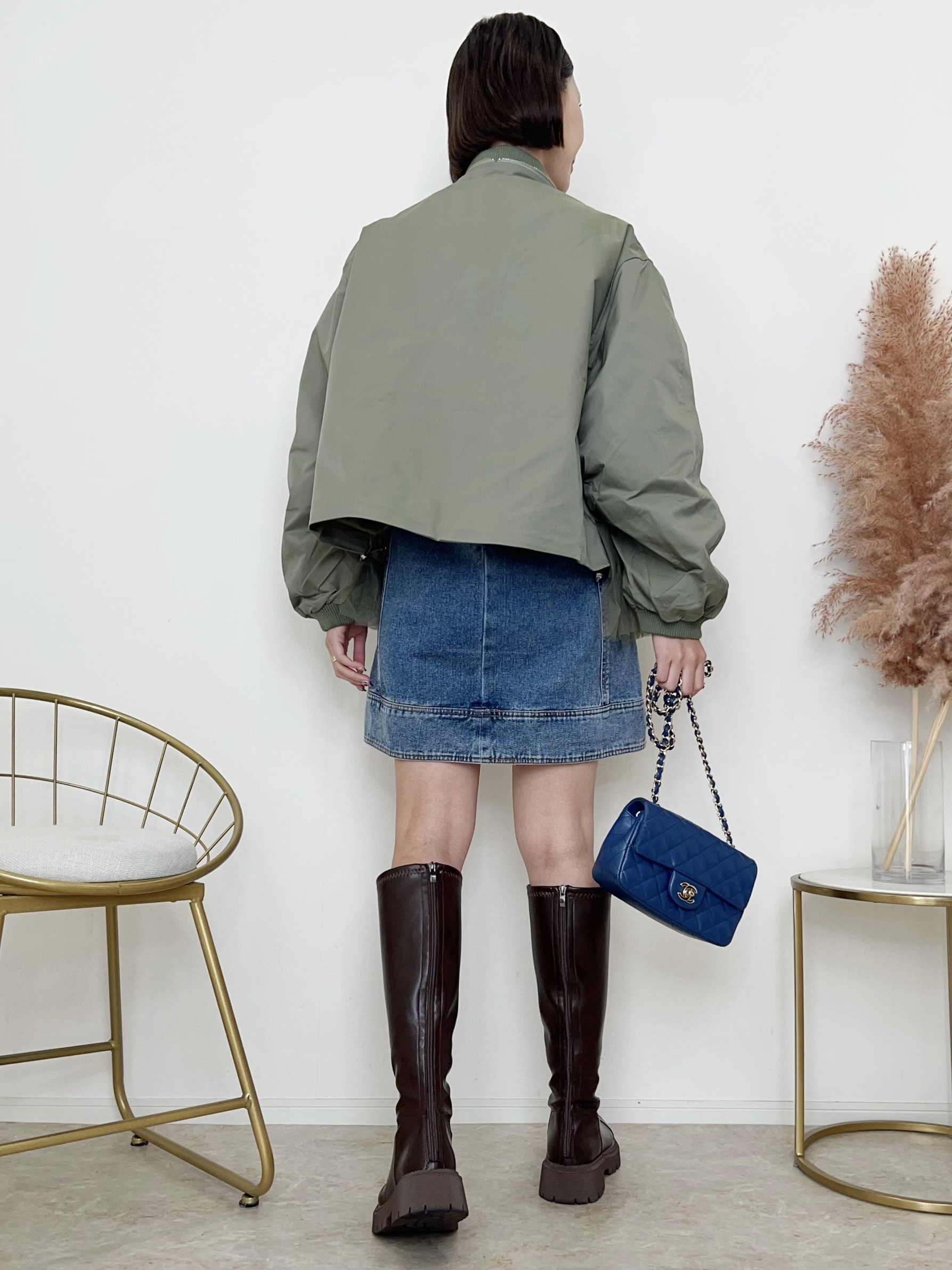 カジュアルなデニム切替のブルゾンに裾のチュールで女性らしさをプラス。