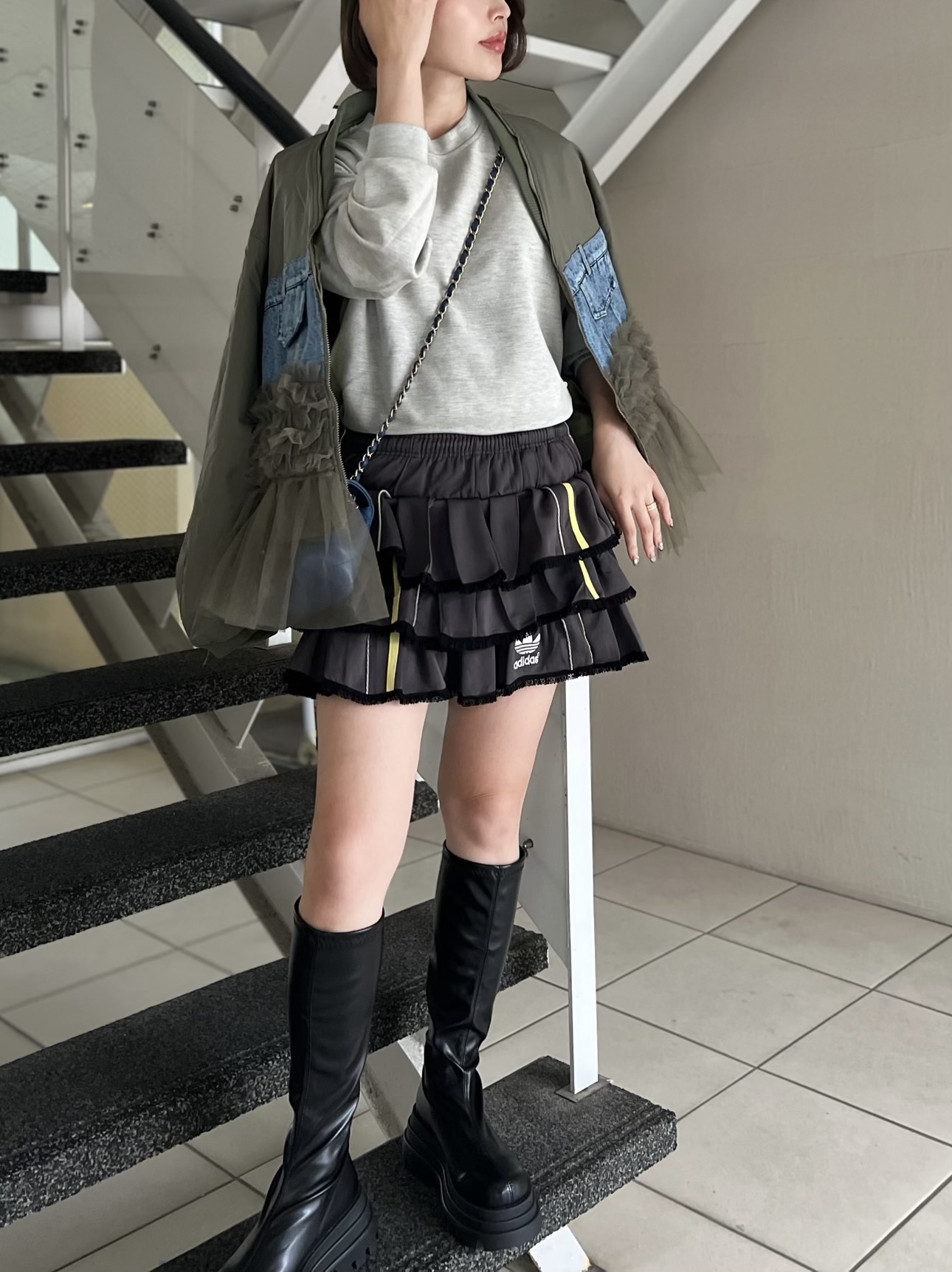 ダークグレーとブラウンの中間色のような秋冬にぴったりなadidasのジャージを裁断し、スカートにリメイクしました。フリルにコットンフリルを載せて少し甘さをプラス。ふわっと広がるシルエットが可愛いスカートです。ウエスト部分はゴムなので腰履きしても。1枚はもちろん、デニムやバイカーパンツの上にレイヤードさせたスタイリングもお勧めです。こちらは1点物のアイテムとなります。同じものは一つとして無いあなただけの一着をお届けします。※こちらの商品はUSEDの生地を使用しております。多少の汚れやほつれ等ダメージがある場合が御座います。商品特有の風合いをご理解、ご了承頂いた上でのご注文をお願い致します。返品交換は対応致しかねます。神経質な方や商品の特性をご理解、ご了承頂けない方は手に取ってご購入頂けるショップでのご購入をお願い致します。STAFF:158cm【サイズ】(平置き採寸)スカート丈34.5cm ウエスト32cm(ゴムの為伸縮) ヒップ43cm【素材】本体:ポリエステル87%,コットン13%■クロネコ代金後払いをご利用のお客様■商品到着後に請求書(払込用紙)が到着します。14日以内にお支払いをお願いします。全国の主要なコンビニで、請求書をレジに持っていくだけでお支払いが可能です。全国の郵便局でも同じ請求書でお支払いできます。※ご請求書が圧着ハガキタイプの場合、郵便局でのお支払いはできません。※弊社の銀行口座宛にお振込頂くものでは御座いません。ご注意下さい。