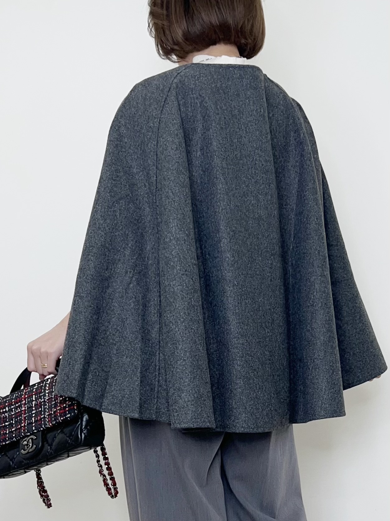 上品でエレガントな雰囲気漂うケープジャケット。Aラインシルエットで体型カバーも叶えてくれる一着です。タートルニットや、ノーカラーのレザージャケットにレイヤードさせても。厚手ニットの上にもさらっと羽織れます。カラーはシックでこなれ感を演出するダークグレー。フロントホック付き。着回しの効く一枚あると便利な万能アウターです。 STAFF:158cm【サイズ】(平置き採寸)着丈71cm 身幅70cm 【素材】ポリエステル100%■クロネコ代金後払いをご利用のお客様■商品到着後に請求書(払込用紙)が到着します。14日以内にお支払いをお願いします。全国の主要なコンビニで、請求書をレジに持っていくだけでお支払いが可能です。全国の郵便局でも同じ請求書でお支払いできます。※ご請求書が圧着ハガキタイプの場合、郵便局でのお支払いはできません。※弊社の銀行口座宛にお振込頂くものでは御座いません。ご注意下さい。