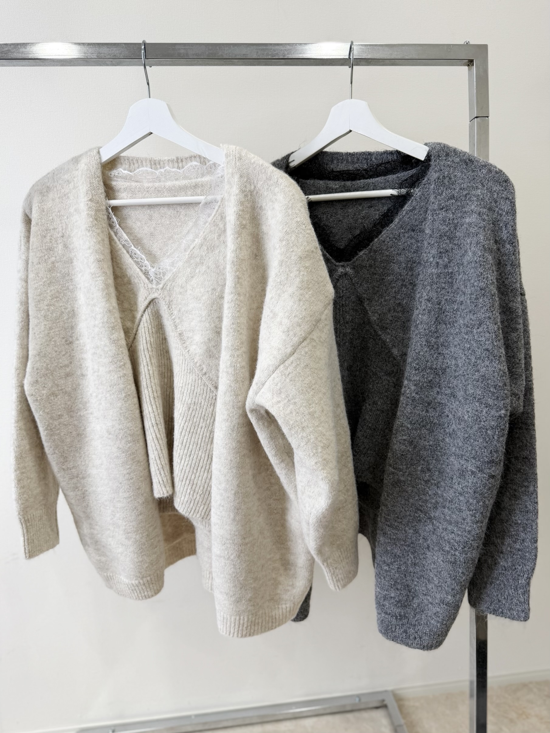 ゆるっとしたシルエットのカーディガンとレースがあしらわれたVネックトップスがセットになったニットアンサンブル。