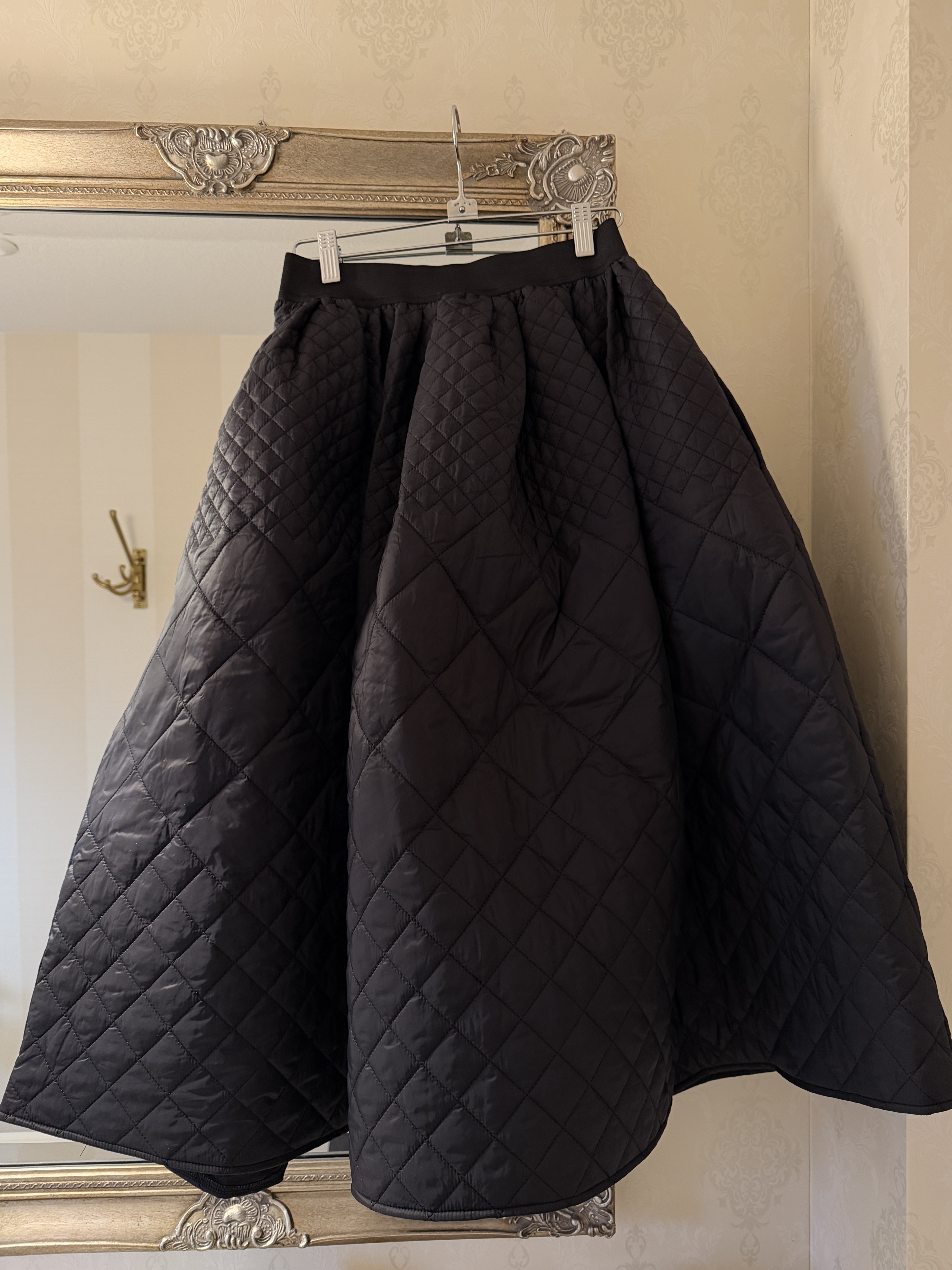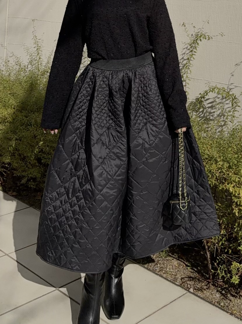 ふんわり広がるシルエットで360°素敵にキマるキルティングフレアスカート。