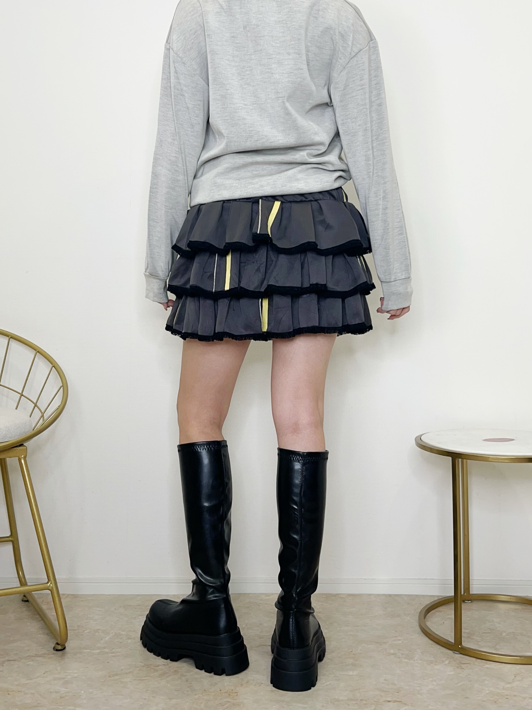 ダークグレーとブラウンの中間色のような秋冬にぴったりなadidasのジャージを裁断し、スカートにリメイクしました。フリルにコットンフリルを載せて少し甘さをプラス。ふわっと広がるシルエットが可愛いスカートです。ウエスト部分はゴムなので腰履きしても。1枚はもちろん、デニムやバイカーパンツの上にレイヤードさせたスタイリングもお勧めです。こちらは1点物のアイテムとなります。同じものは一つとして無いあなただけの一着をお届けします。※こちらの商品はUSEDの生地を使用しております。多少の汚れやほつれ等ダメージがある場合が御座います。商品特有の風合いをご理解、ご了承頂いた上でのご注文をお願い致します。返品交換は対応致しかねます。神経質な方や商品の特性をご理解、ご了承頂けない方は手に取ってご購入頂けるショップでのご購入をお願い致します。STAFF:158cm【サイズ】(平置き採寸)スカート丈34.5cm ウエスト32cm(ゴムの為伸縮) ヒップ43cm【素材】本体:ポリエステル87%,コットン13%■クロネコ代金後払いをご利用のお客様■商品到着後に請求書(払込用紙)が到着します。14日以内にお支払いをお願いします。全国の主要なコンビニで、請求書をレジに持っていくだけでお支払いが可能です。全国の郵便局でも同じ請求書でお支払いできます。※ご請求書が圧着ハガキタイプの場合、郵便局でのお支払いはできません。※弊社の銀行口座宛にお振込頂くものでは御座いません。ご注意下さい。
