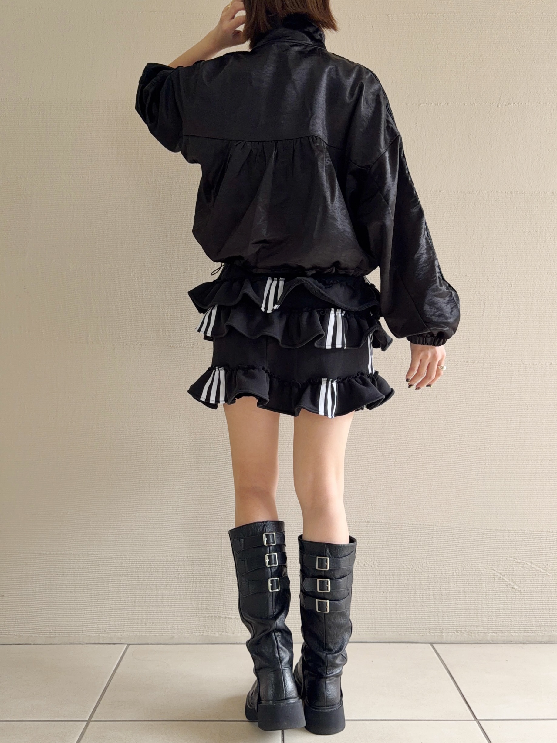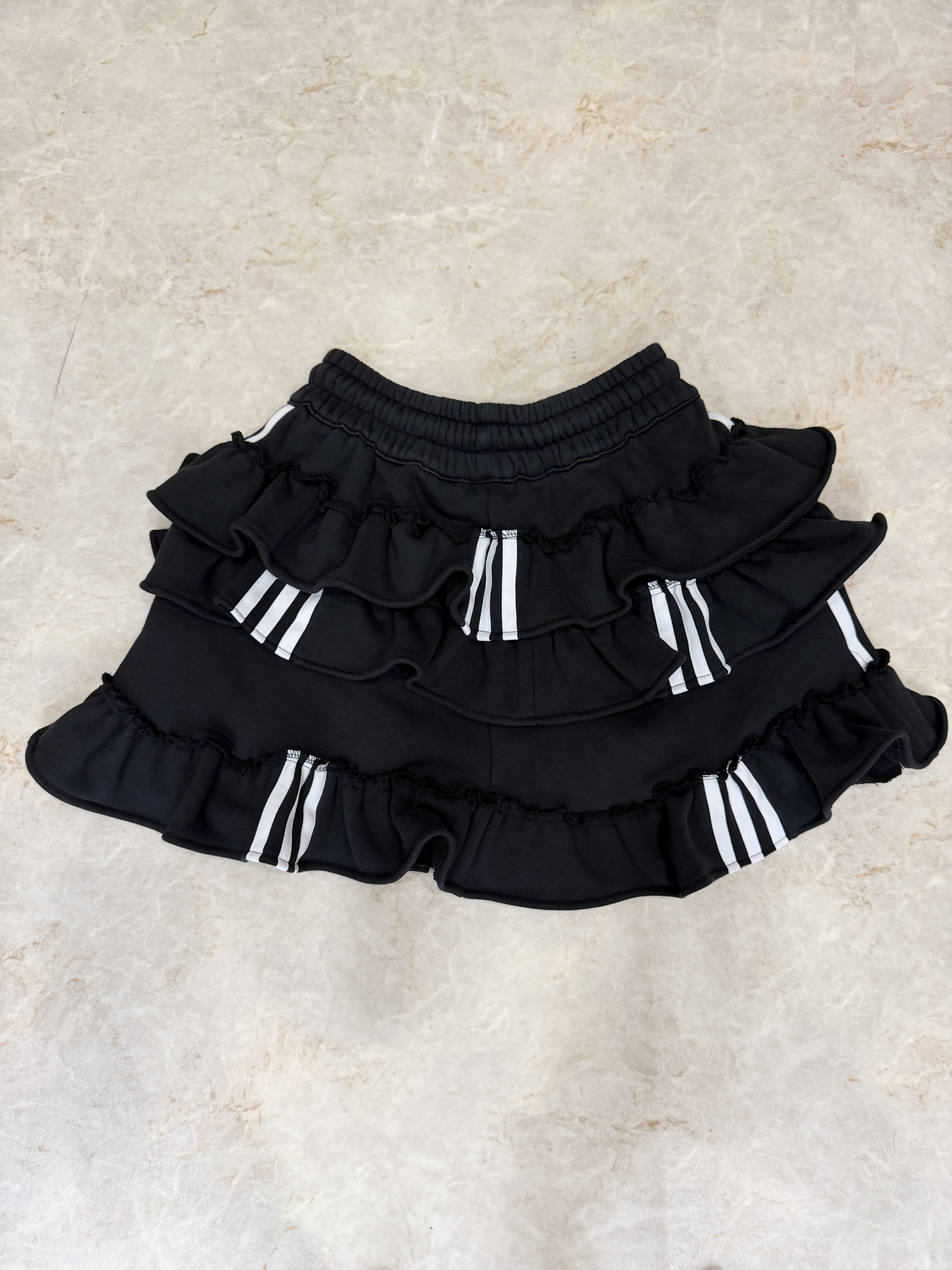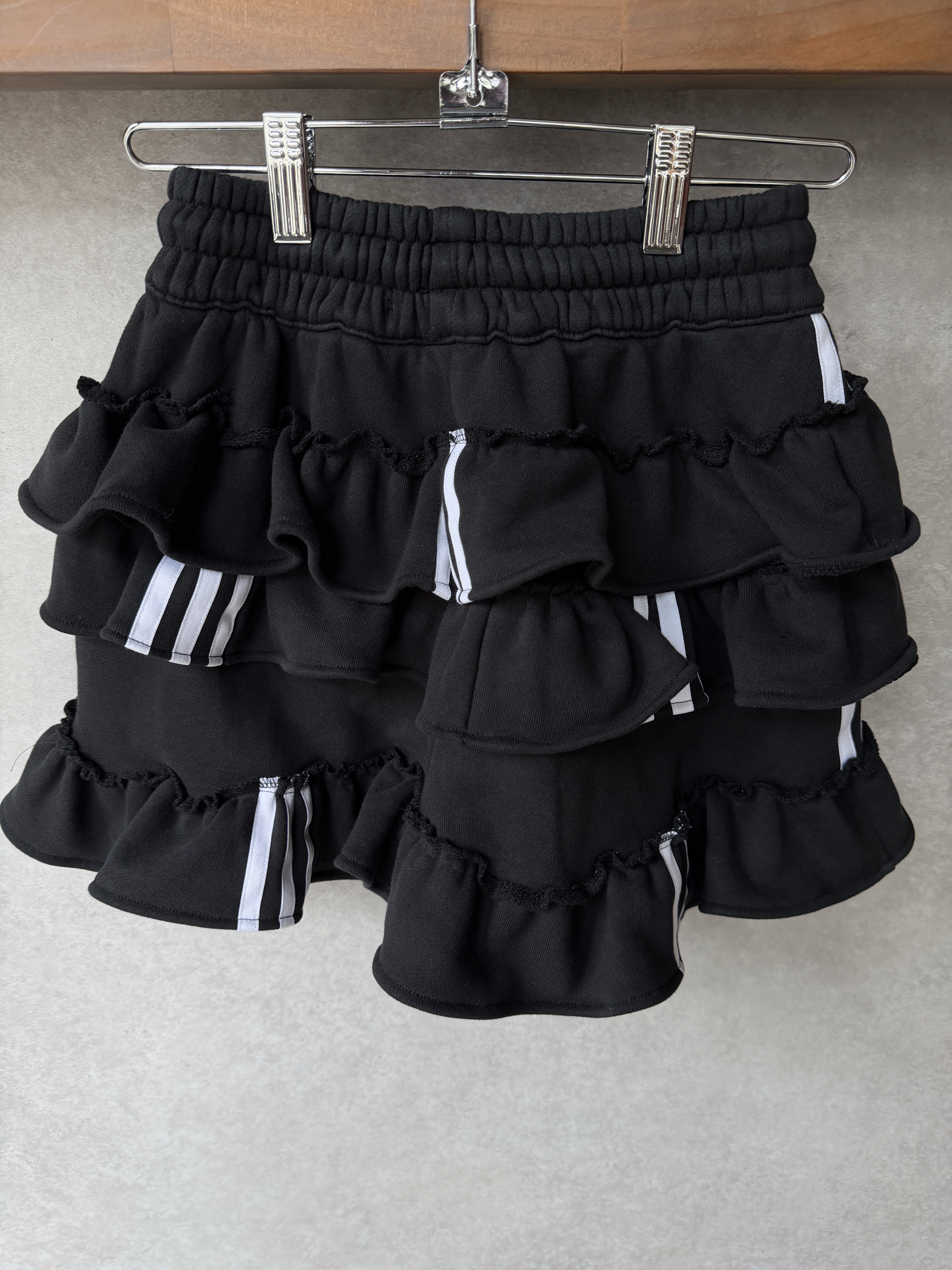 ブラックのadidasのスウェットパンツを裁断し、スカートにリメイクしました。プリっと動きのあるティアードフリルでカジュアルテイストの中に甘さもミックスしたスカートです。ウエスト部分はゴムなので腰履きして長さ調節もしていただけます。1枚はもちろん、デニムやバイカーパンツの上にレイヤードさせたスタイリングもお勧めです。こちらは1点物のアイテムとなります。同じものは一つとして無いあなただけの一着をお届けします。※こちらの商品はUSEDの生地を使用しております。多少の汚れやほつれ等ダメージがある場合が御座います。商品特有の風合いをご理解、ご了承頂いた上でのご注文をお願い致します。返品交換は対応致しかねます。神経質な方や商品の特性をご理解、ご了承頂けない方は手に取ってご購入頂けるショップでのご購入をお願い致します。STAFF:158cm【サイズ】サイズ表記XS(平置き採寸)スカート丈33cm ウエスト27.5cm(ゴムの為伸縮) ヒップ45cm【素材】本体:コットン100%■クロネコ代金後払いをご利用のお客様■商品到着後に請求書(払込用紙)が到着します。14日以内にお支払いをお願いします。全国の主要なコンビニで、請求書をレジに持っていくだけでお支払いが可能です。全国の郵便局でも同じ請求書でお支払いできます。※ご請求書が圧着ハガキタイプの場合、郵便局でのお支払いはできません。※弊社の銀行口座宛にお振込頂くものでは御座いません。ご注意下さい。