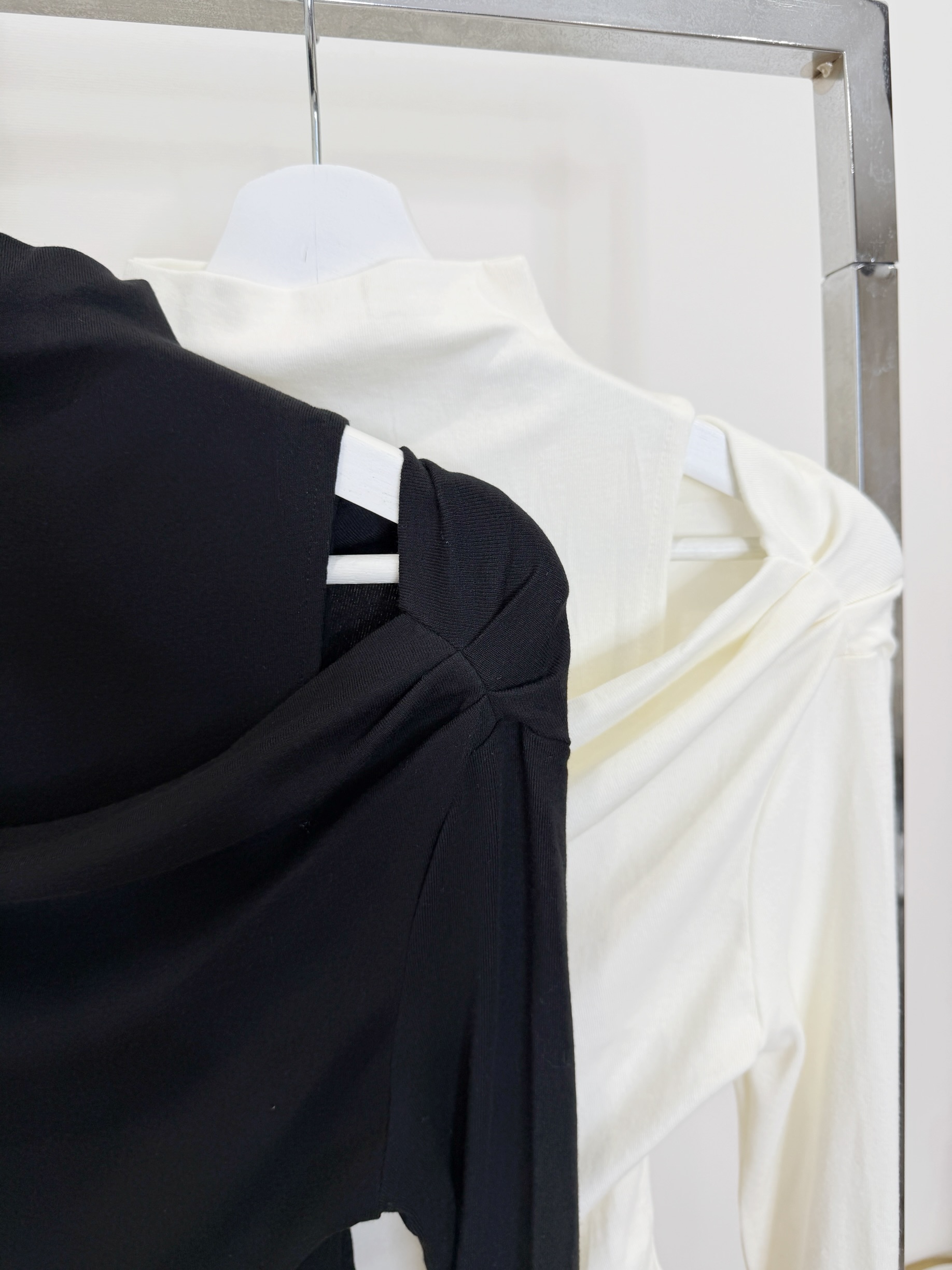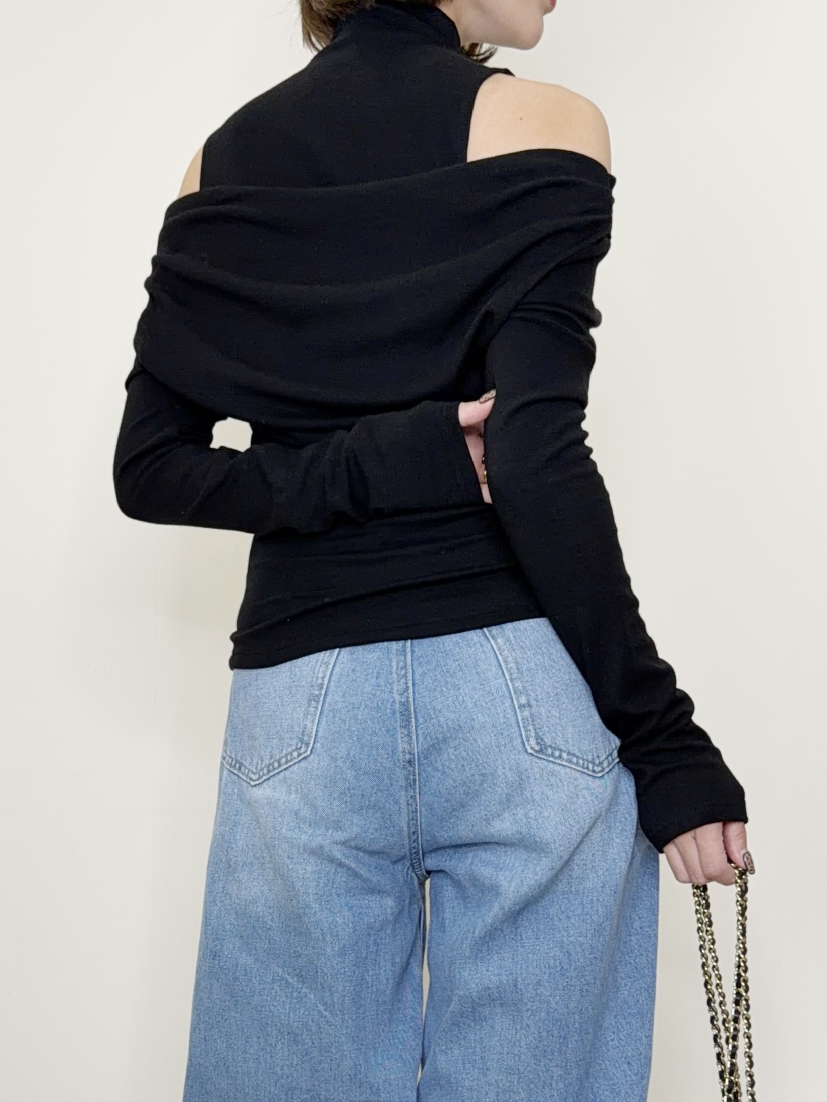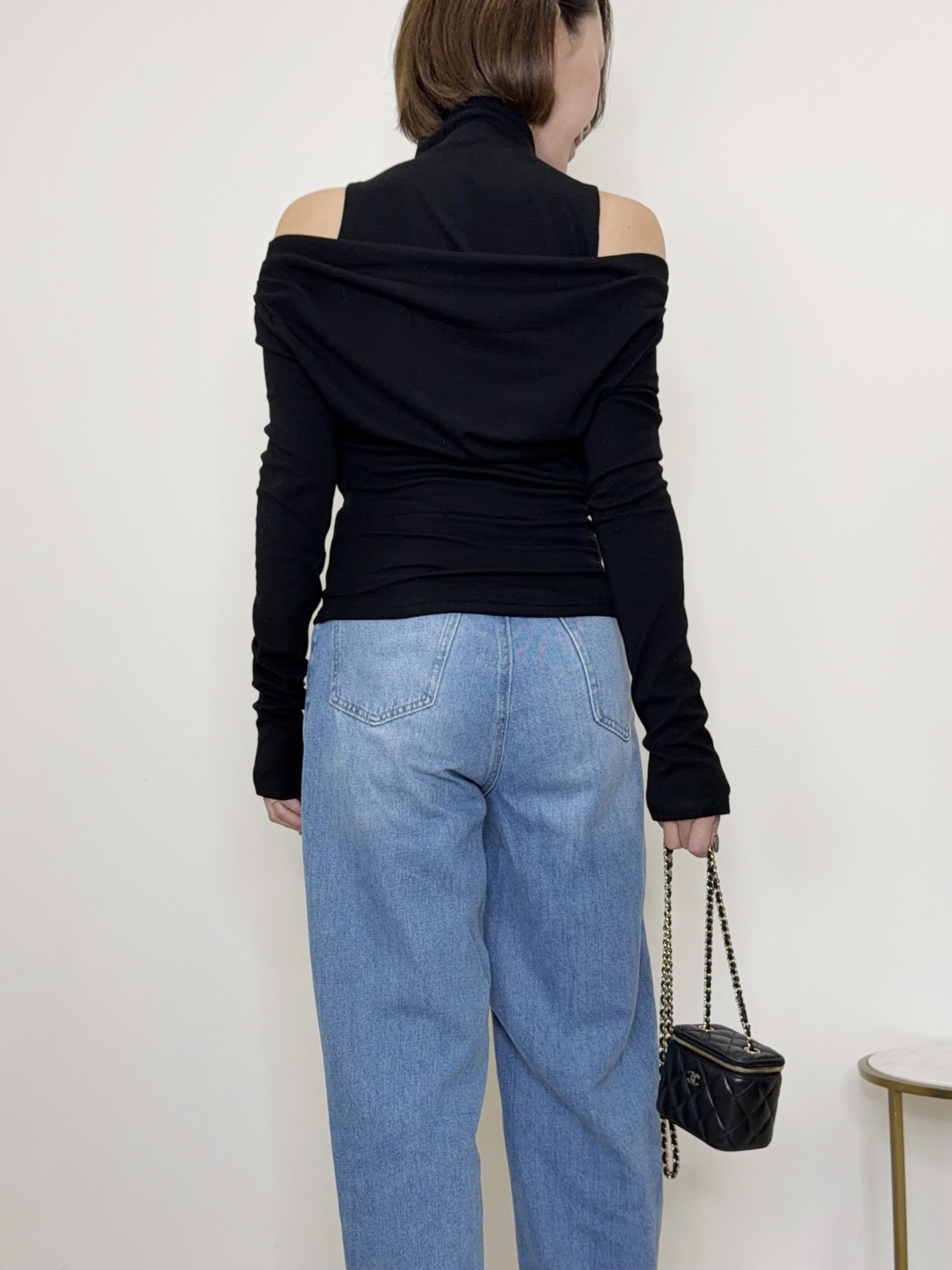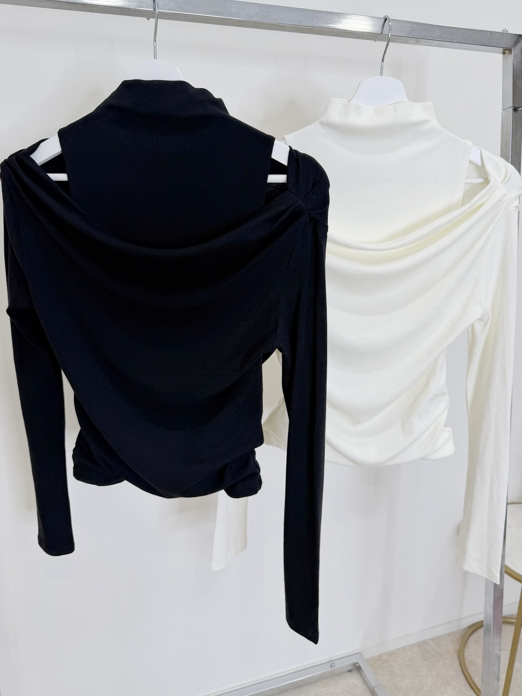 ※こちらの商品を単体で1点のみご注文頂いた場合、ネコポス配送(385円)にて発送が可能です。ご希望の方はご注文時にメッセージ欄にネコポス希望とご記入をお願い致します。金額は弊社にて変更いたします。ヘルシーな肌見せを叶えるオフショルダートップス。ハイネックのトップスに重ね着したようなシンプルながらもデザインが光る一枚です。オフショルダーの肌見せ具合は調節可能なのでシーンに合わせて着用していただけます。ブラックとアイボリーの2カラー展開。着心地の良い身体にフィットするしっとりとした伸びが良い素材も◎STAFF:158cm【サイズ】(平置き採寸/約)着丈55cm 身幅43cm 袖丈60cm【素材】ポリエステル65%,コットン35% ■クロネコ代金後払いをご利用のお客様■商品到着後に請求書(払込用紙)が到着します。14日以内にお支払いをお願いします。全国の主要なコンビニで、請求書をレジに持っていくだけでお支払いが可能です。全国の郵便局でも同じ請求書でお支払いできます。※ご請求書が圧着ハガキタイプの場合、郵便局でのお支払いはできません。※弊社の銀行口座宛にお振込頂くものでは御座いません。ご注意下さい。