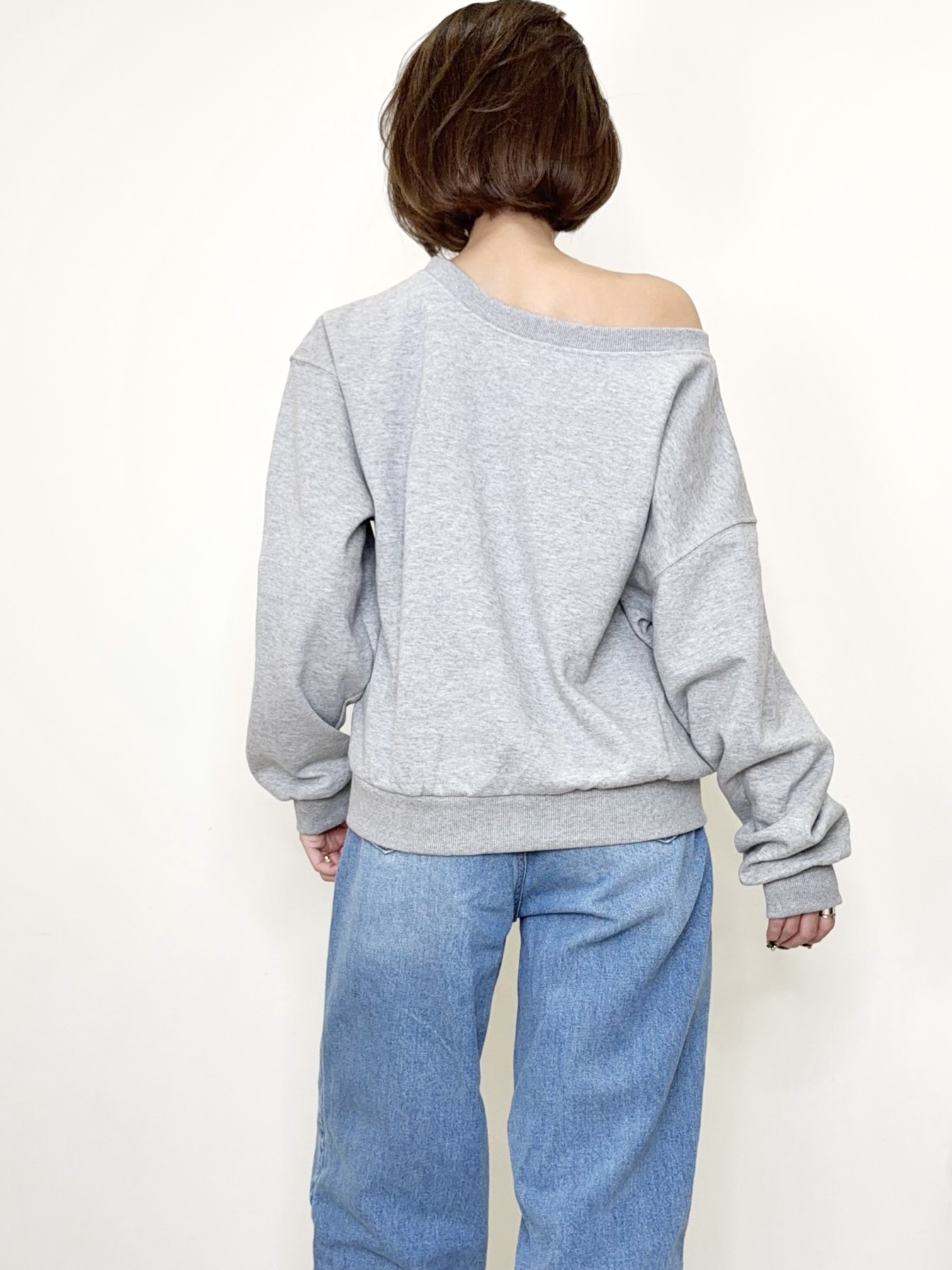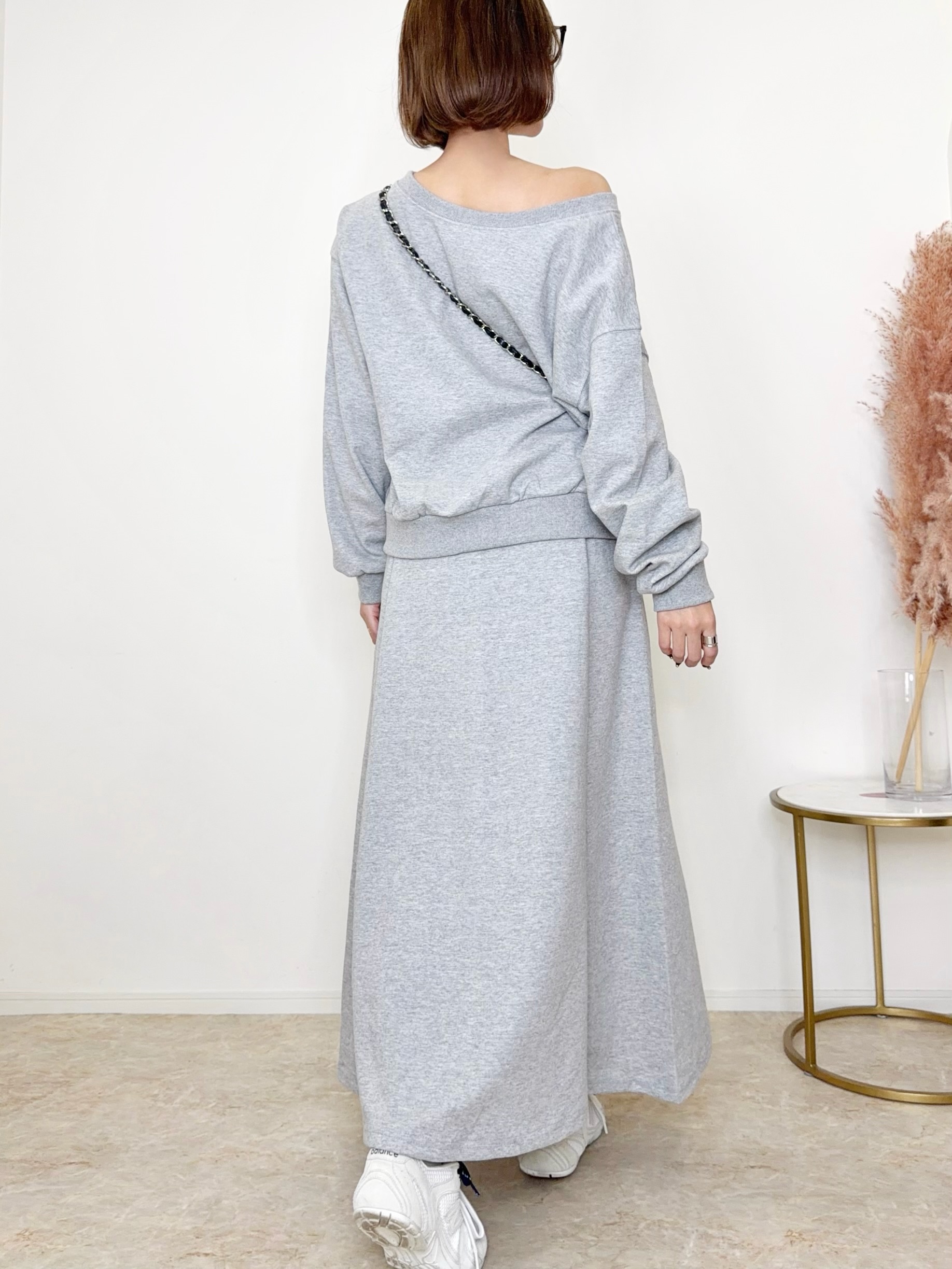 カジュアルな印象のスウェットもオフショルダーとスカートの組み合わせで女性らしい印象に。