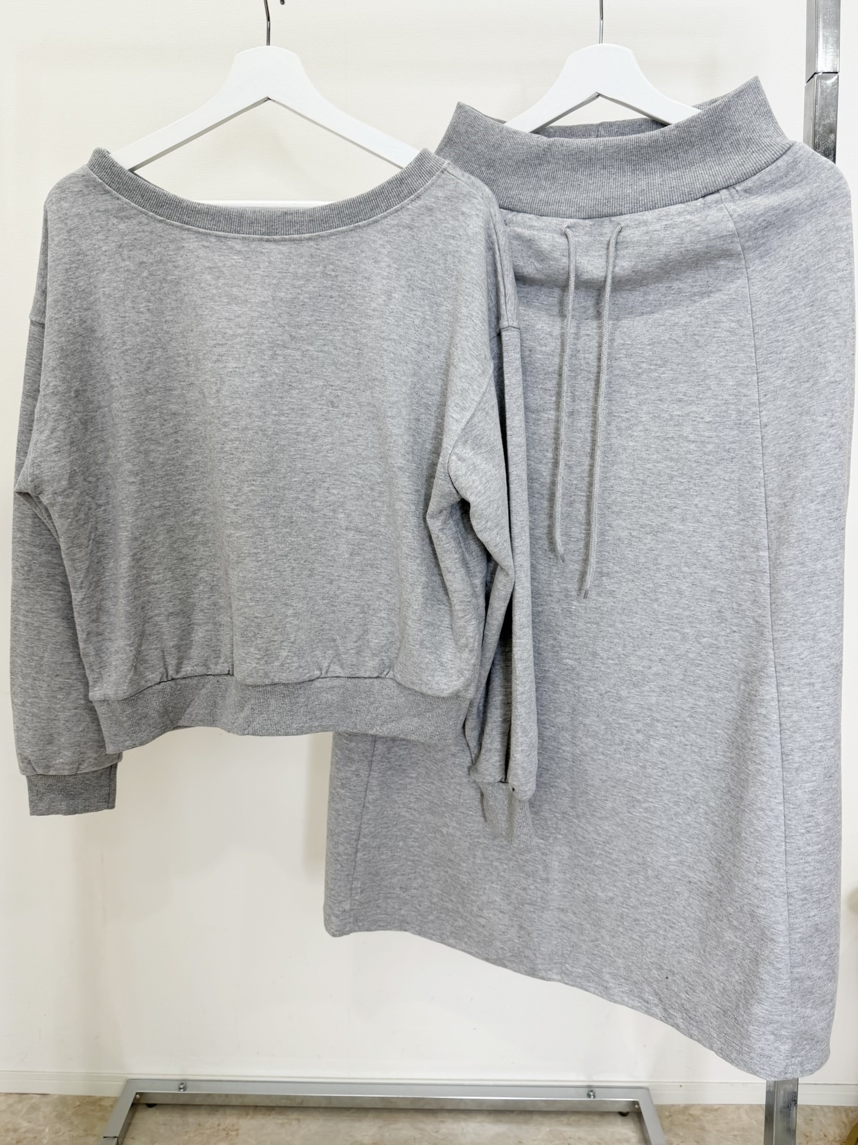 ゆるっとしたシルエットがリラクシーなセットアップ。カジュアルな印象のスウェットもオフショルダーとスカートの組み合わせで女性らしい印象に。ジャケットに合わせると綺麗目にも、ワンマイルウエアや機内コーデにもピッタリ。上下別にも着用可能なので着回しも効きます。スカートのウエスト部分は伸縮性に優れたリブ素材で快適◎アウターの下に着てもモタつかない適度な厚みのある生地もポイント。スウエット好き、カジュアル好きな方にお勧めのセットアップです。STAFF:158cm【サイズ】(平置き採寸)TOPS:着丈49cm 身幅59cm 肩幅58cm 袖丈52cmSKIRT:スカート丈89cm ウエスト30.5cm ヒップ54cm【素材】ポリエステル65%,コットン35%■クロネコ代金後払いをご利用のお客様■商品到着後に請求書(払込用紙)が到着します。14日以内にお支払いをお願いします。全国の主要なコンビニで、請求書をレジに持っていくだけでお支払いが可能です。全国の郵便局でも同じ請求書でお支払いできます。※ご請求書が圧着ハガキタイプの場合、郵便局でのお支払いはできません。※弊社の銀行口座宛にお振込頂くものでは御座いません。ご注意下さい。
