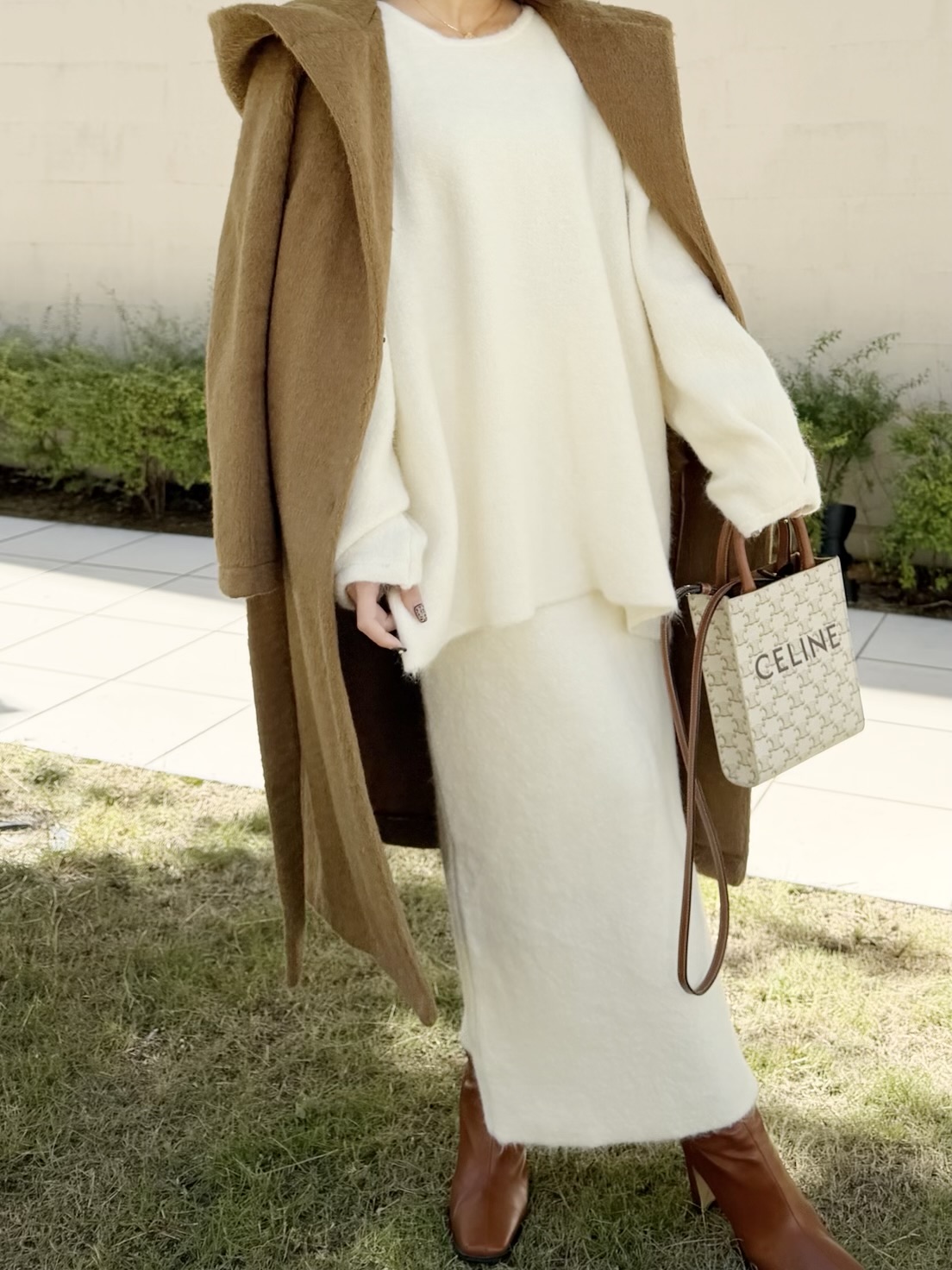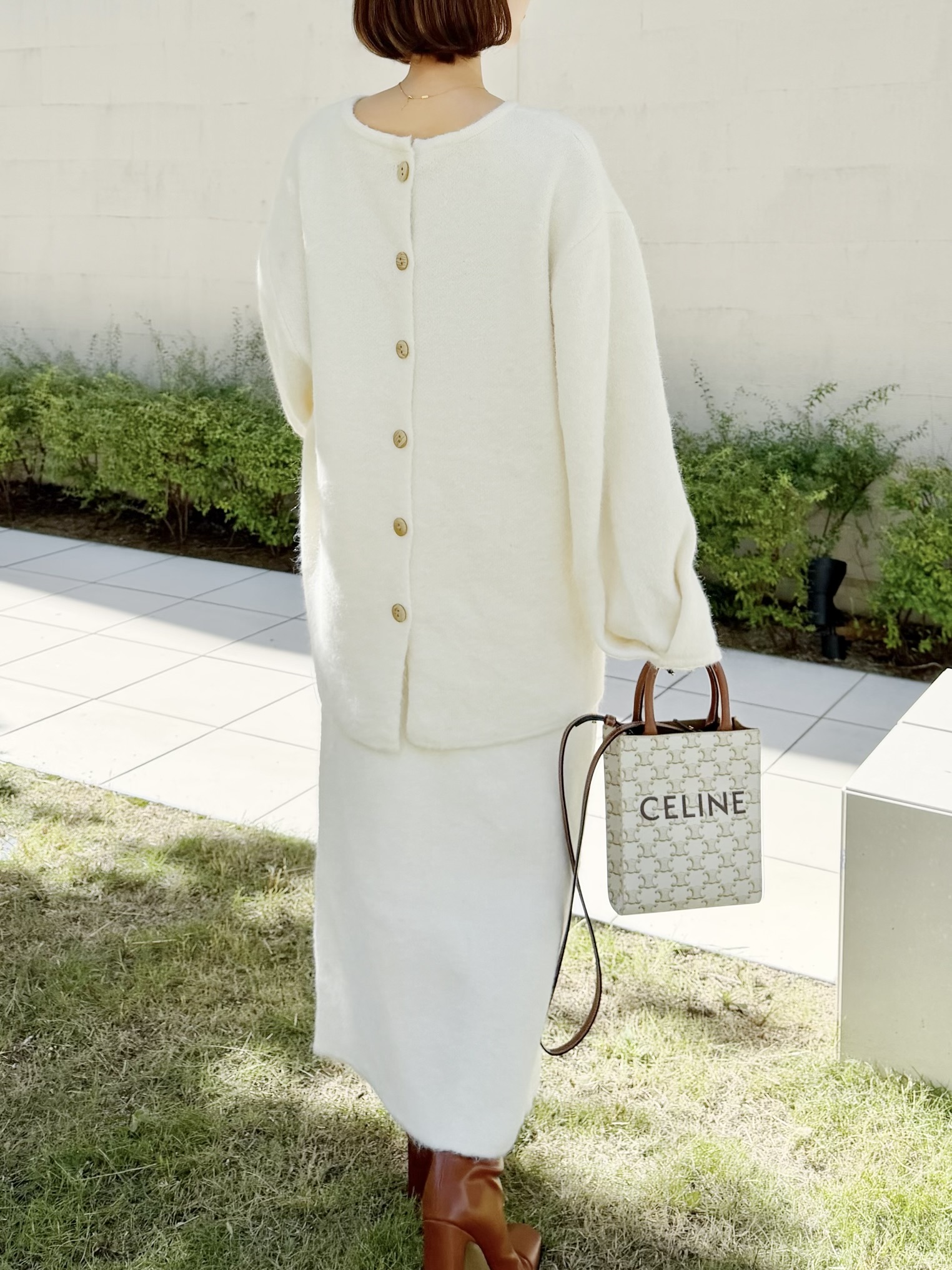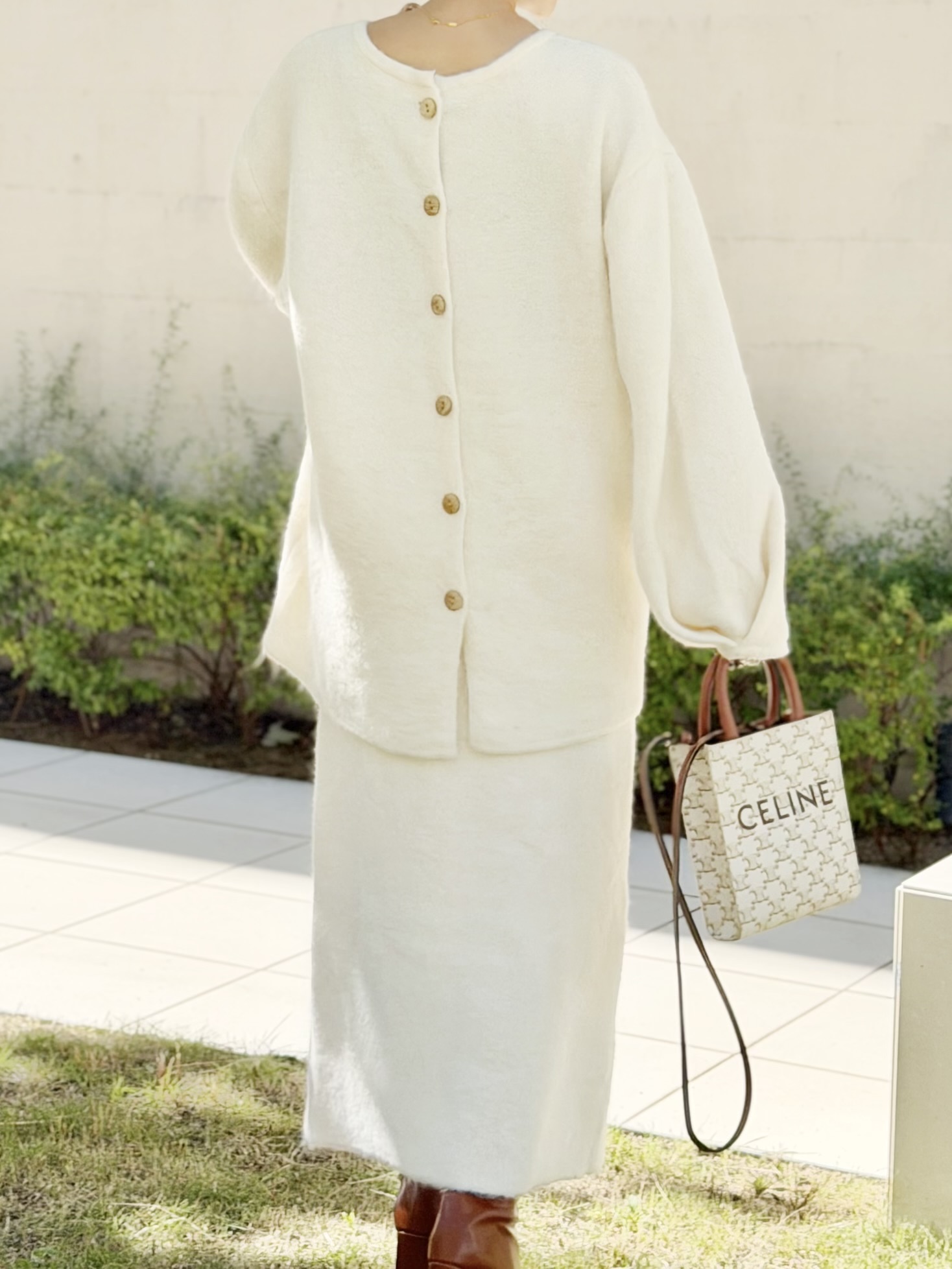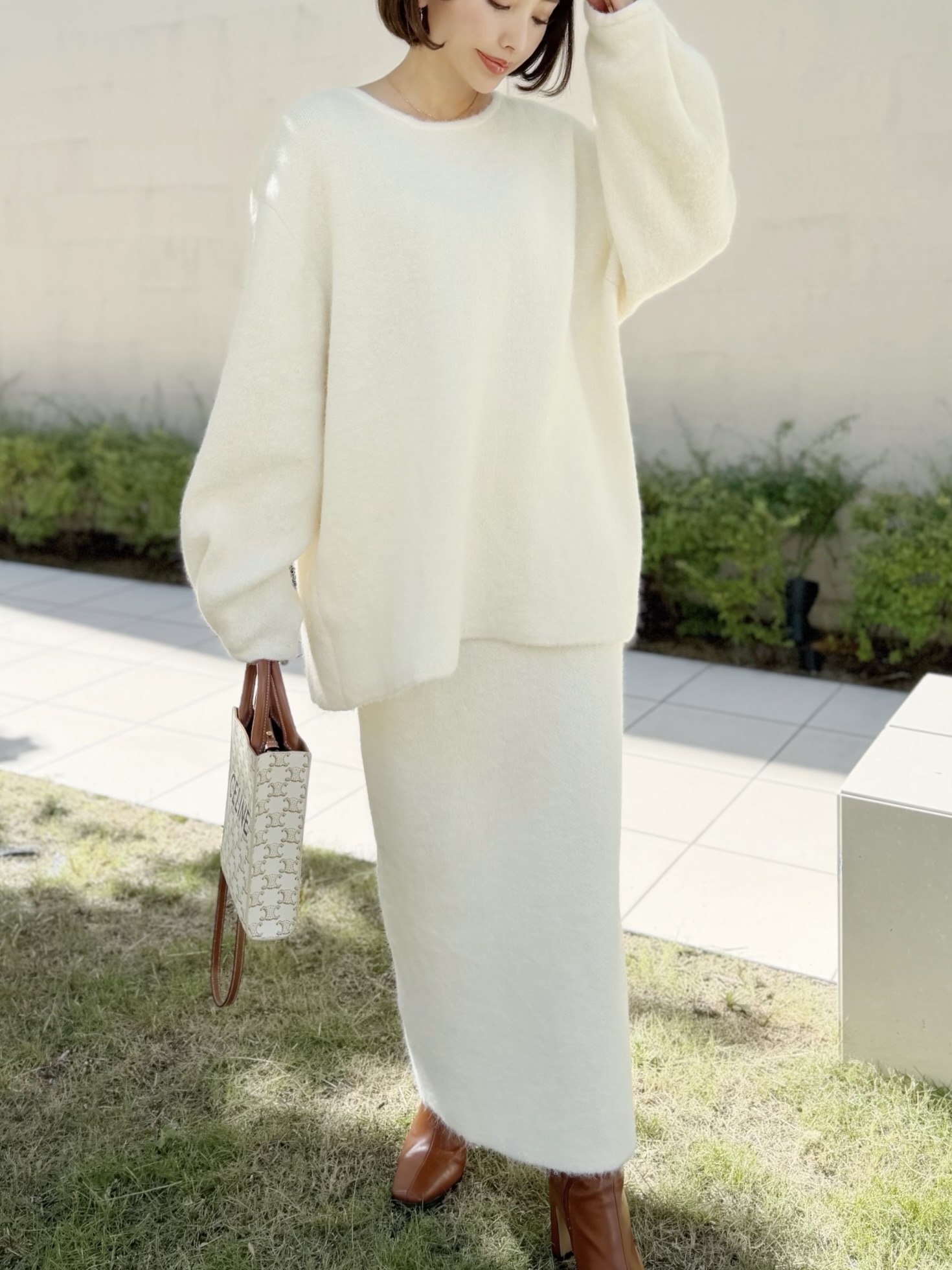 優しいアイボリーの色味が秋冬のスタイルをぱっと明るくしてくれる大人なニットセットアップです。