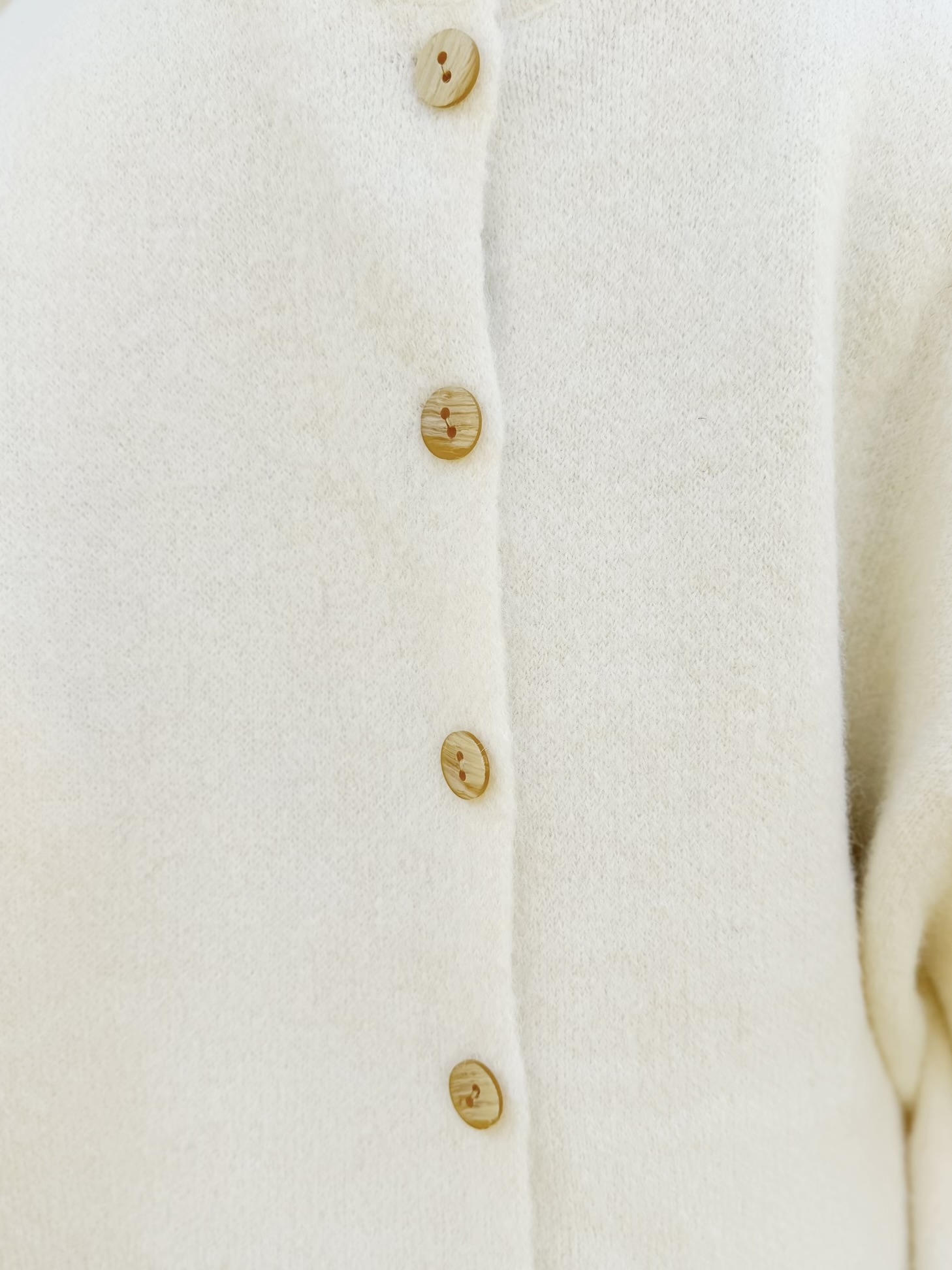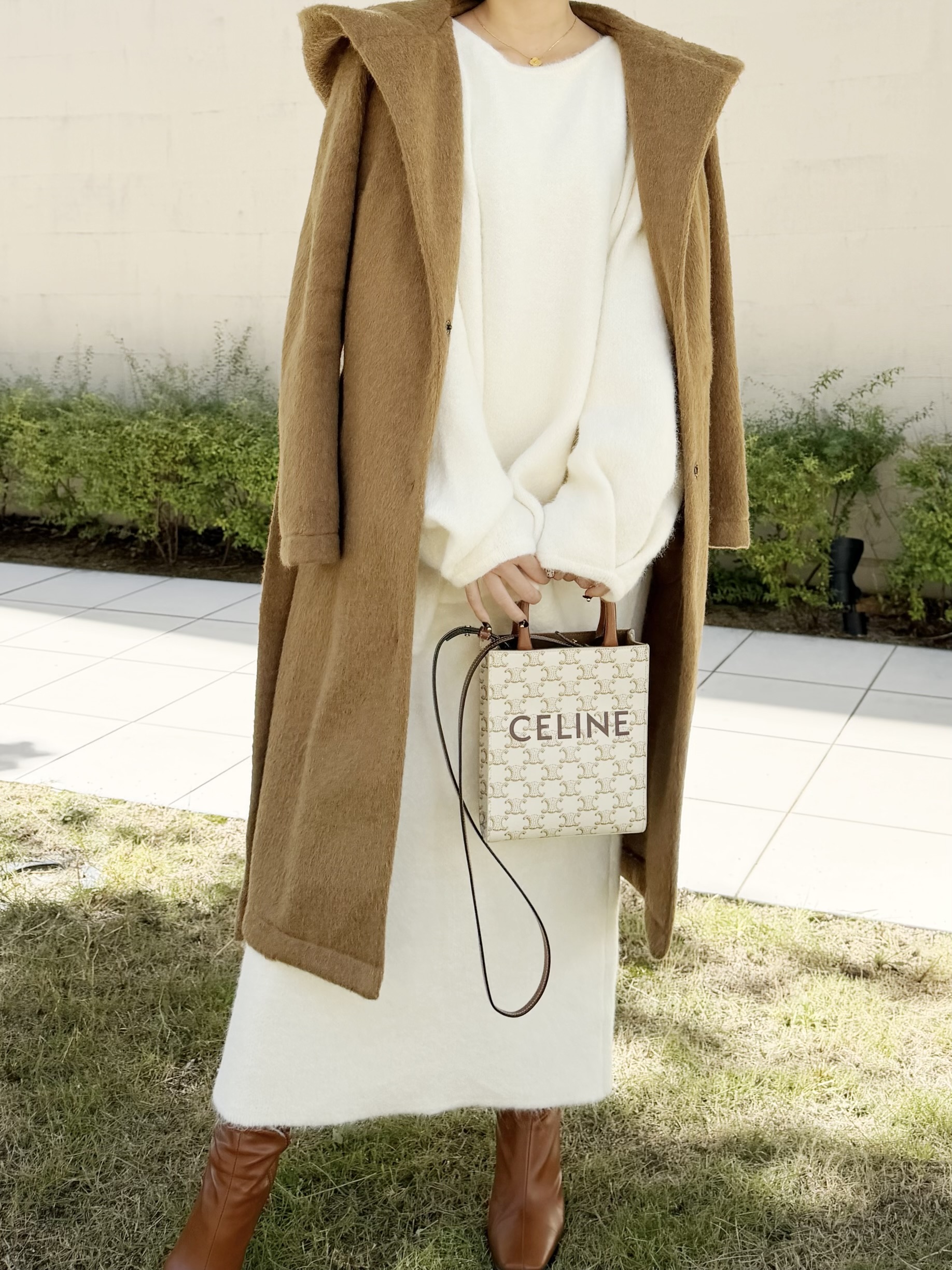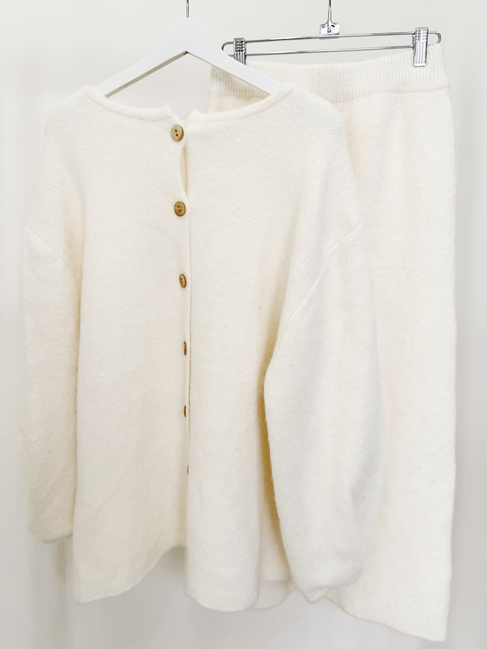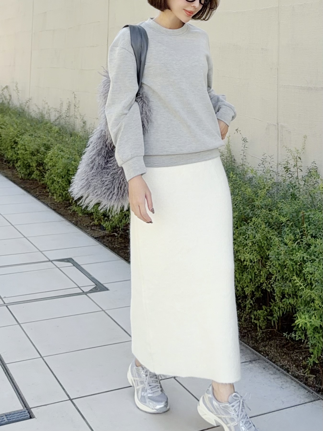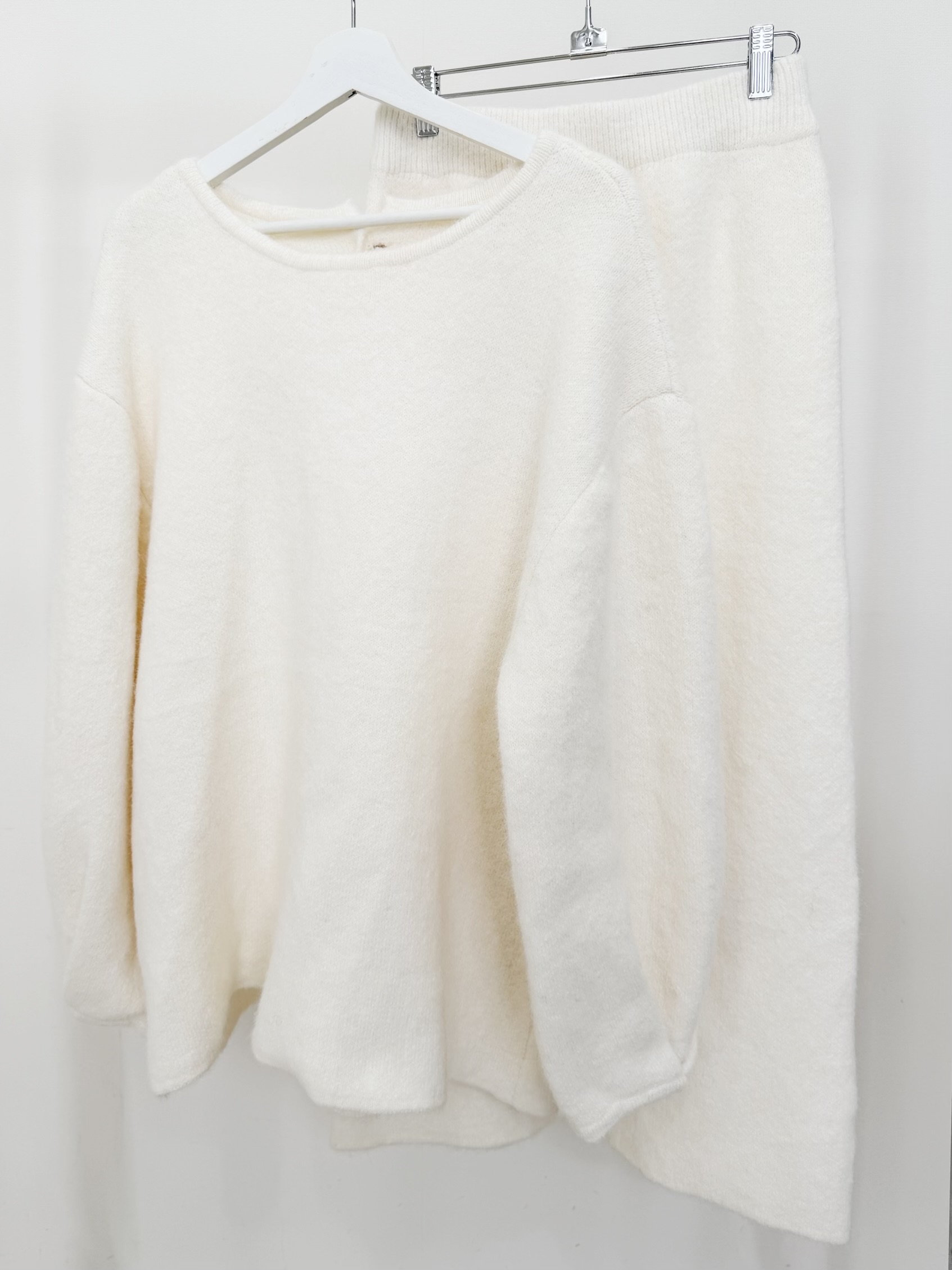 優しいアイボリーの色味が秋冬のスタイルをぱっと明るくしてくれる大人なニットセットアップです。