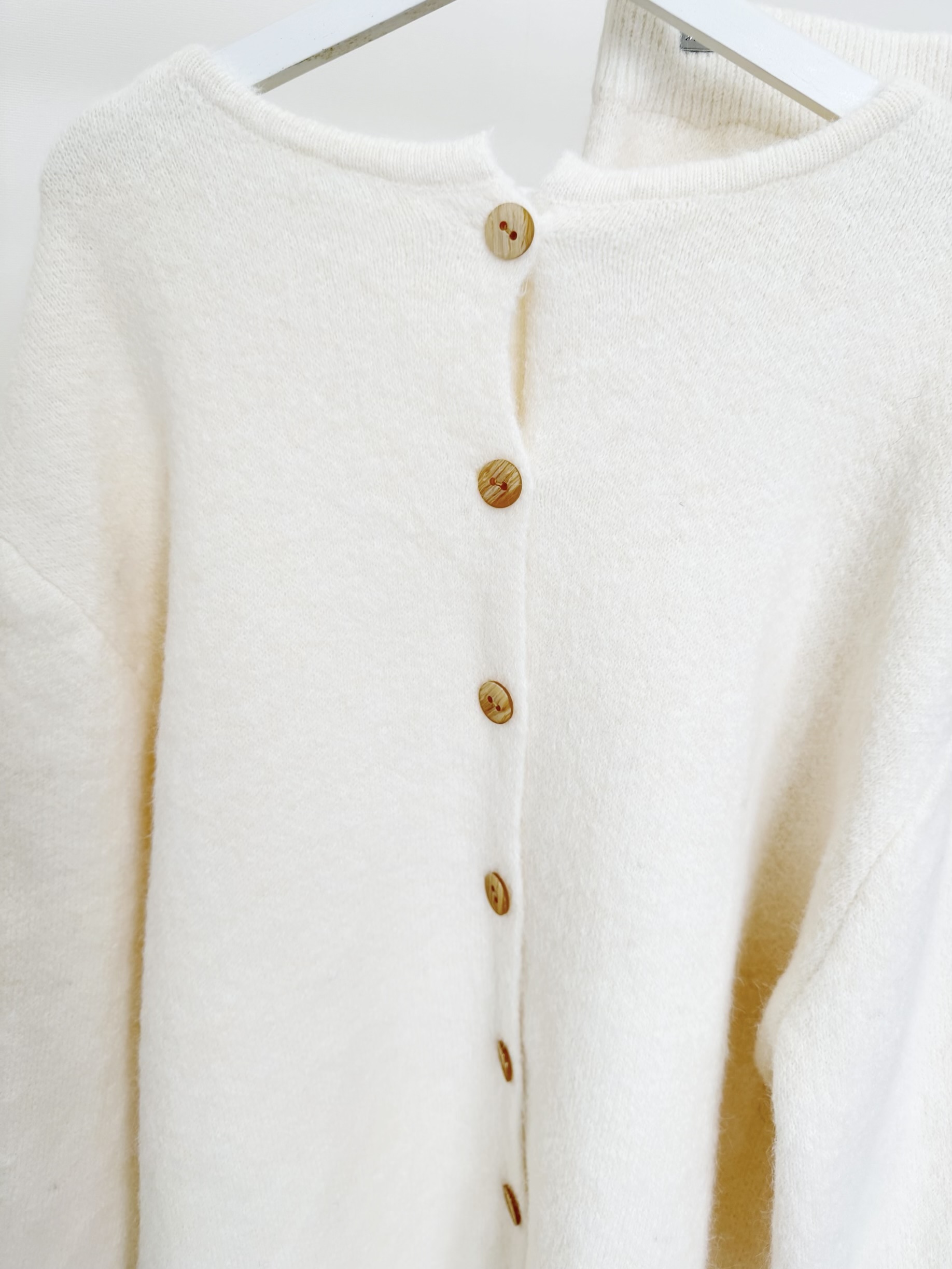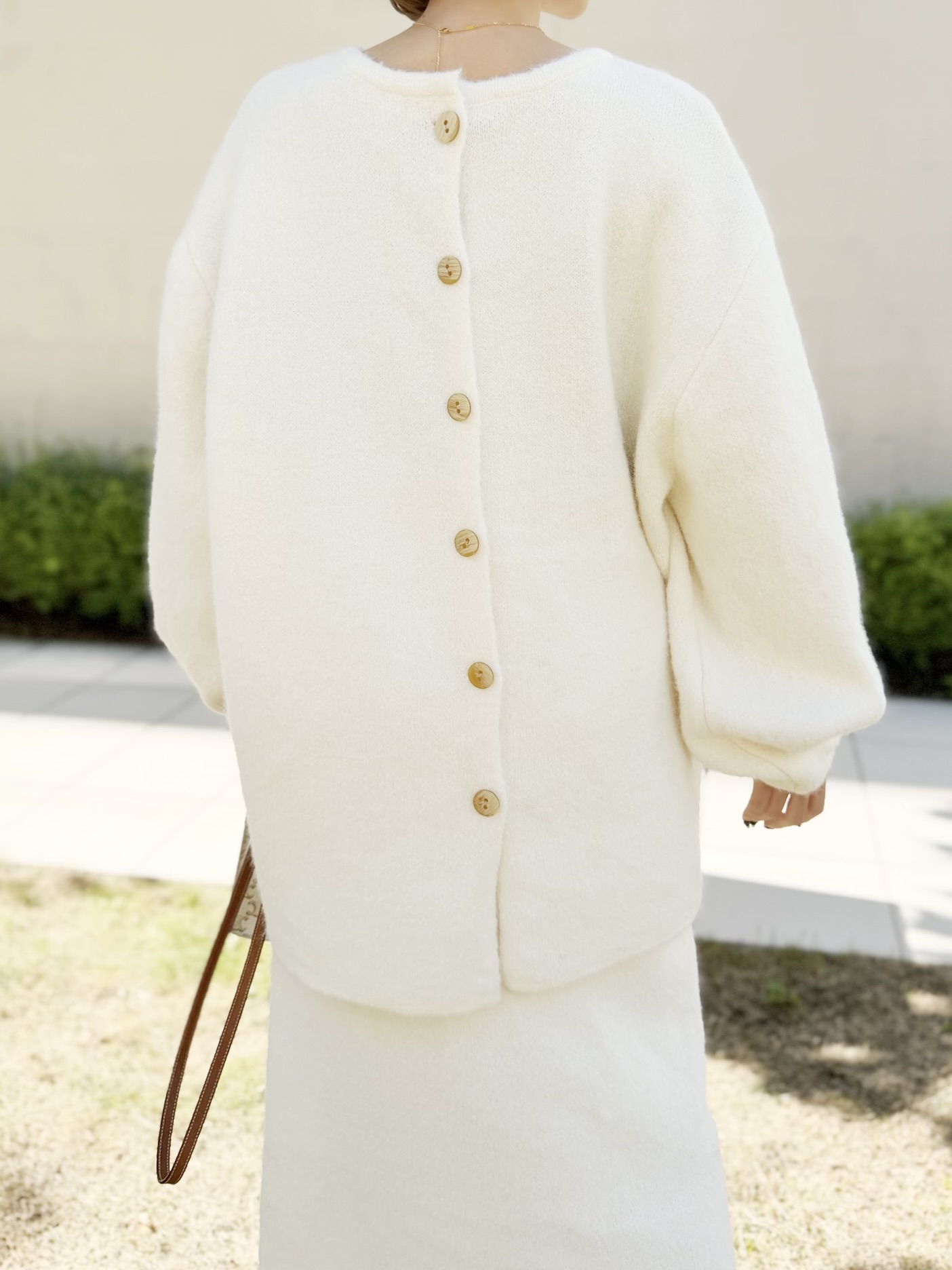 トップスはカーディガンとしても着用可能。前後どちらでもお召しいただけます。