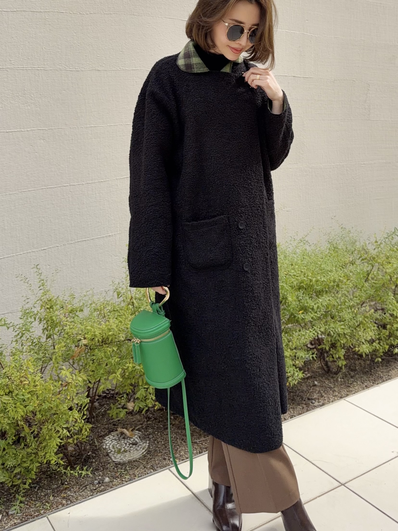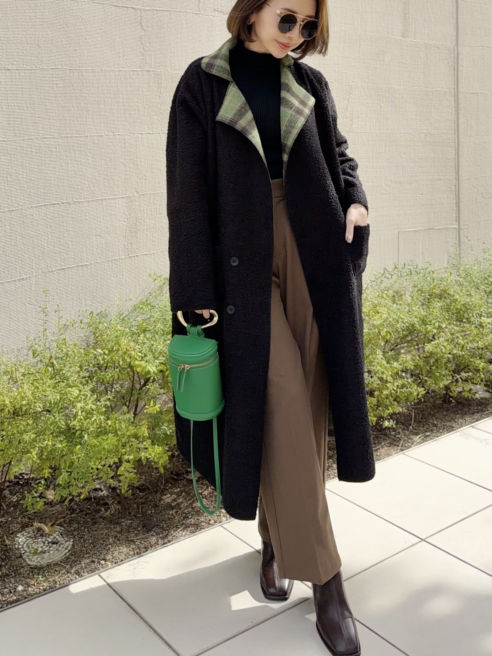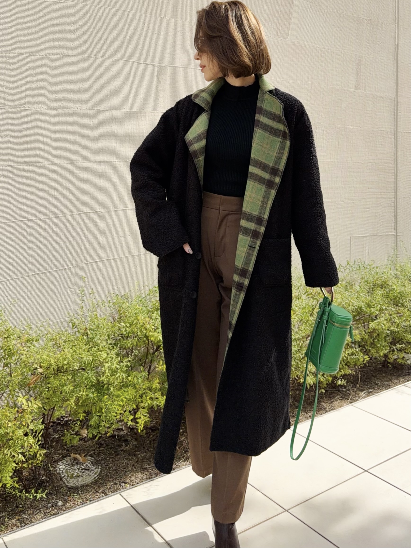 綺麗なグリーン×ブラウンベースのチェック柄コート。内側はシンプルなブラックボア素材になっており、リバーシブルでも着用可能。アーム周りはゆったりしているので、厚手ニットも着用できます。ゆるっとシルエットで体型カバーも叶えます。暗くなりがちな秋冬の装いがぱっと明るく華やぐ1枚。カジュアルにも綺麗目にもお召し頂けます。 STAFF:158cm【サイズ】(平置き採寸)着丈110cm 肩幅51cm 身幅62cm 袖丈52cm【素材】ポリエステル100%■クロネコ代金後払いをご利用のお客様■商品到着後に請求書(払込用紙)が到着します。14日以内にお支払いをお願いします。全国の主要なコンビニで、請求書をレジに持っていくだけでお支払いが可能です。全国の郵便局でも同じ請求書でお支払いできます。※ご請求書が圧着ハガキタイプの場合、郵便局でのお支払いはできません。※弊社の銀行口座宛にお振込頂くものでは御座いません。ご注意下さい。