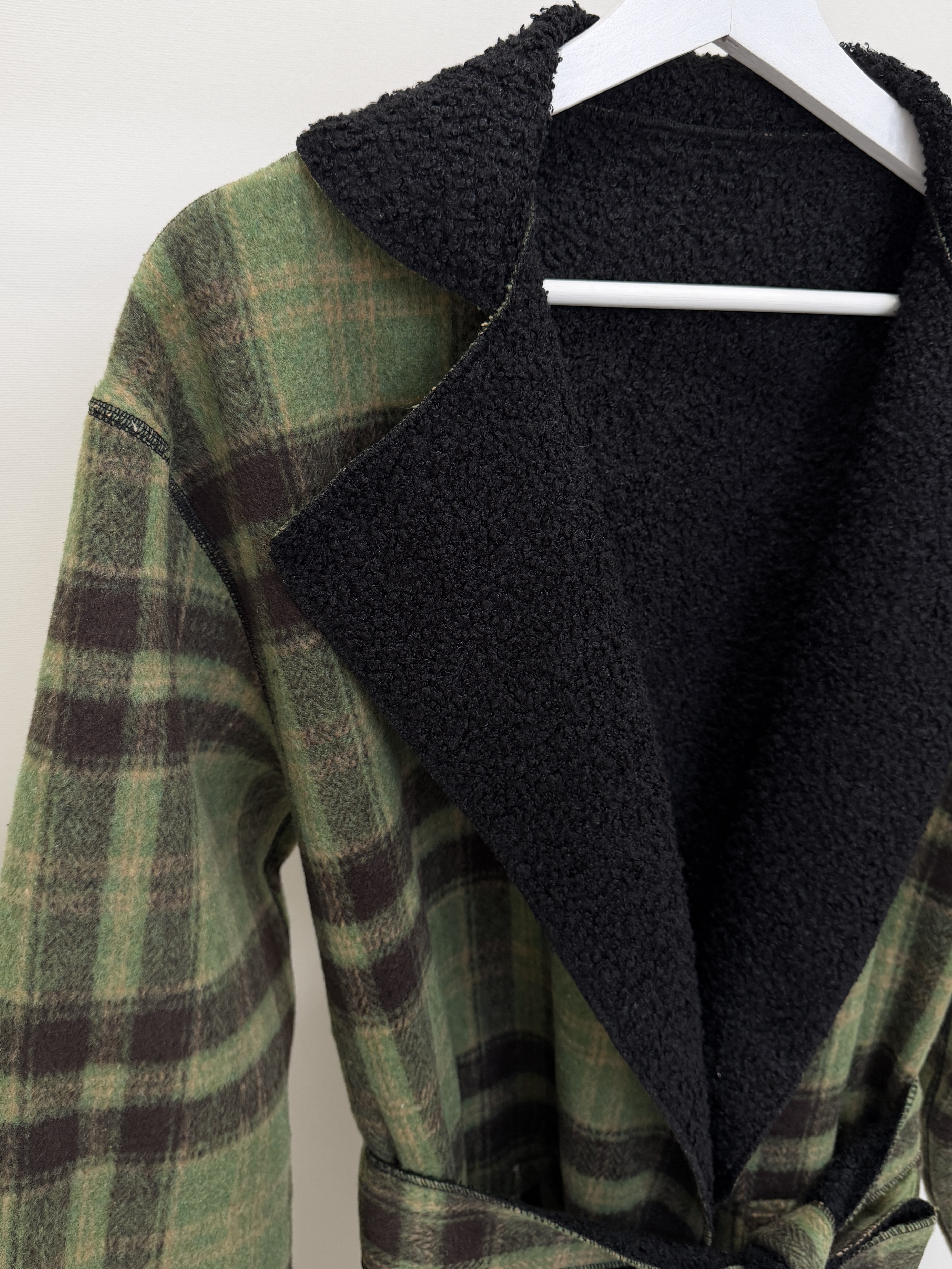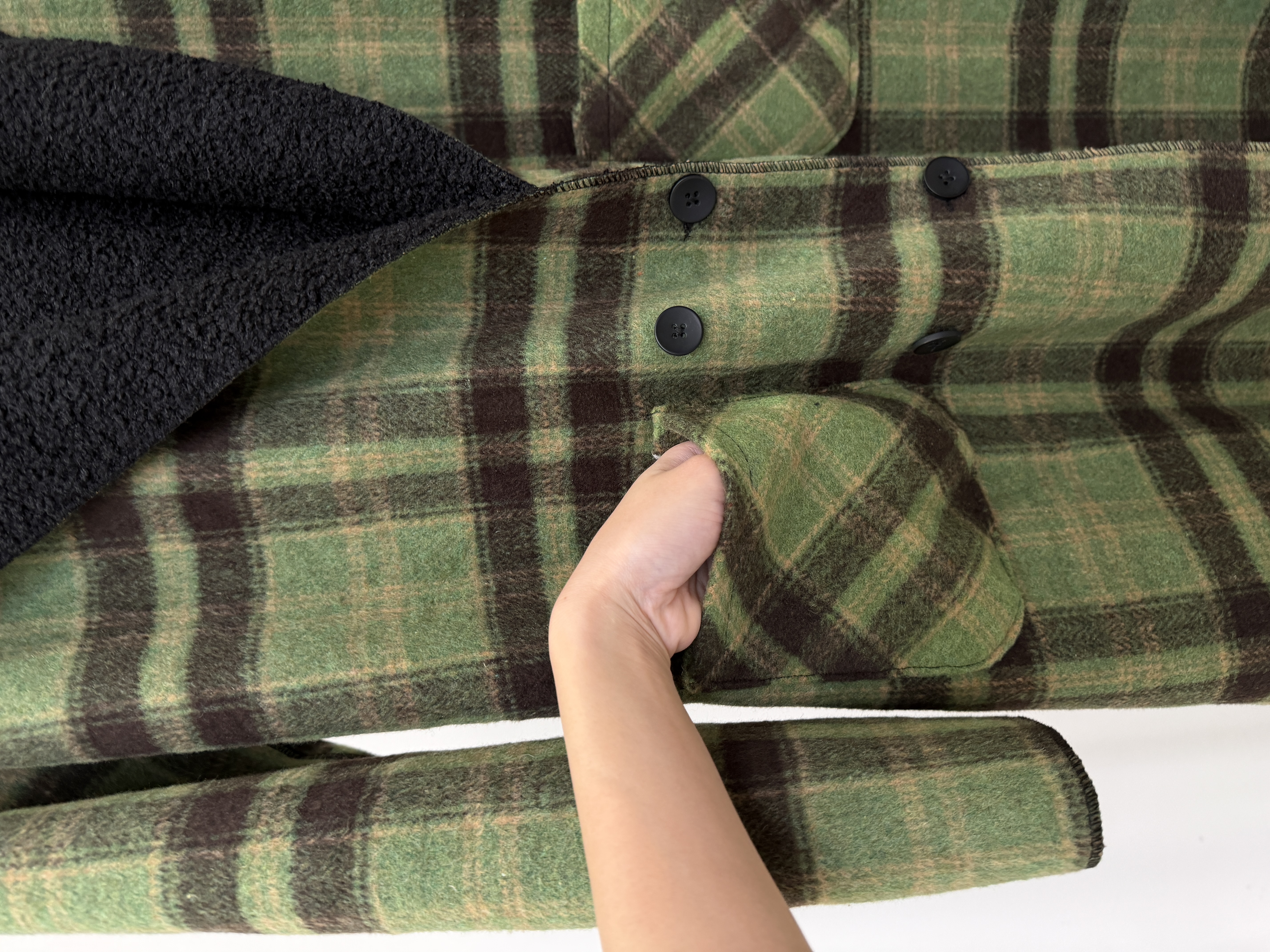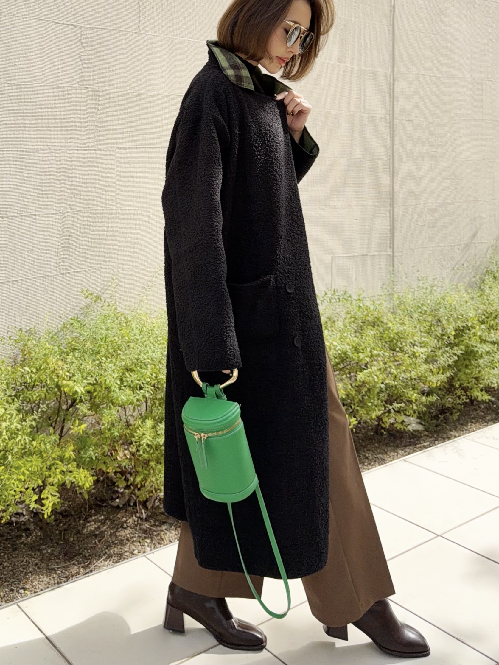 綺麗なグリーン×ブラウンベースのチェック柄コート。内側はシンプルなブラックボア素材になっており、リバーシブルでも着用可能。アーム周りはゆったりしているので、厚手ニットも着用できます。ゆるっとシルエットで体型カバーも叶えます。暗くなりがちな秋冬の装いがぱっと明るく華やぐ1枚。カジュアルにも綺麗目にもお召し頂けます。 STAFF:158cm【サイズ】(平置き採寸)着丈110cm 肩幅51cm 身幅62cm 袖丈52cm【素材】ポリエステル100%■クロネコ代金後払いをご利用のお客様■商品到着後に請求書(払込用紙)が到着します。14日以内にお支払いをお願いします。全国の主要なコンビニで、請求書をレジに持っていくだけでお支払いが可能です。全国の郵便局でも同じ請求書でお支払いできます。※ご請求書が圧着ハガキタイプの場合、郵便局でのお支払いはできません。※弊社の銀行口座宛にお振込頂くものでは御座いません。ご注意下さい。