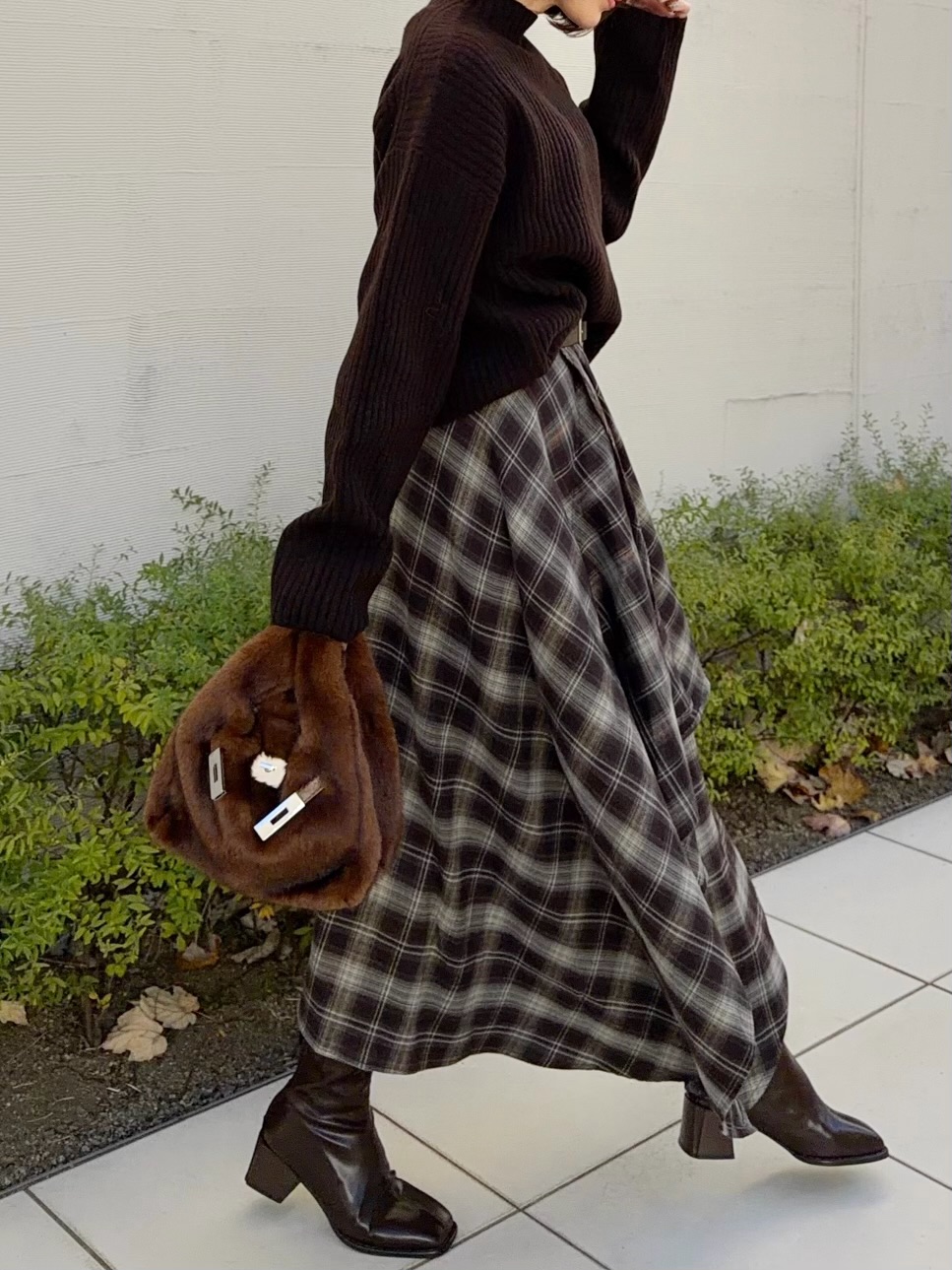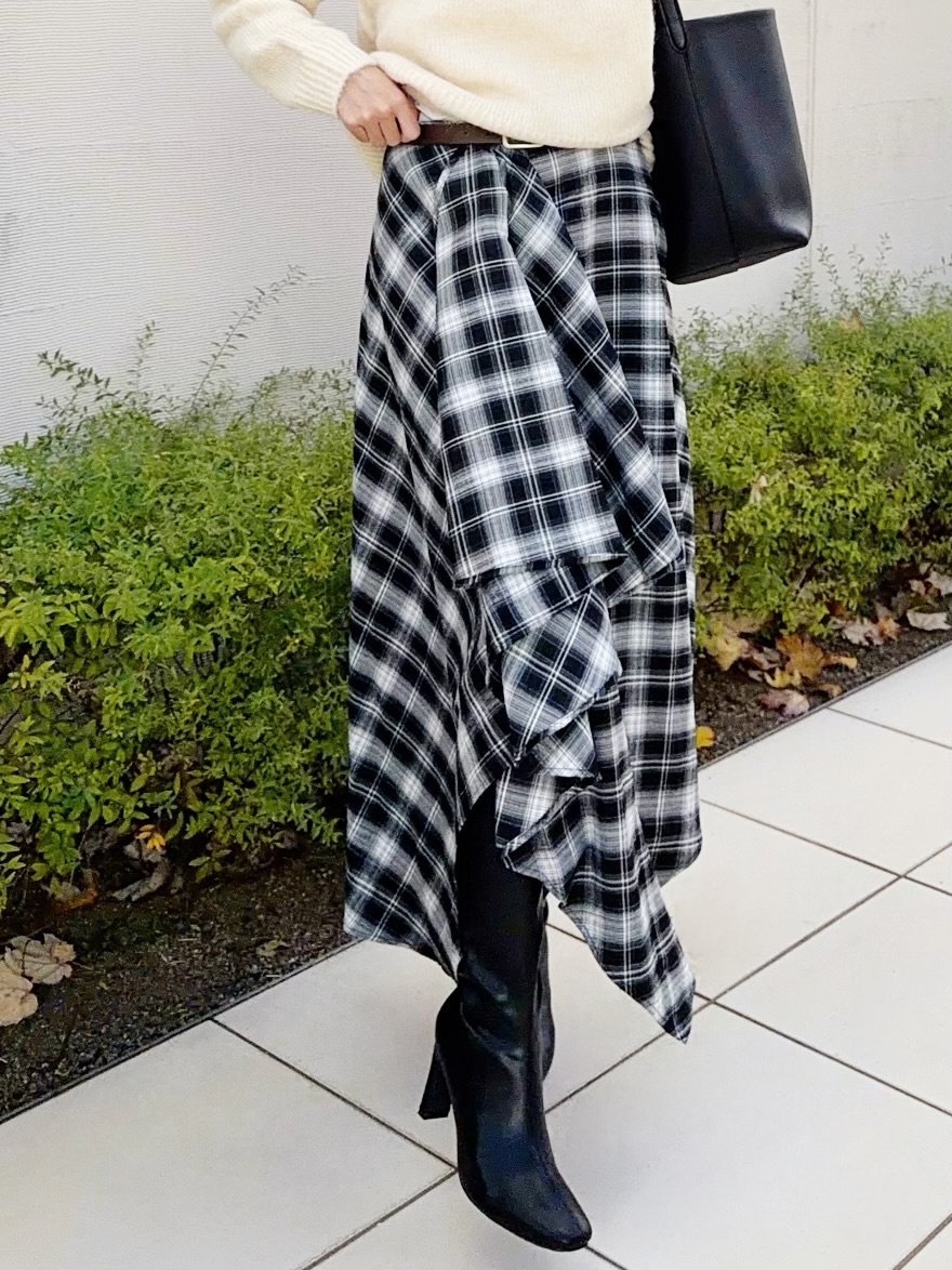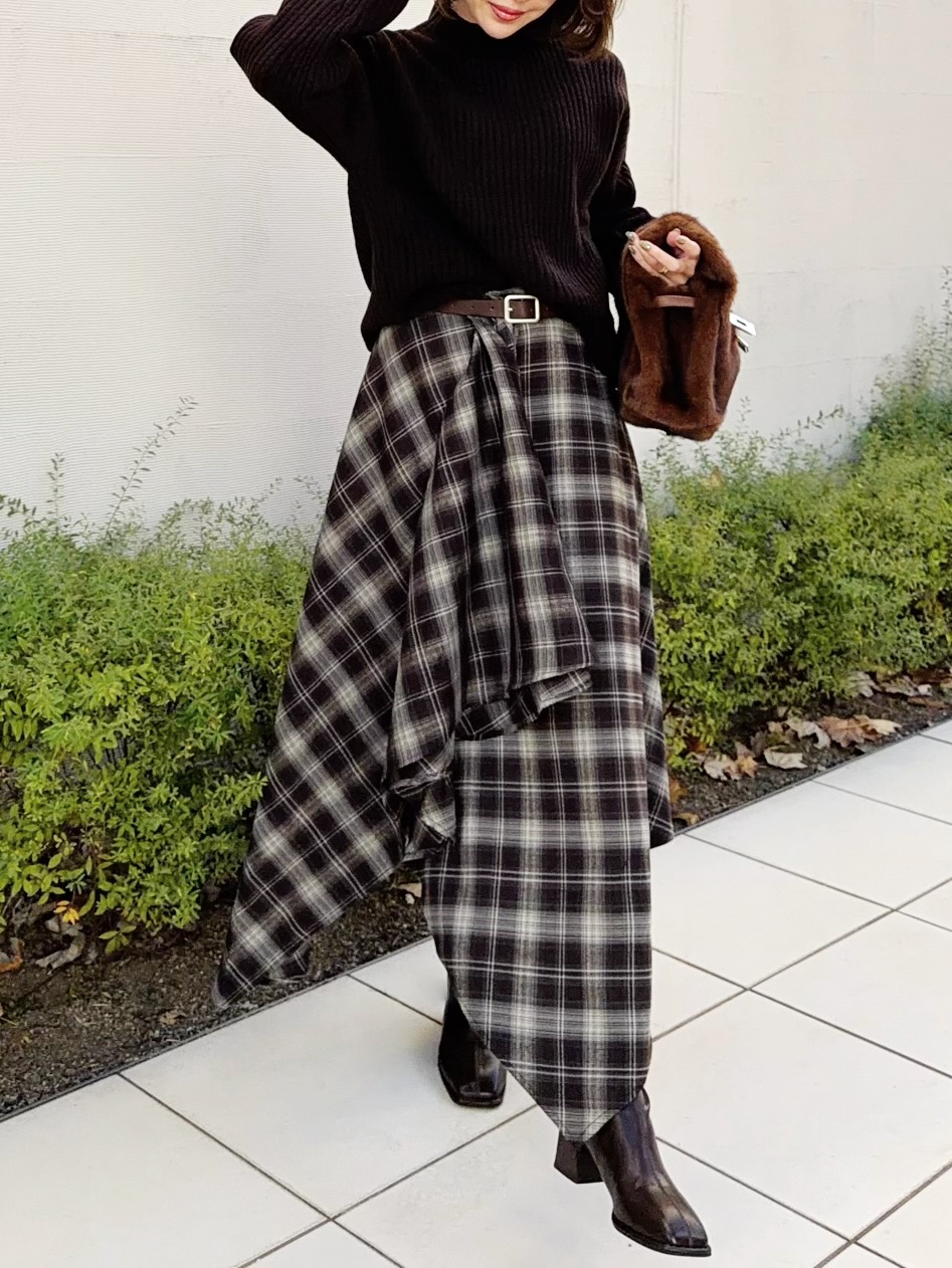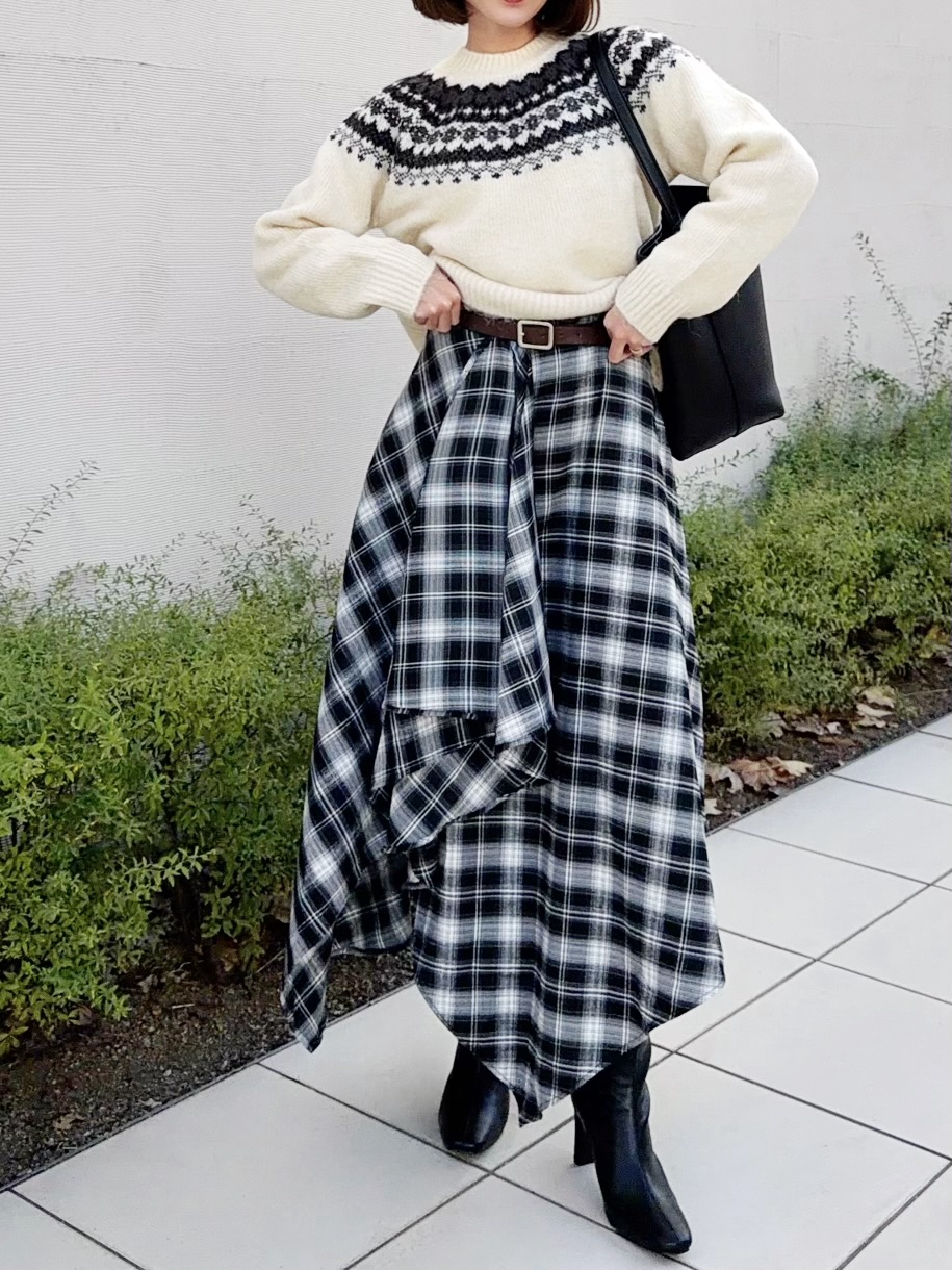 ニットやスウェットなど様々なトップスにマッチするチェックスカート。