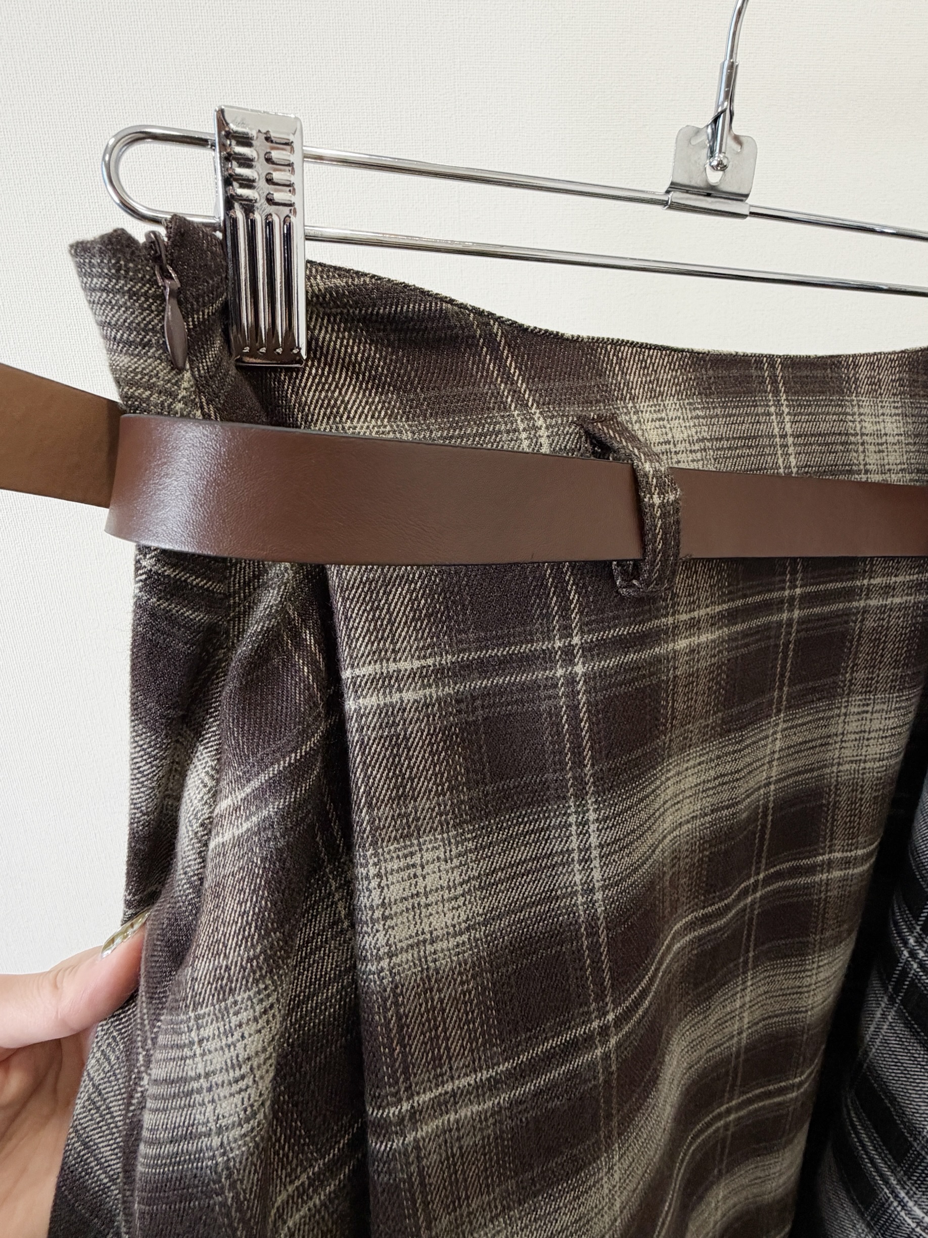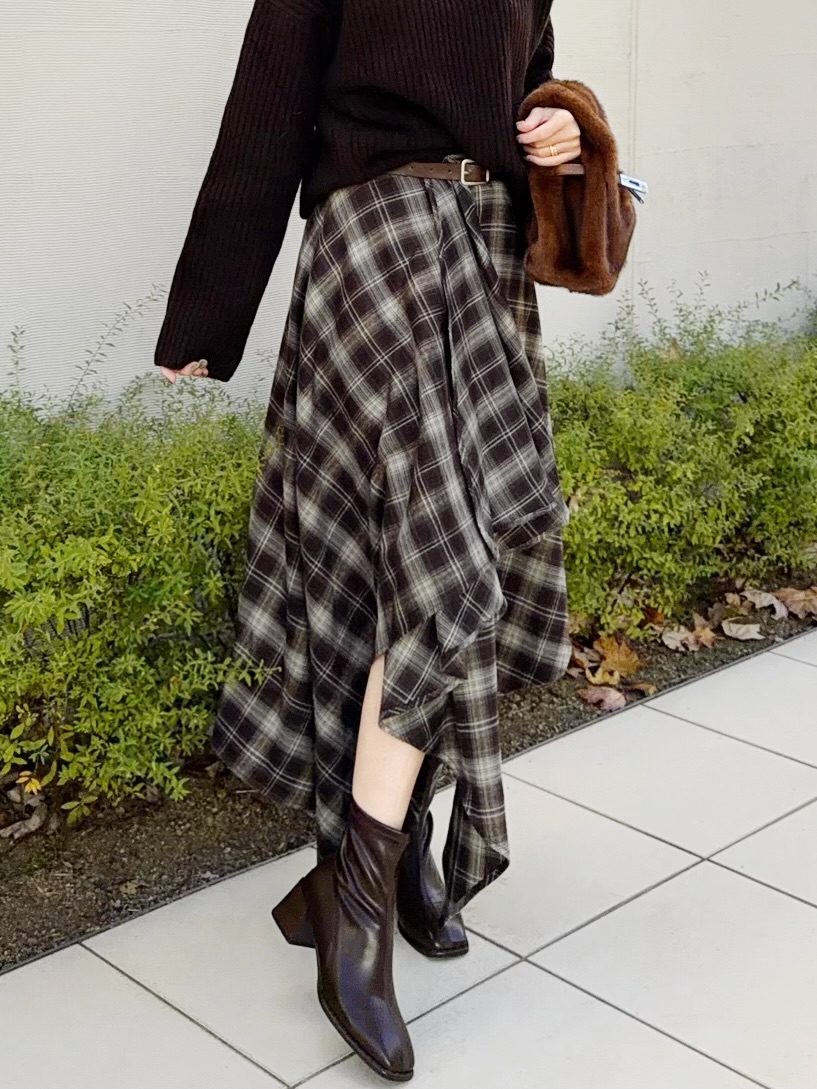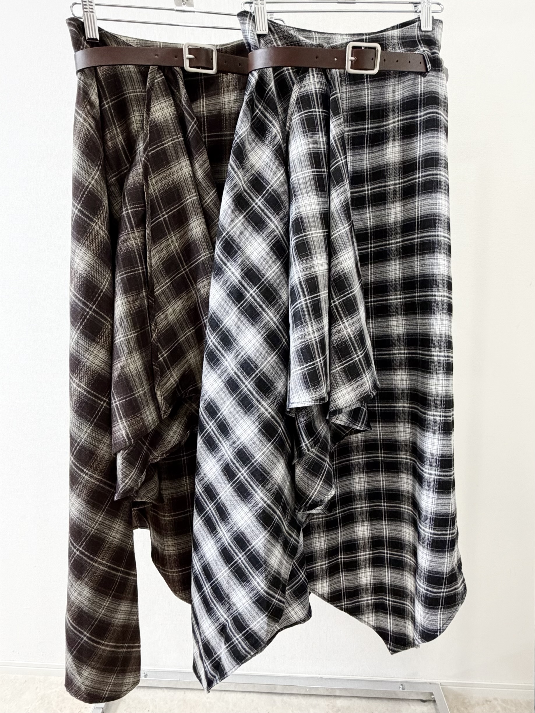 ニットやスウェットなど様々なトップスにマッチするチェックスカート。重くなりがちな秋冬のスタイリングに抜け感を演出してくれます。動きのあるランダムな裾デザインがポイント。綺麗目にもカジュアルにもお召しいただける1枚。ウエスト部分もゆとりがある為楽に履いていただけます。ソックスやタイツを合わせたりと1年を通して長く履いていただけるスカートです。サイドファスナー開閉。ブラウンのベルトが付属します。STAFF:158cm【サイズ/約:平置き採寸】スカート丈 (最長部分)87cm, (最短部分)71cm ウエスト31cm ヒップ52cm【素材】ポリエステル100%■クロネコ代金後払いをご利用のお客様■商品到着後に請求書(払込用紙)が到着します。14日以内にお支払いをお願いします。全国の主要なコンビニで、請求書をレジに持っていくだけでお支払いが可能です。全国の郵便局でも同じ請求書でお支払いできます。※ご請求書が圧着ハガキタイプの場合、郵便局でのお支払いはできません。※弊社の銀行口座宛にお振込頂くものでは御座いません。ご注意下さい。