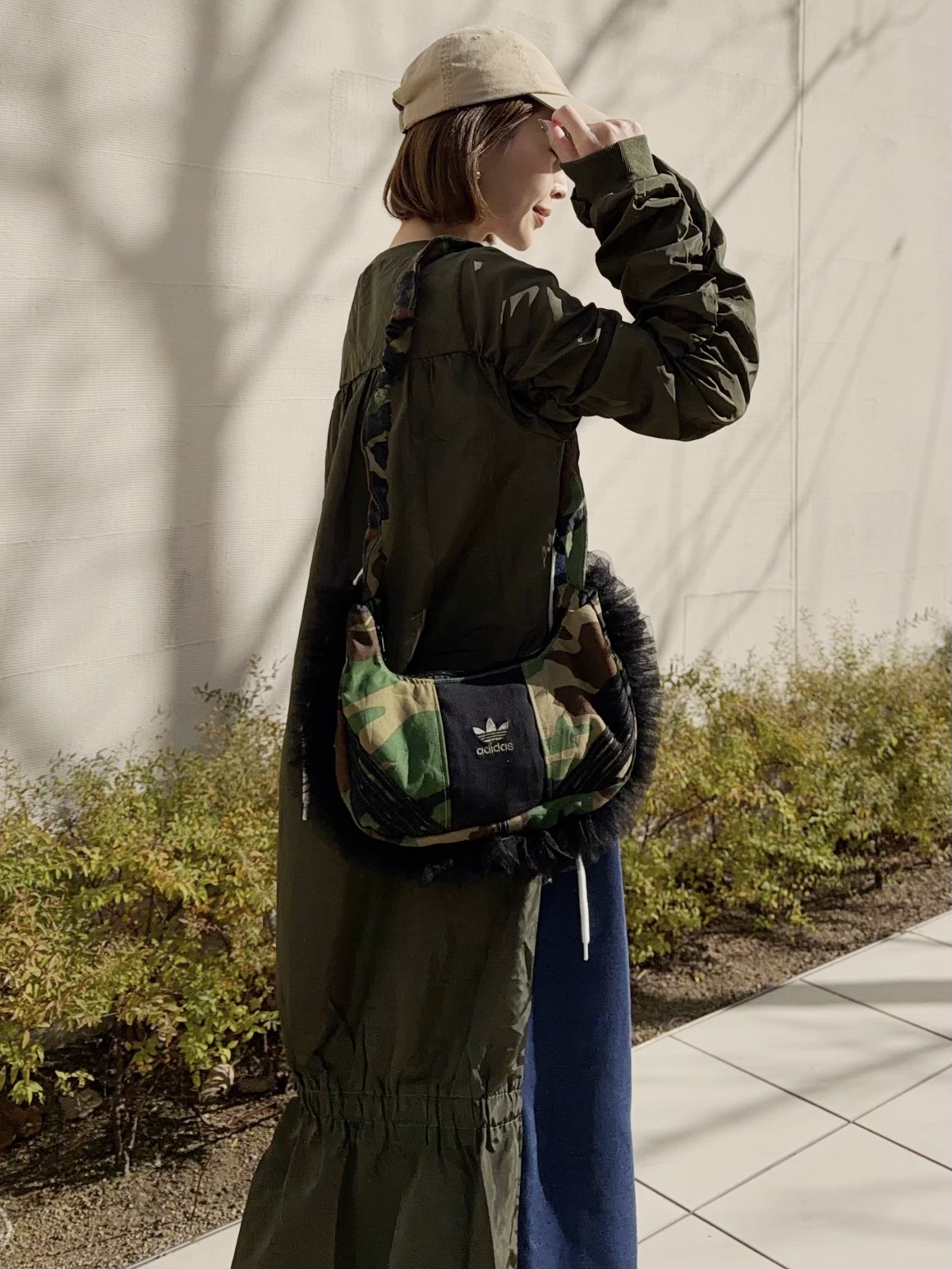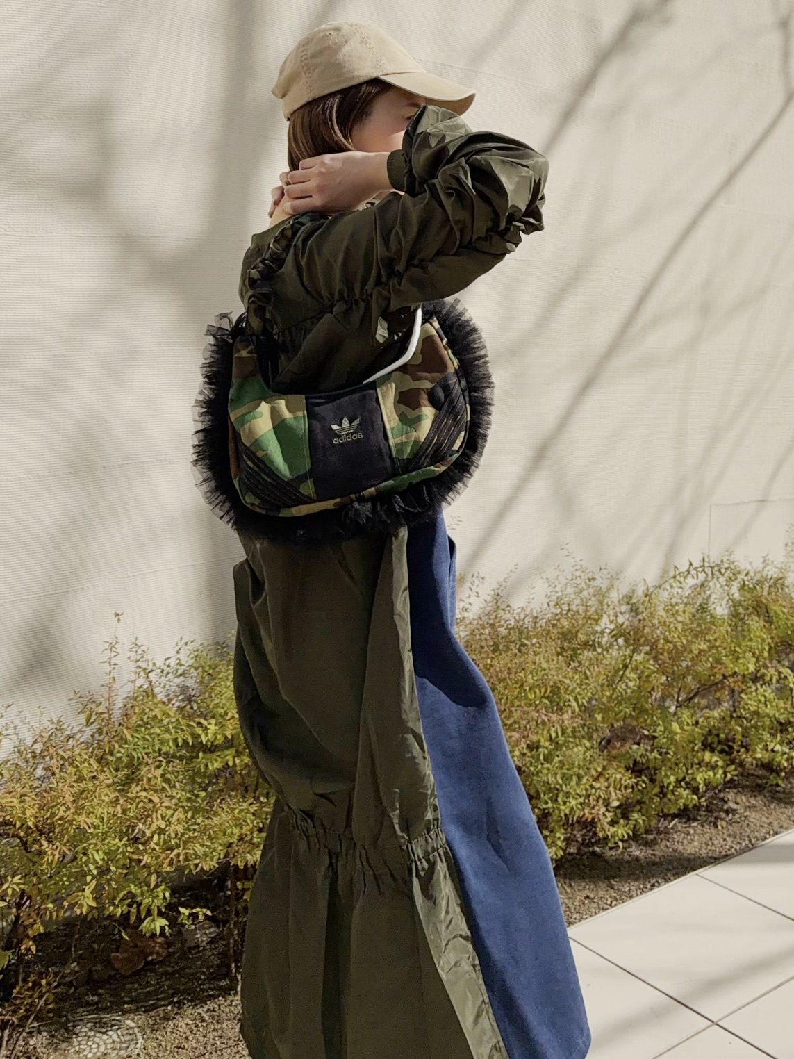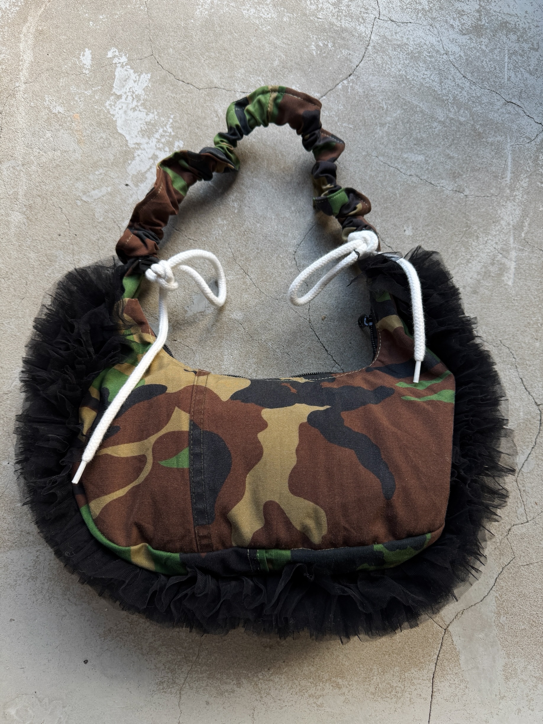 adidasのスウエットとカモフラージュ柄の生地を組み合わせてリメイクした2wayバッグ。ドローコードを伸ばすとショルダーバッグとしてもお持ちいただけます。全体のバランスが取りやすいころんとしたフォルムがポイント。しっかりとマチのあるデザインで財布、ポーチ、スマホ等十分収納可能です。ボリューミーなチュールのフリルをあしらいカジュアル感を抑えました。HOUSE OF VINTAGEは全て1点物のアイテムを展開。柄の出方やデニムの色落ちなど、同じものは一つとして無いあなただけの一着をお届けします。※こちらの商品はヴィンテージのデニムや生地を使用しております。多少の汚れやほつれ等ダメージがある場合が御座います。ヴィンテージ特有の風合いをご理解、ご了承頂いた上でのご注文をお願い致します。ヴィンテージ商品の返品交換は対応致しかねます。神経質な方や商品の特性をご理解、ご了承頂けない方は手に取ってご購入頂けるショップでのご購入をお願い致します。STAFF:158cm【サイズ】(平置き採寸)縦16cm 横33cm まち(底部分)8cm 持ち手高さ41cm(ストラップを最長にした状態で計測)【素材】コットン■クロネコ代金後払いをご利用のお客様■商品到着後に請求書(払込用紙)が到着します。14日以内にお支払いをお願いします。全国の主要なコンビニで、請求書をレジに持っていくだけでお支払いが可能です。全国の郵便局でも同じ請求書でお支払いできます。※ご請求書が圧着ハガキタイプの場合、郵便局でのお支払いはできません。※弊社の銀行口座宛にお振込頂くものでは御座いません。ご注意下さい。