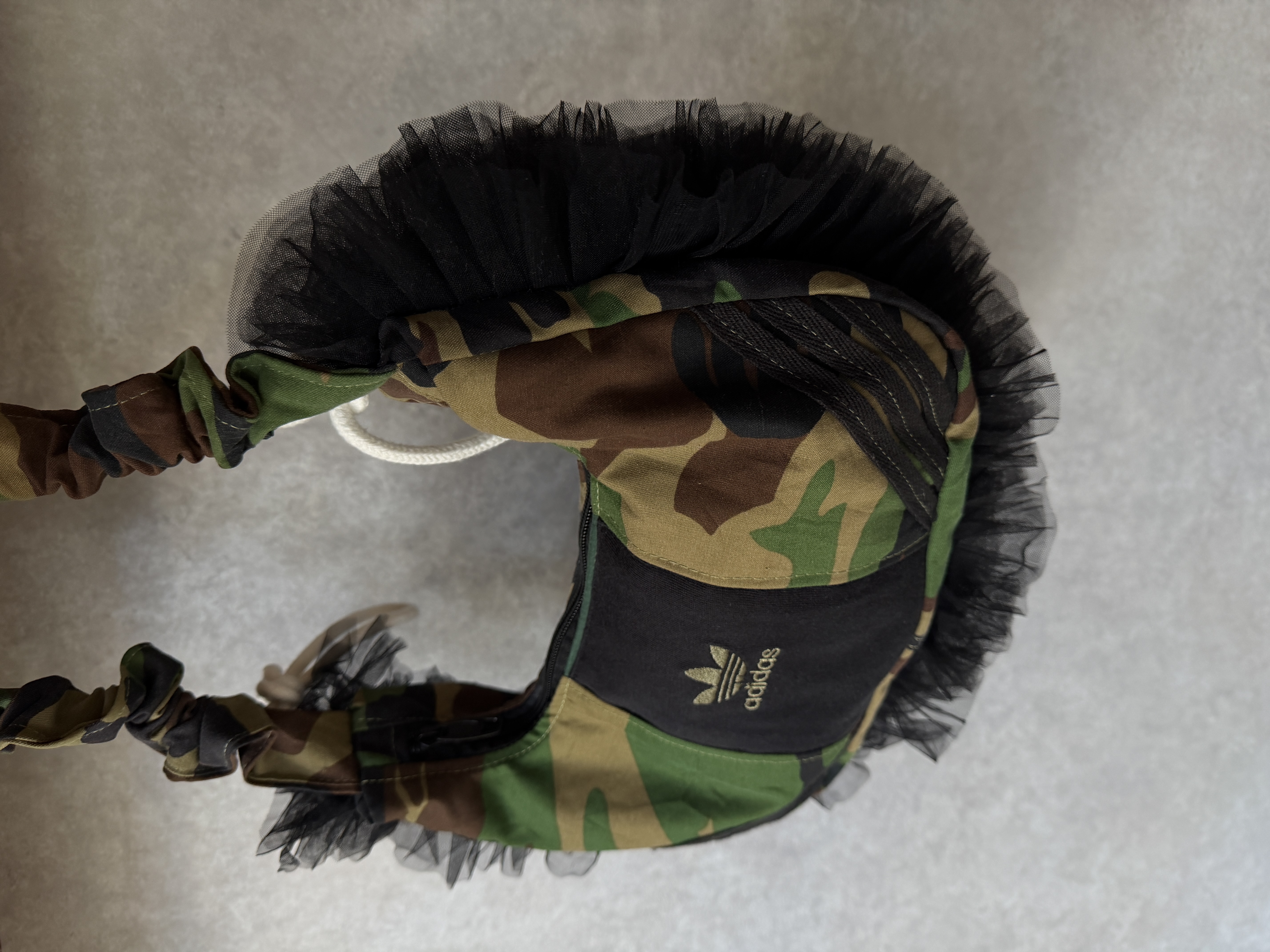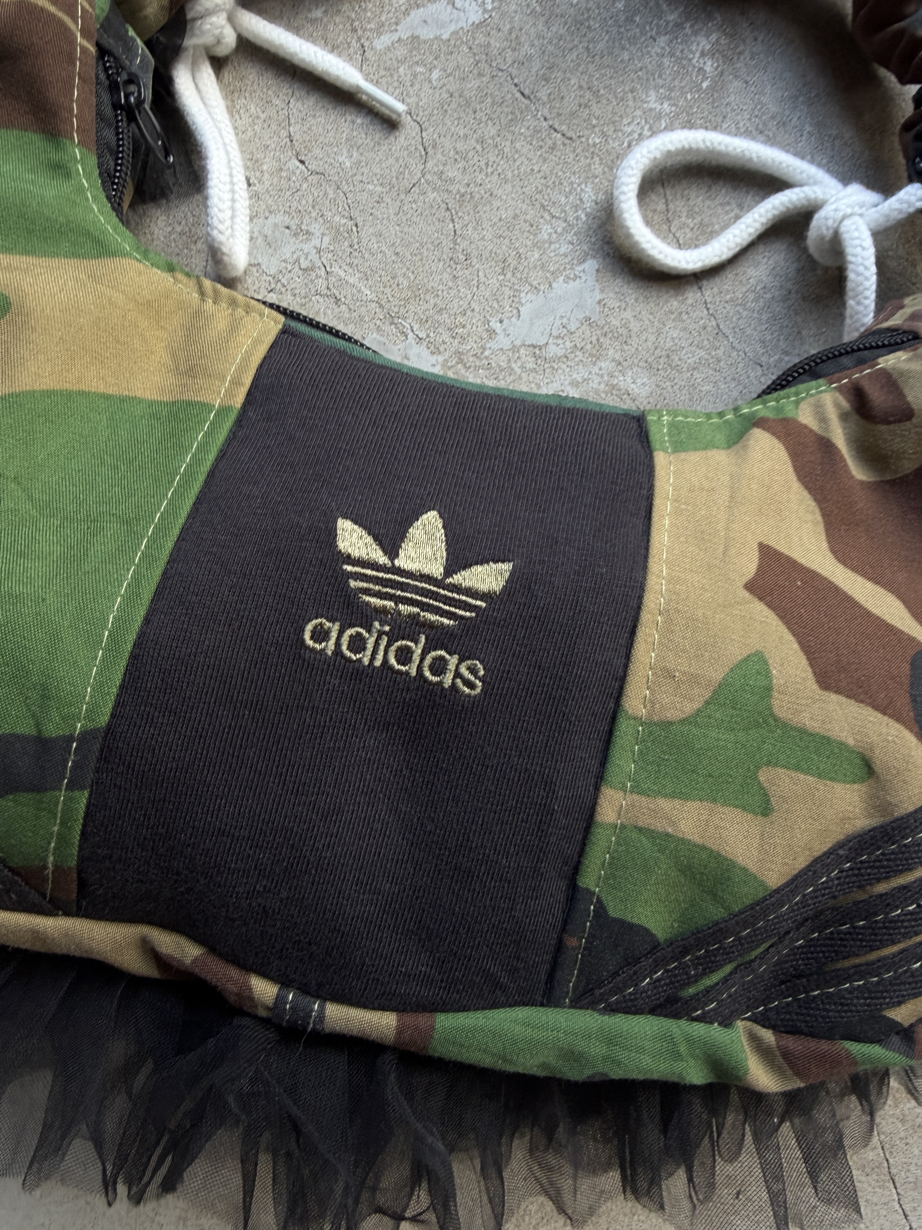 adidasのスウエットとカモフラージュ柄の生地を組み合わせてリメイクした2wayバッグ。