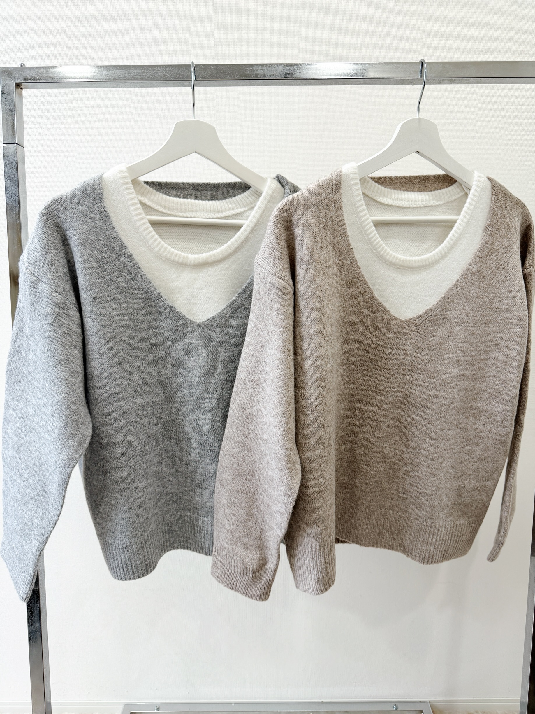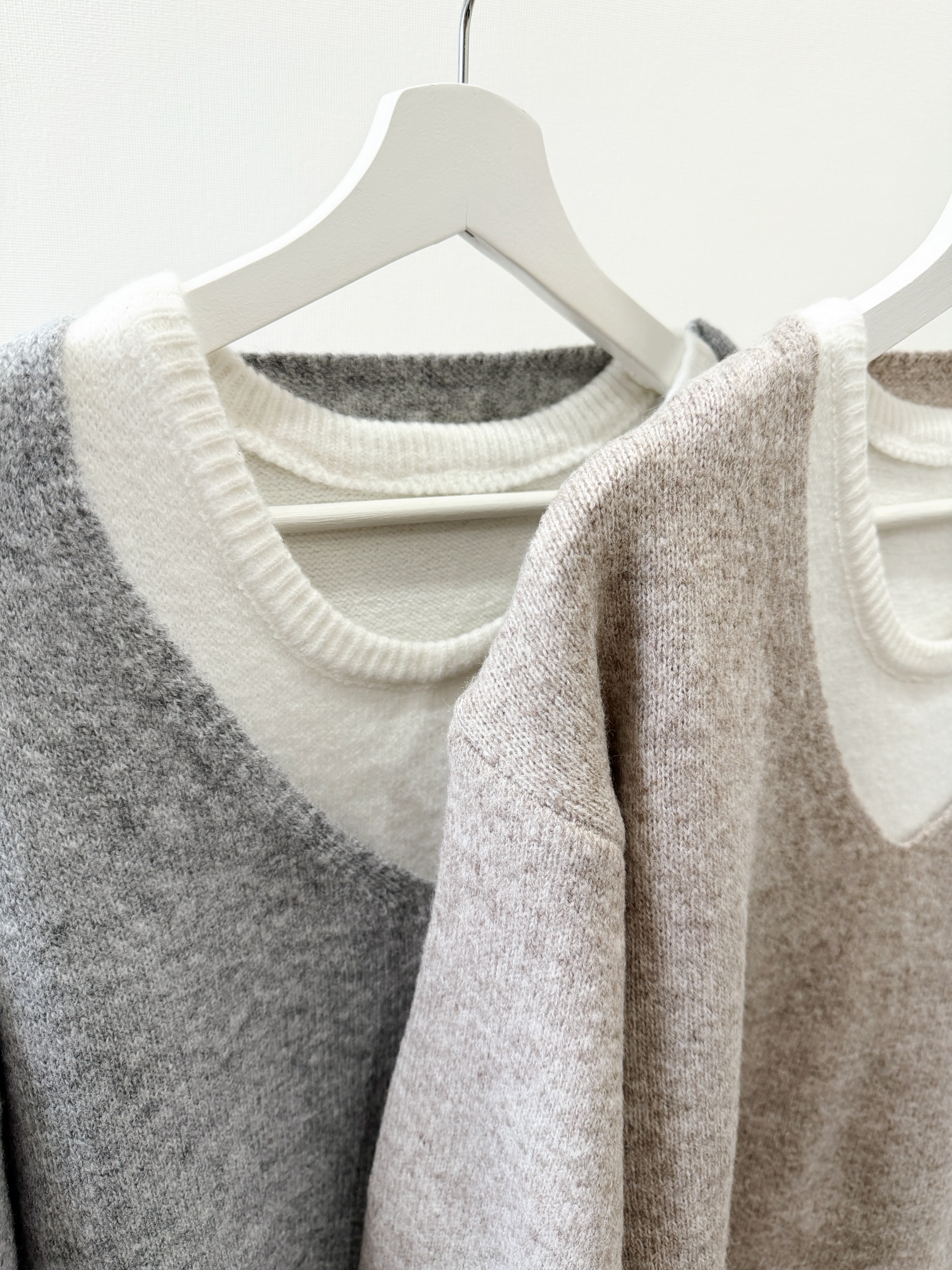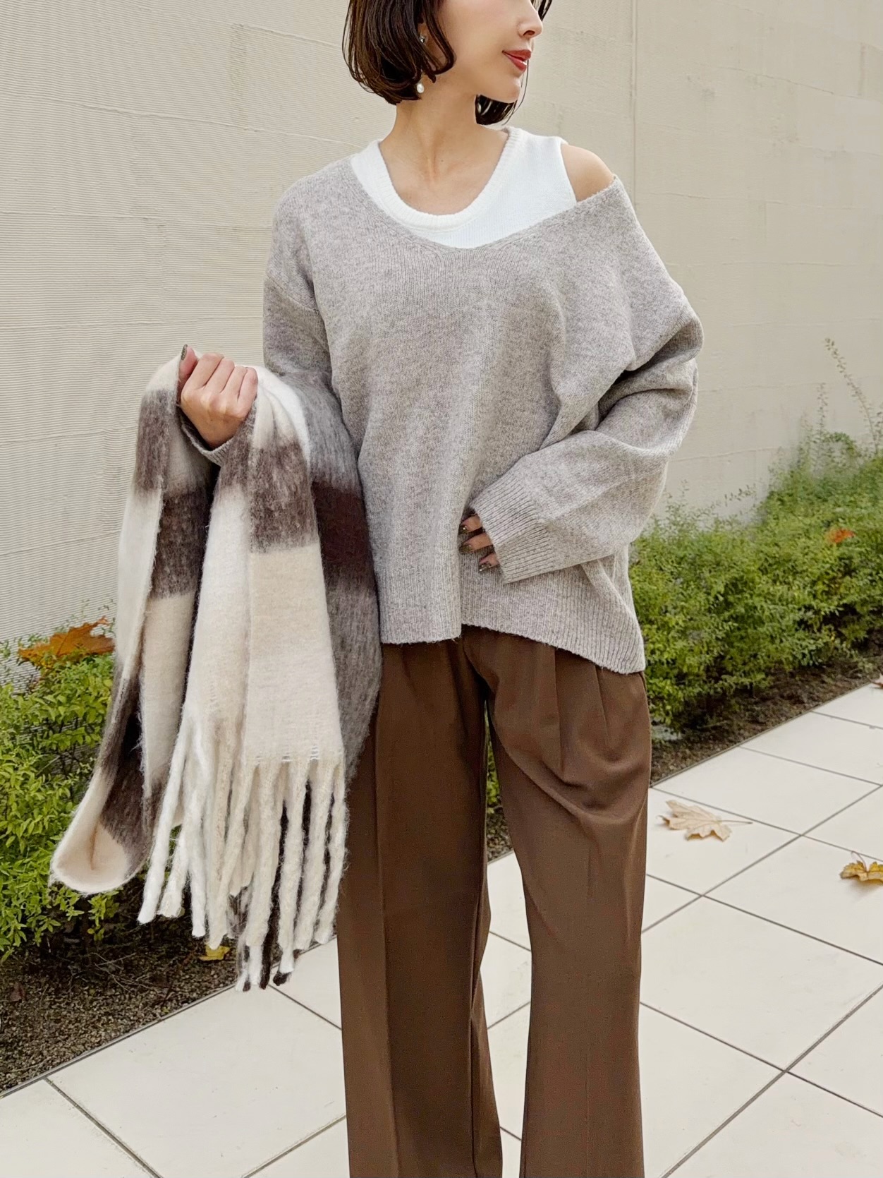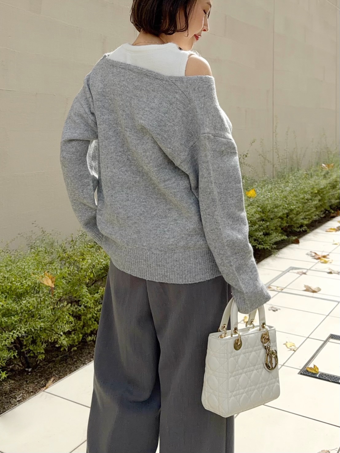 ホワイトのニットタンクとVネックのニットがセットになった1枚。ニットとタンクは個別にも着用可能な2way。シンプルながらも遊び心のあるディティールがポイントです。グレーとベージュの2カラー展開。チクチクしない快適な着心地。身体のラインをカバーするシルエットも◎ずらして肩を見せる着方もお勧めです。STAFF:158cm【サイズ】(平置き採寸/約)タンク/着丈50cm 身幅46cm Vネックニット/着丈59cm 身幅54cm 袖丈48cm【素材】ポリエステル50%,アクリル50% ■クロネコ代金後払いをご利用のお客様■商品到着後に請求書(払込用紙)が到着します。14日以内にお支払いをお願いします。全国の主要なコンビニで、請求書をレジに持っていくだけでお支払いが可能です。全国の郵便局でも同じ請求書でお支払いできます。※ご請求書が圧着ハガキタイプの場合、郵便局でのお支払いはできません。※弊社の銀行口座宛にお振込頂くものでは御座いません。ご注意下さい。