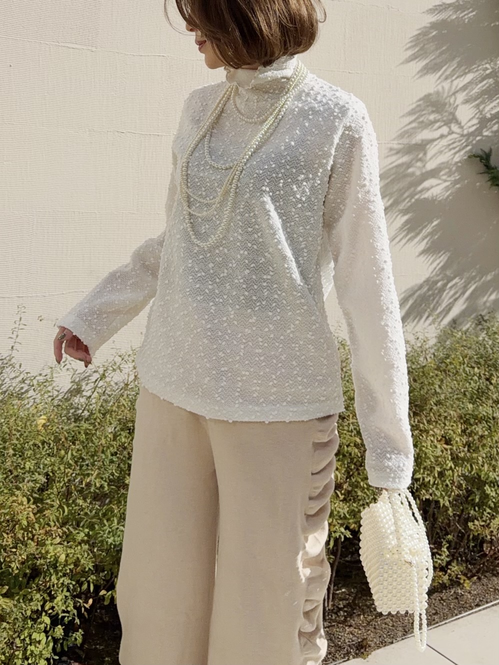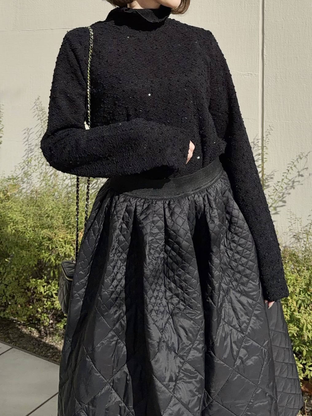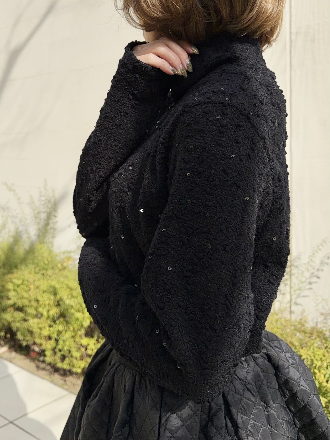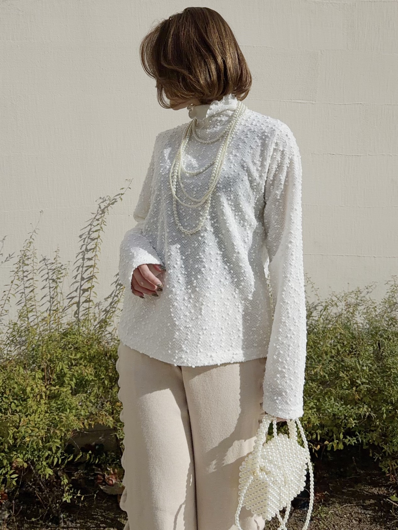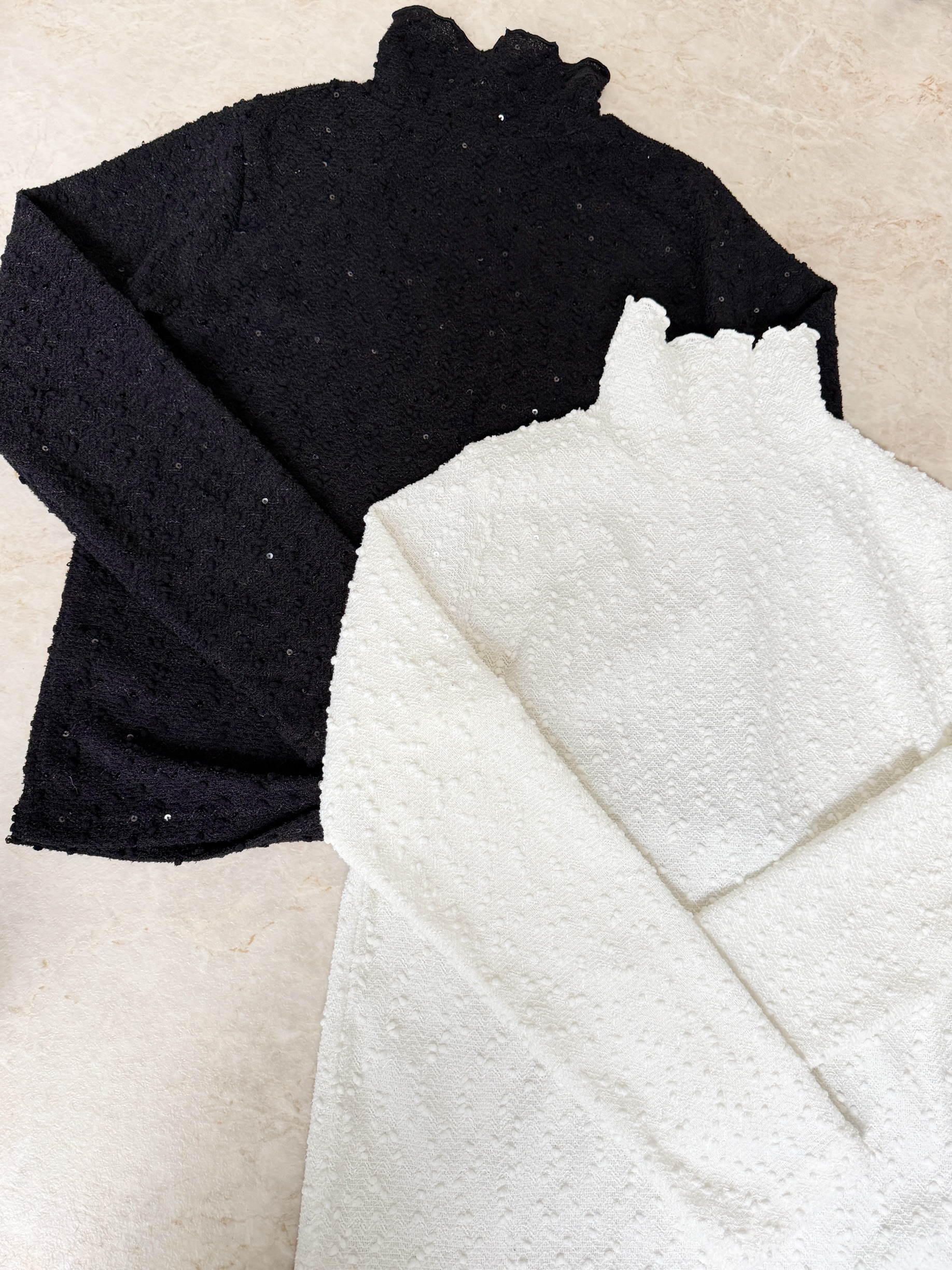 スパンコールが編まれたポコポコした生地が可愛いタートルトップス。