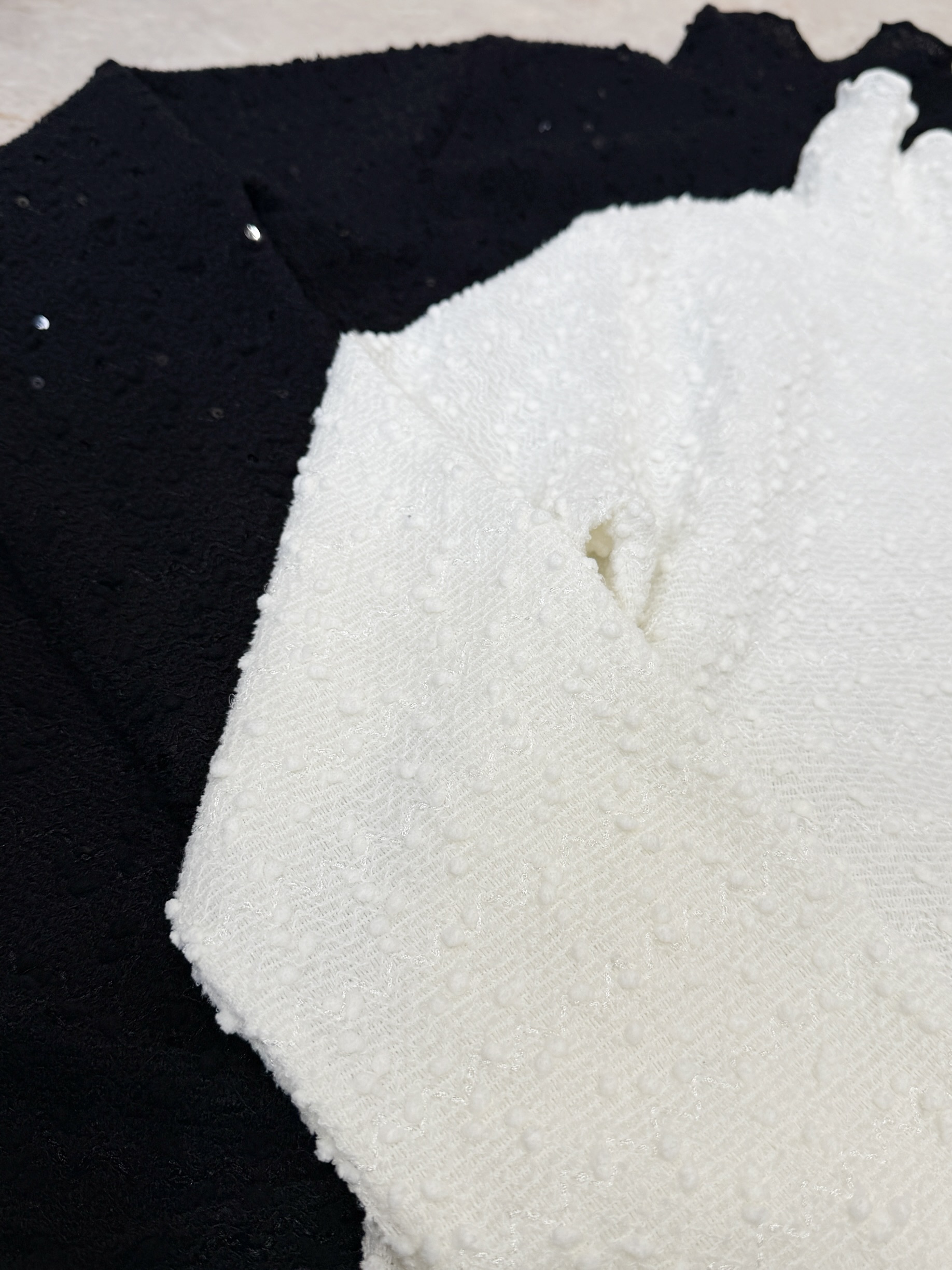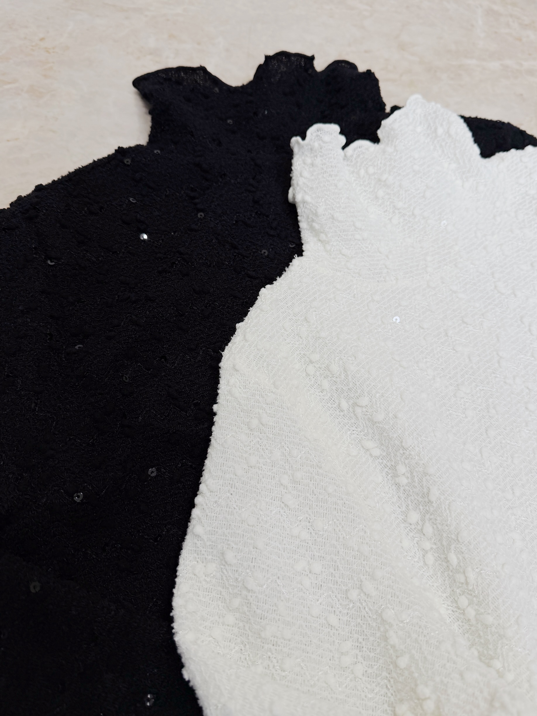 ブラックはブラックのスパンコール、ホワイトは クリアのスパンコールが装飾されています。