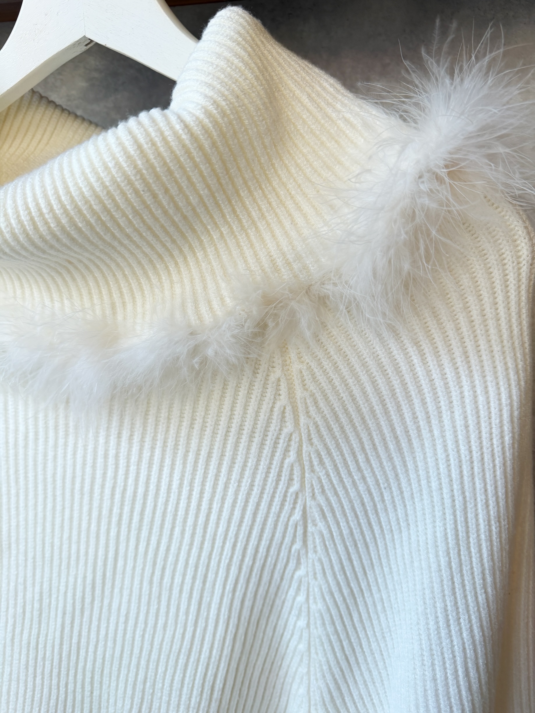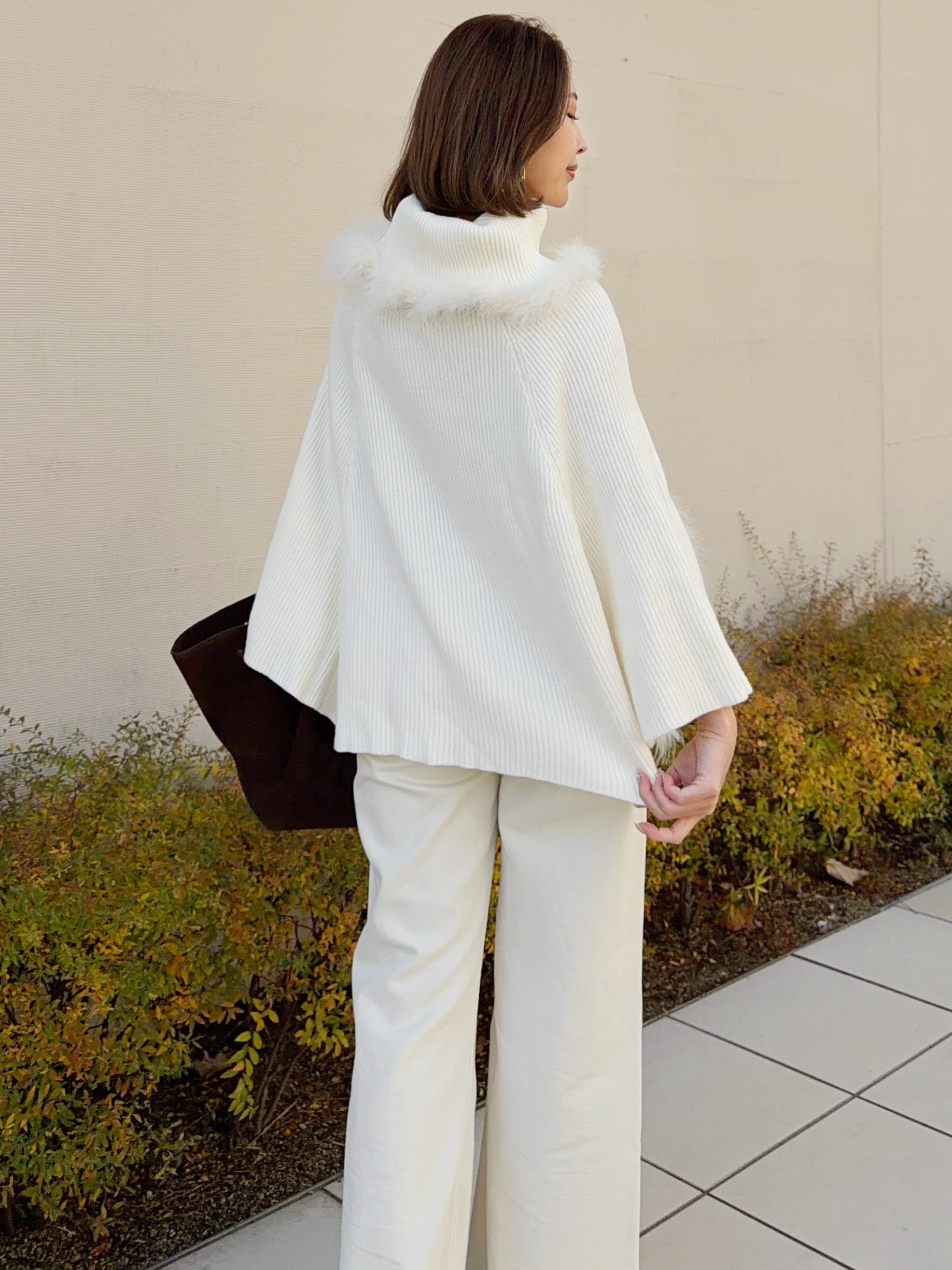フェザーがあしらわれた華やかケープニット。冬のスタイリングに映えるホワイトで目立つこと間違いなし。身体のラインを拾わないケープシルエットが大人に嬉しい一枚。タートルニットや、薄手のインナーの上にレイヤードさせても可愛い1枚です。ちくちくしないもちっとしたニット素材で着心地も◎オフショルダーとしても着用可能な2wayデザインです。※フェザーは取り外し不可。STAFF:158cm【サイズ】(平置き採寸)着丈67cm【素材】ポリエステル95%,ポリウレタン5% 付属部分フェザー100%■クロネコ代金後払いをご利用のお客様■商品到着後に請求書(払込用紙)が到着します。14日以内にお支払いをお願いします。全国の主要なコンビニで、請求書をレジに持っていくだけでお支払いが可能です。全国の郵便局でも同じ請求書でお支払いできます。※ご請求書が圧着ハガキタイプの場合、郵便局でのお支払いはできません。※弊社の銀行口座宛にお振込頂くものでは御座いません。ご注意下さい。