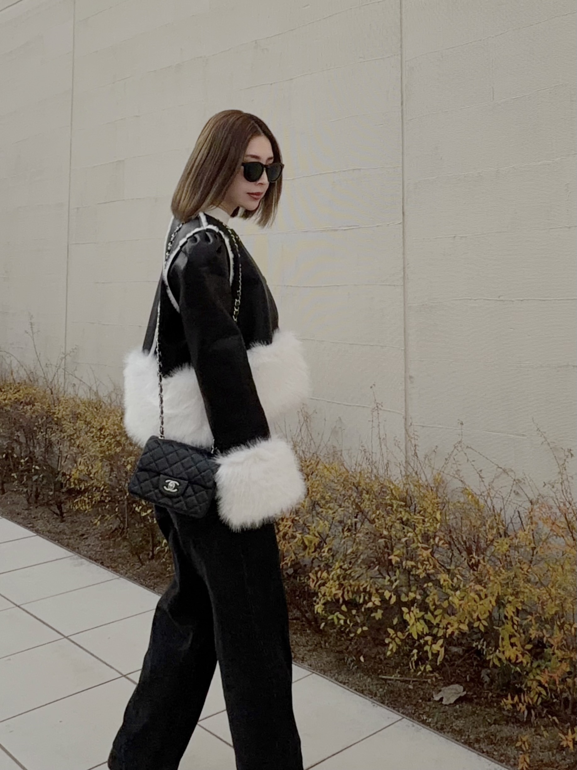 袖口と裾のボリューミーなエコファーがリッチな雰囲気。