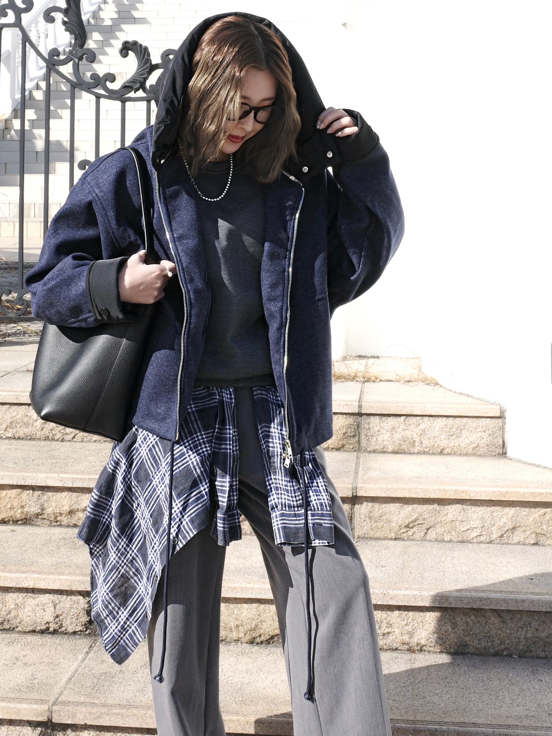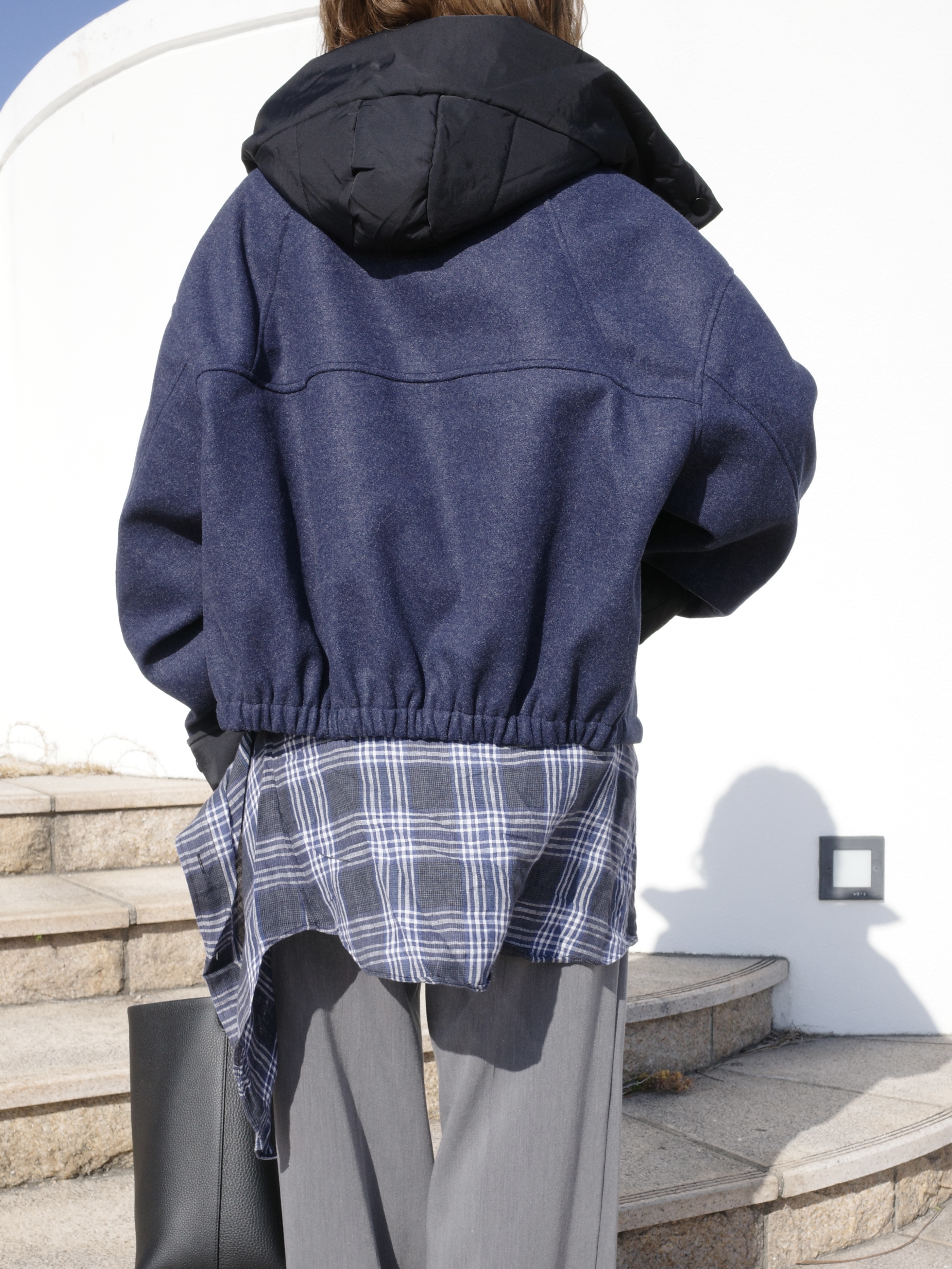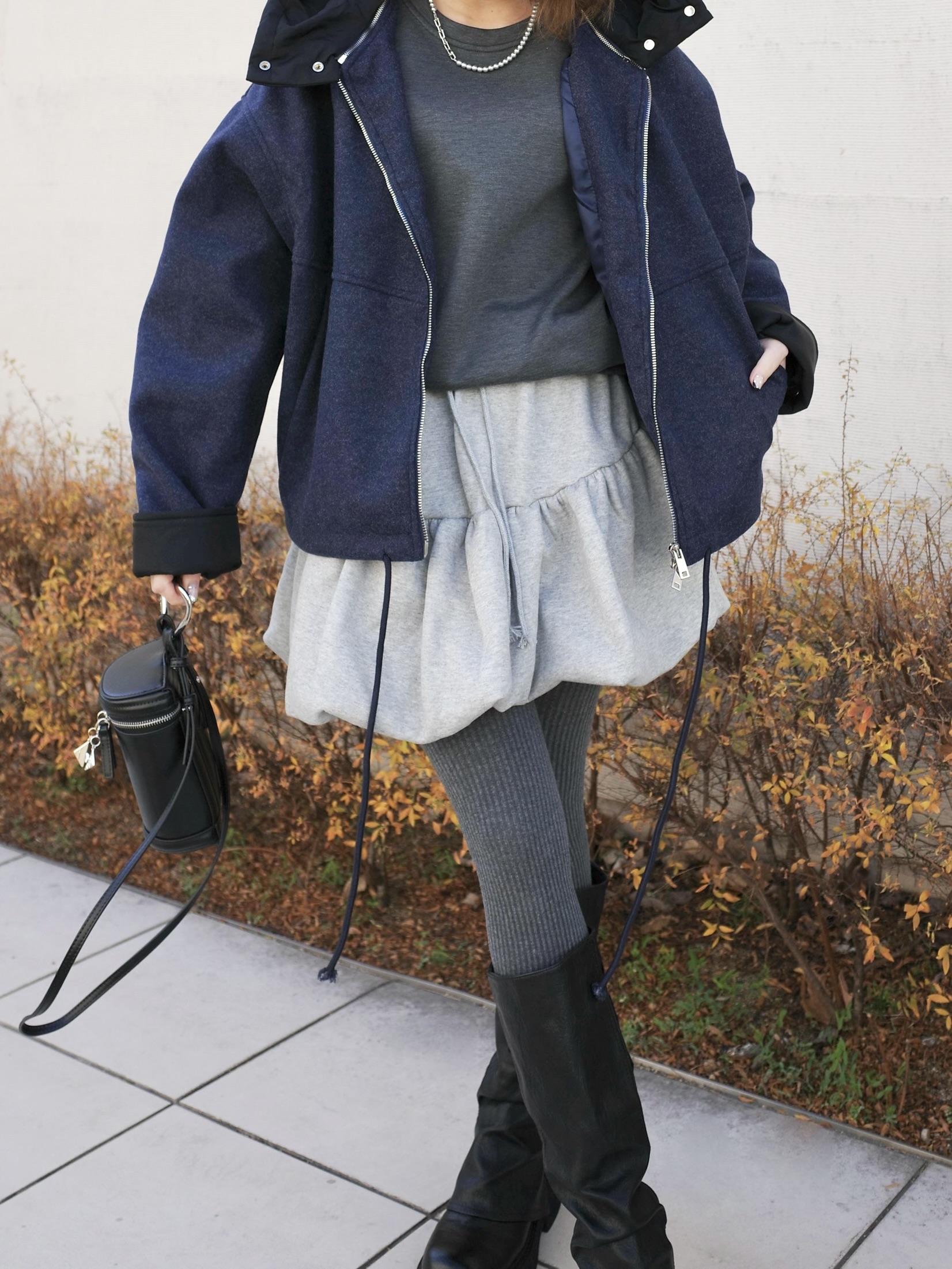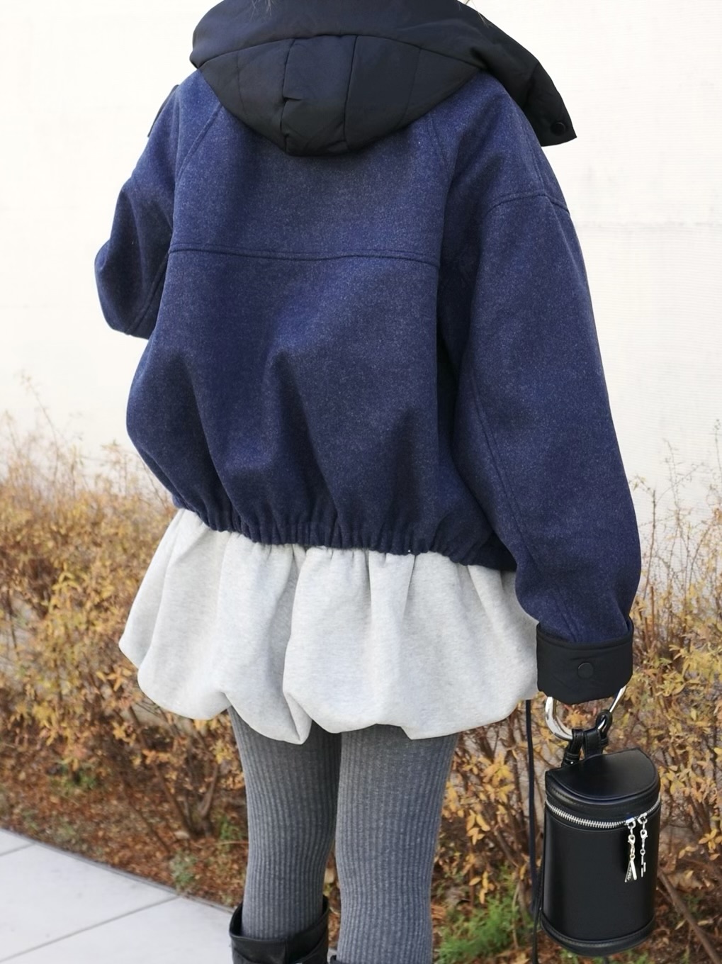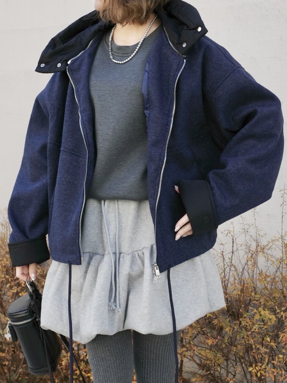 ウールライクなネイビーのボディにブラックの異素材切替のコントラストが映える一着。