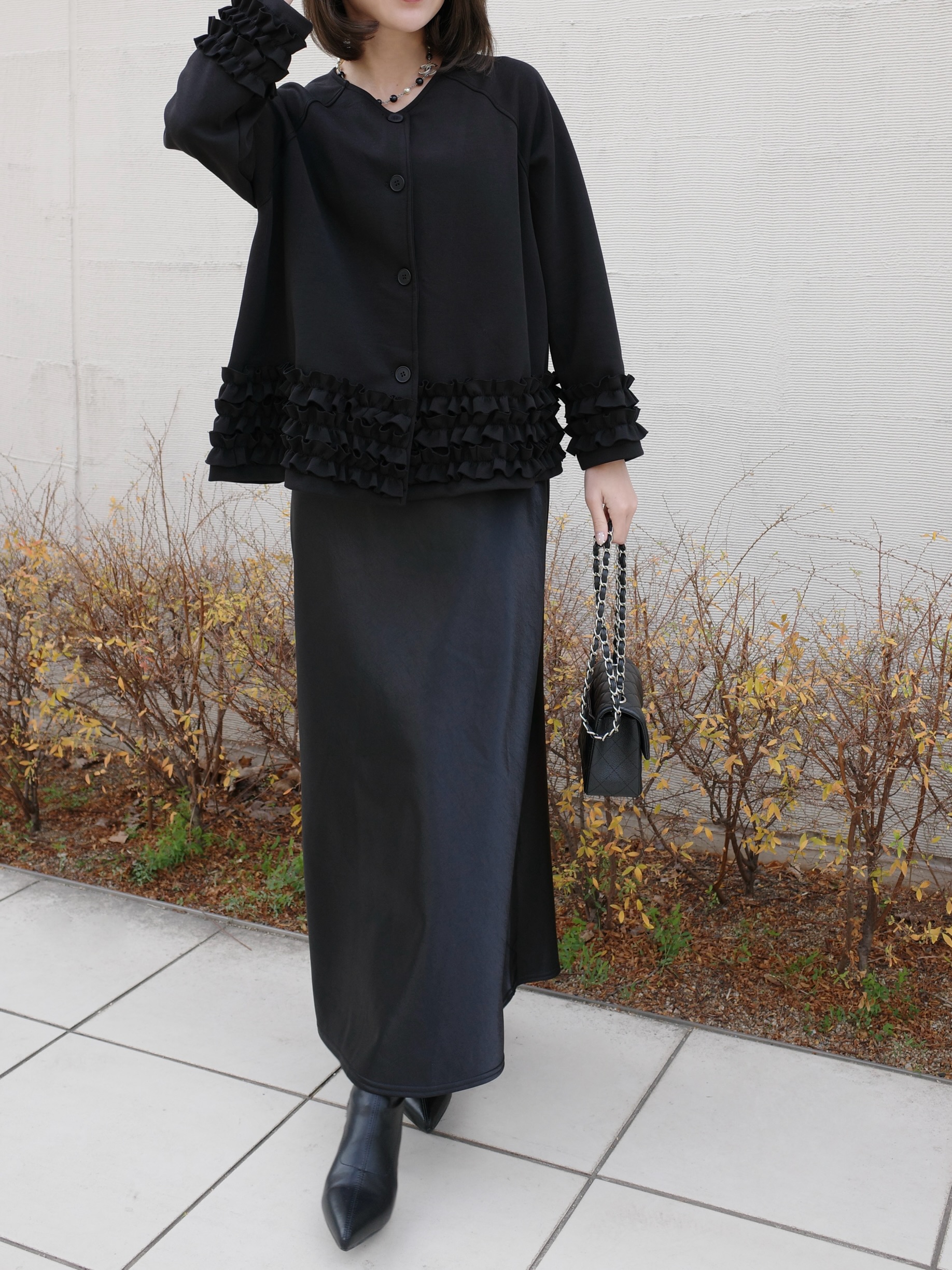裾と袖口にあしらわれたフリルが上品フェミニンなトップス。トップスとしてはもちろん、カーディガンとしても着用可能な2wayデザイン。身体のラインを拾わないゆとりを持たせたシルエットで体型カバーも叶えます。甘くなり過ぎないフリルで大人でもトライしやすい1枚。伸縮性のある柔らかな素材でアウターを上から羽織ってもモタつきません。シンプルなスタイリングにスパイスをプラスしてくれるアイテムです♡春先の羽織としても活躍します。STAFF:158cm【サイズ】(平置き採寸)着丈59cm 身幅57cm 袖丈52cm【素材】ポリエステル95%,ポリウレタン5%■クロネコ代金後払いをご利用のお客様■商品到着後に請求書(払込用紙)が到着します。14日以内にお支払いをお願いします。全国の主要なコンビニで、請求書をレジに持っていくだけでお支払いが可能です。全国の郵便局でも同じ請求書でお支払いできます。※ご請求書が圧着ハガキタイプの場合、郵便局でのお支払いはできません。※弊社の銀行口座宛にお振込頂くものでは御座いません。ご注意下さい。