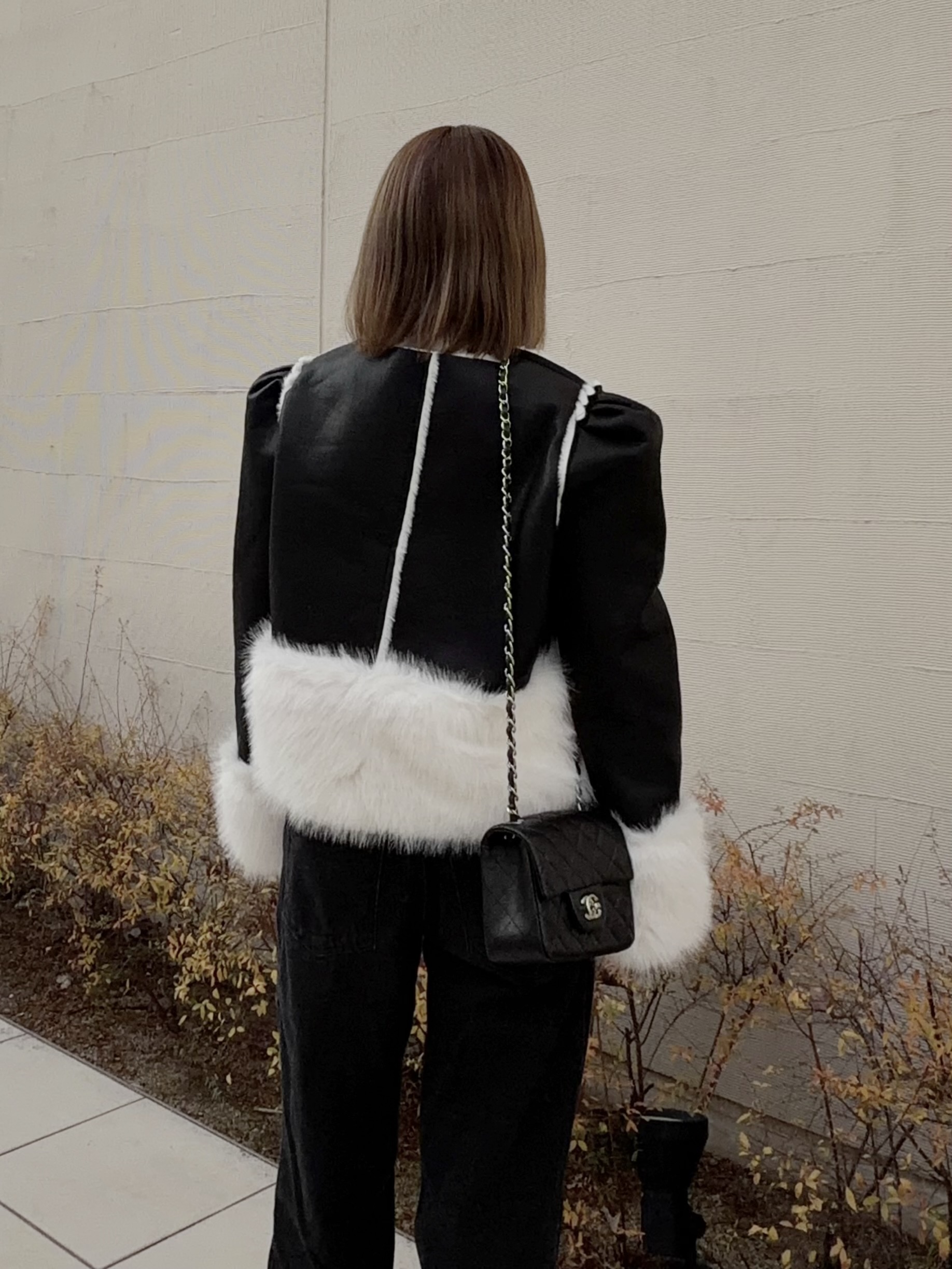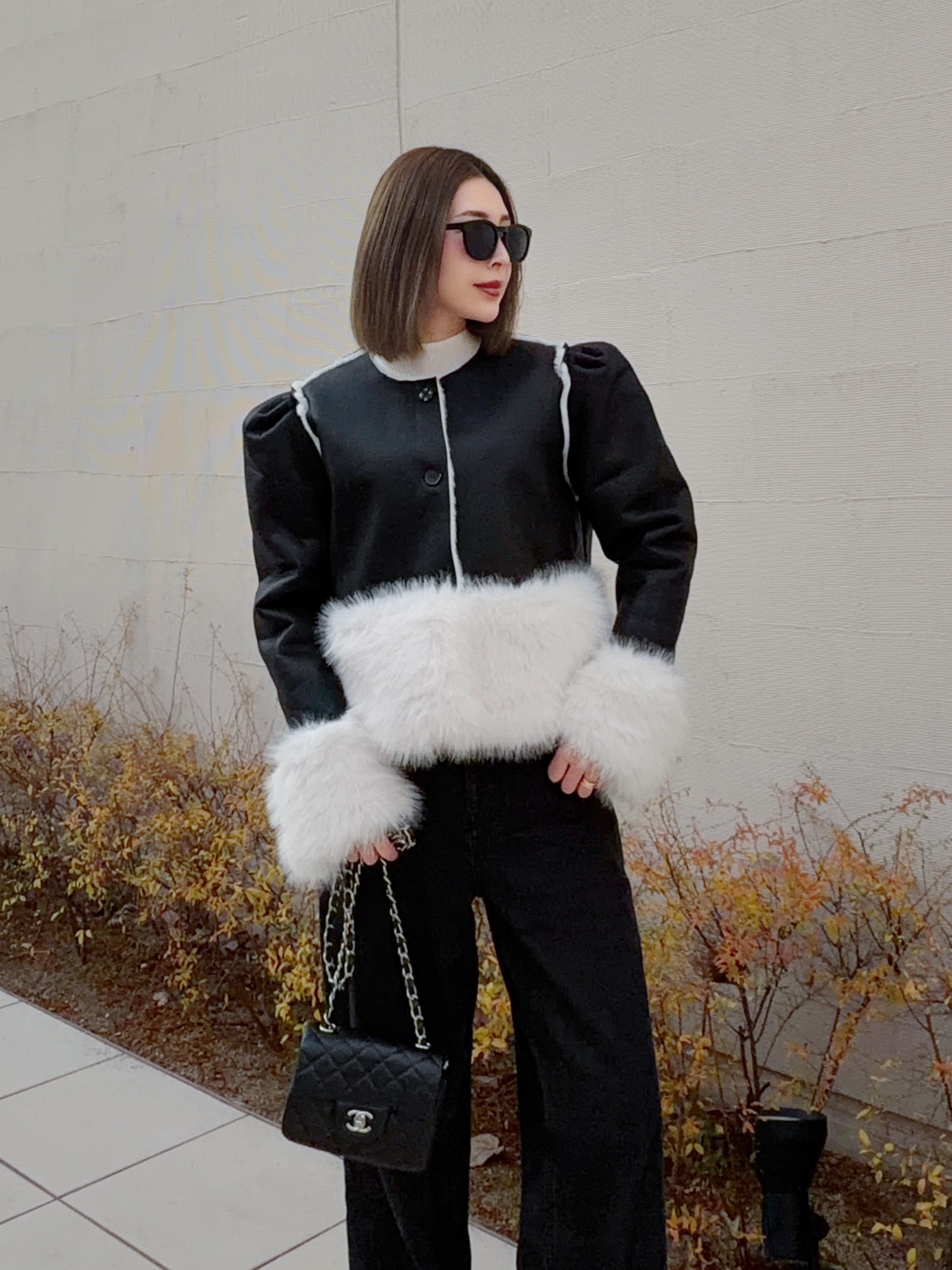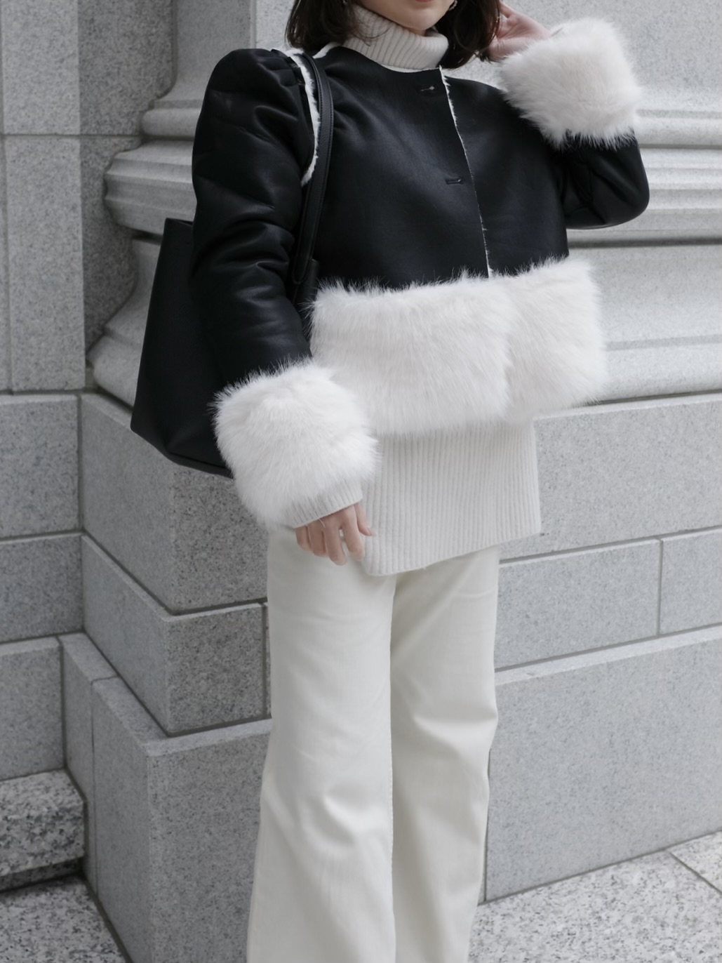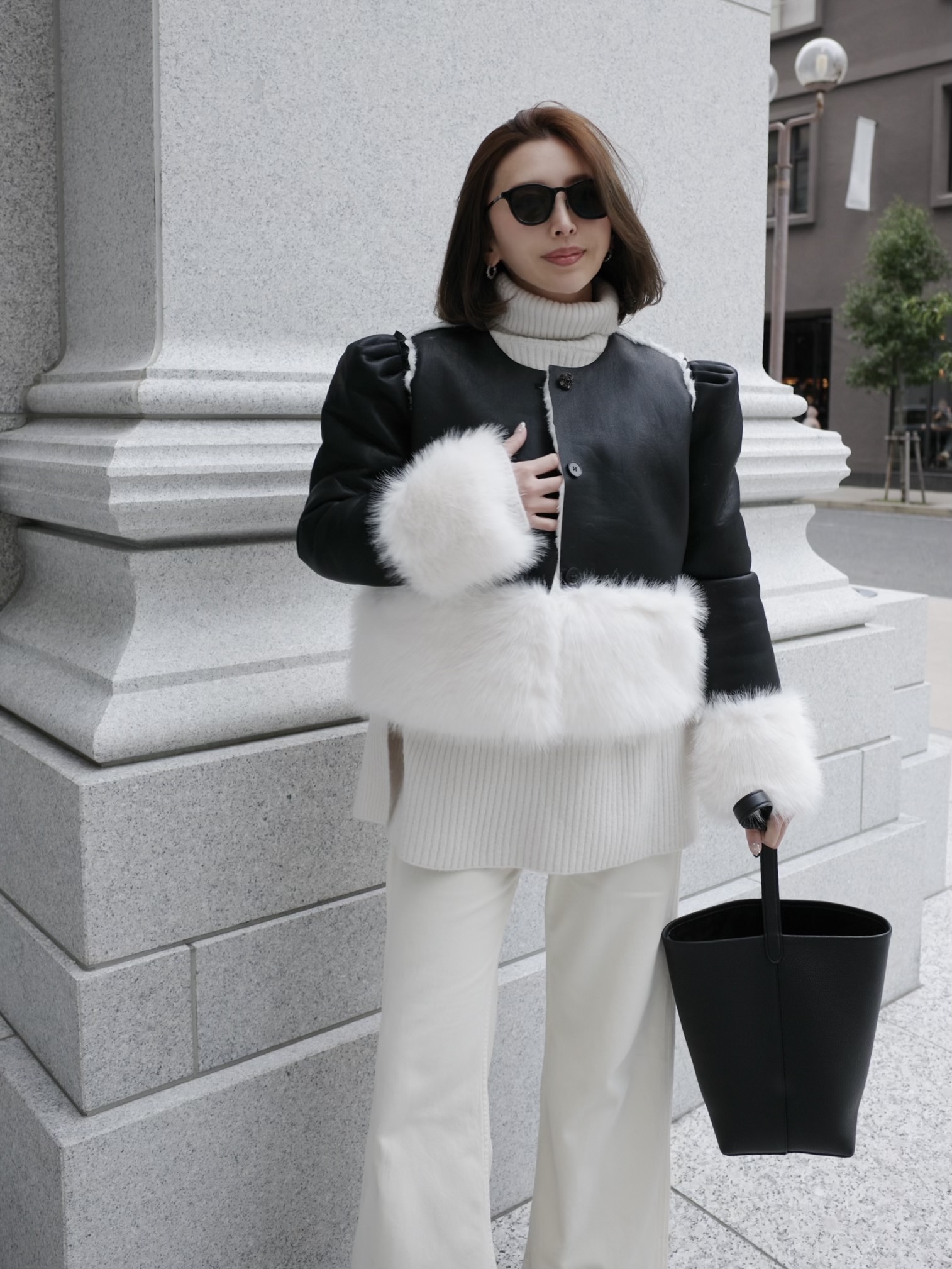 袖口と裾のボリューミーなエコファーがリッチな雰囲気。