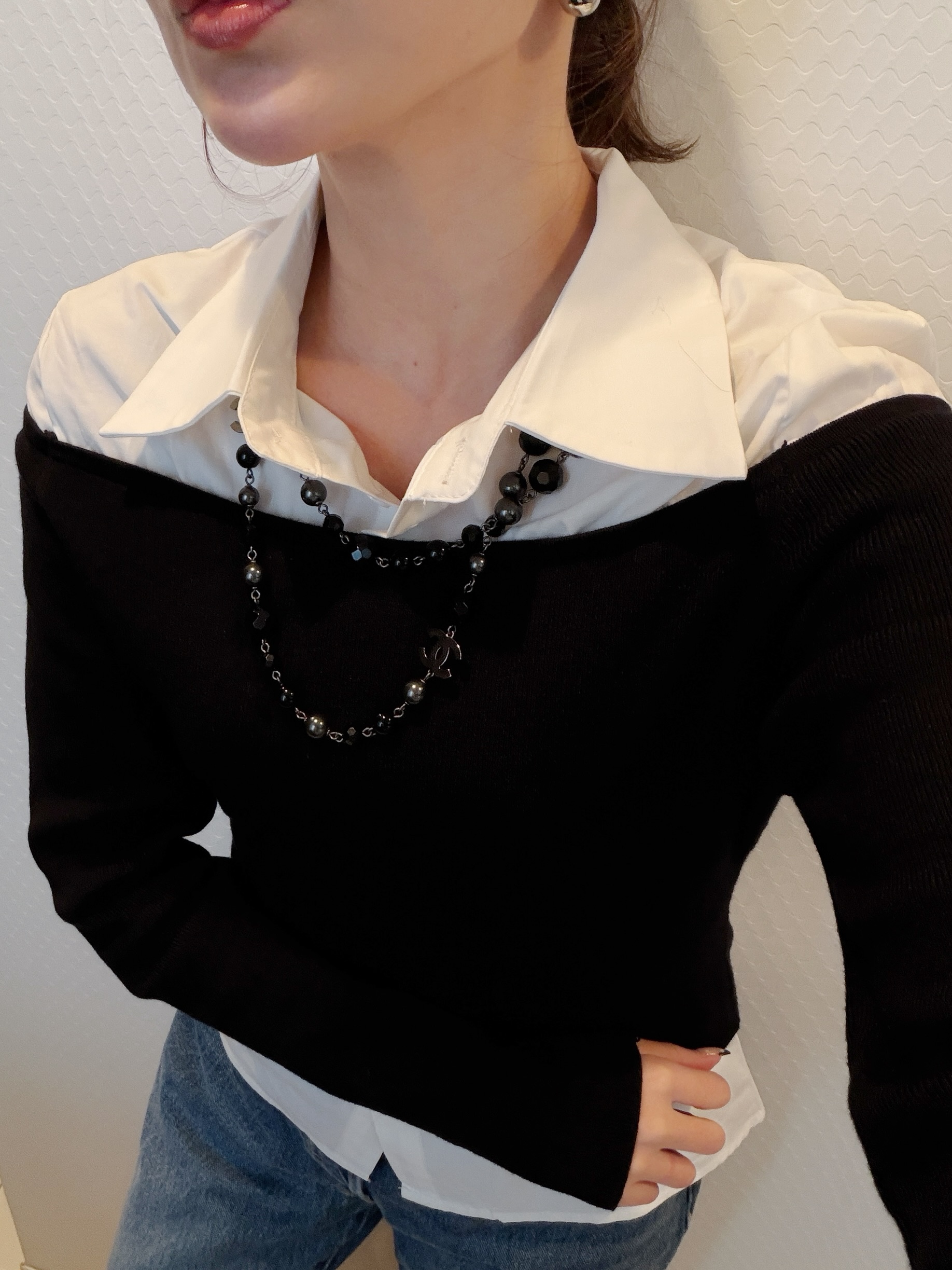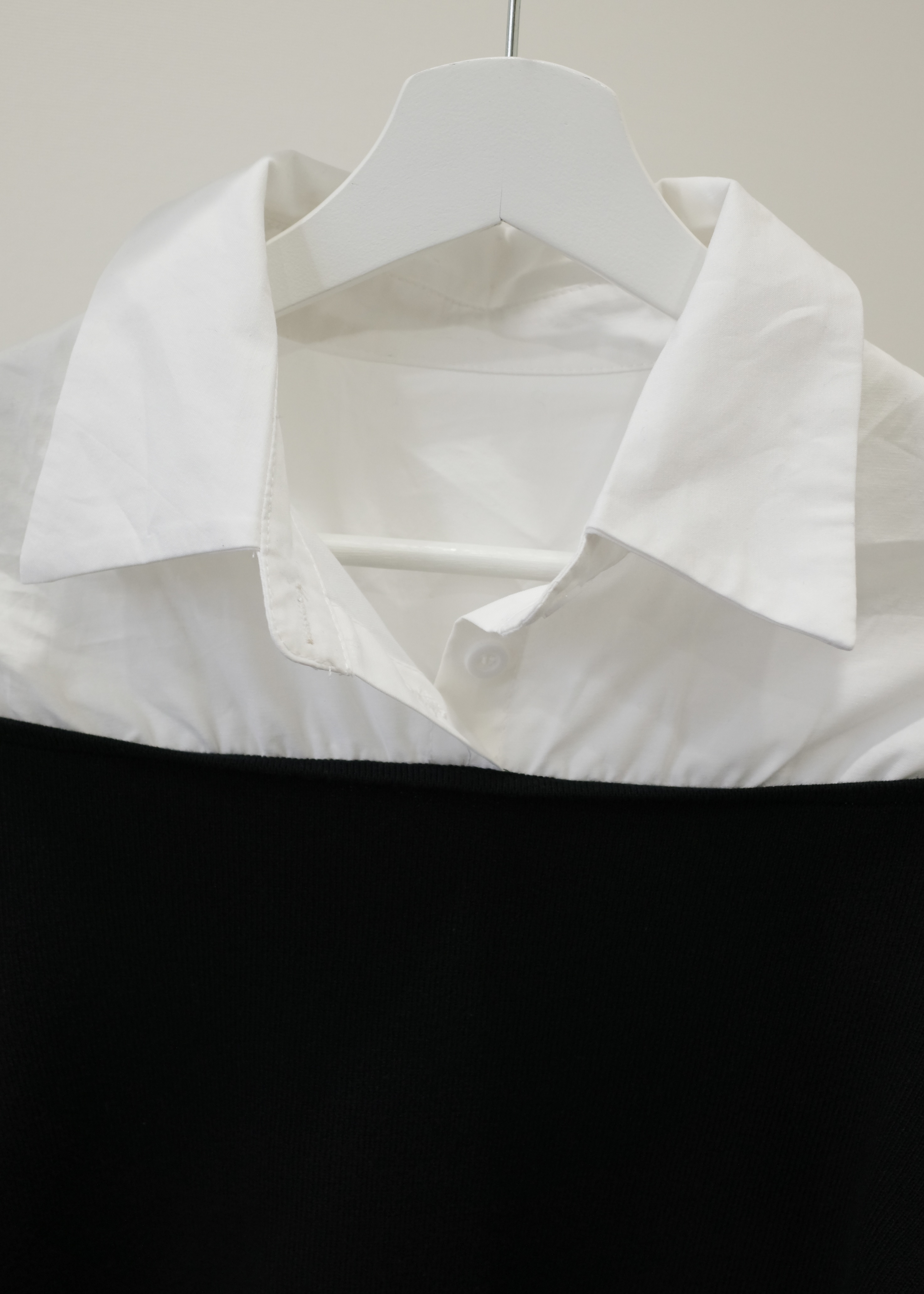 シャツにオフショルダーニットをレイヤードさせたユニークなブラウス。