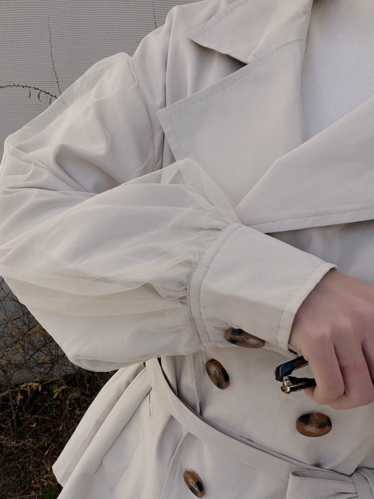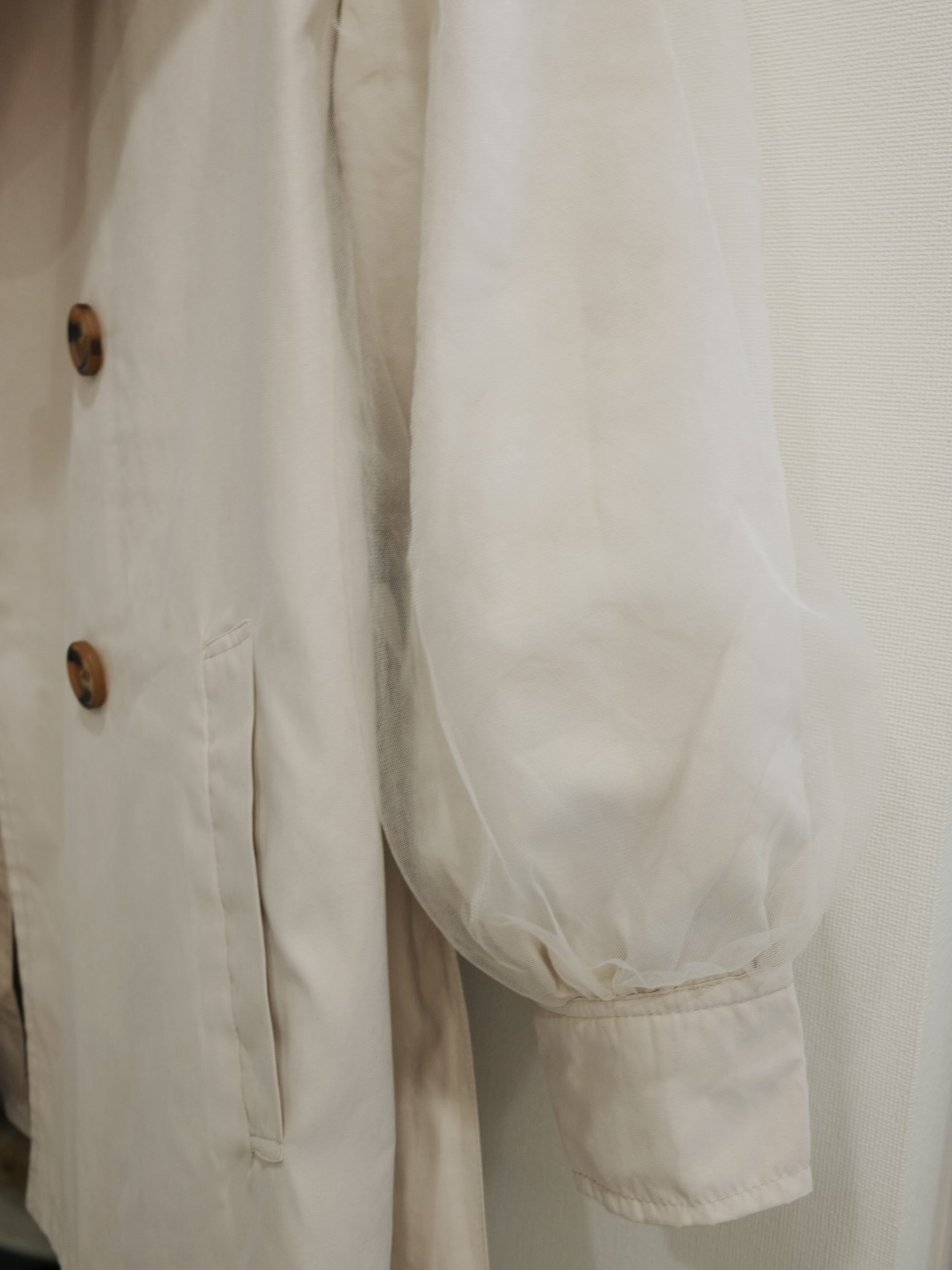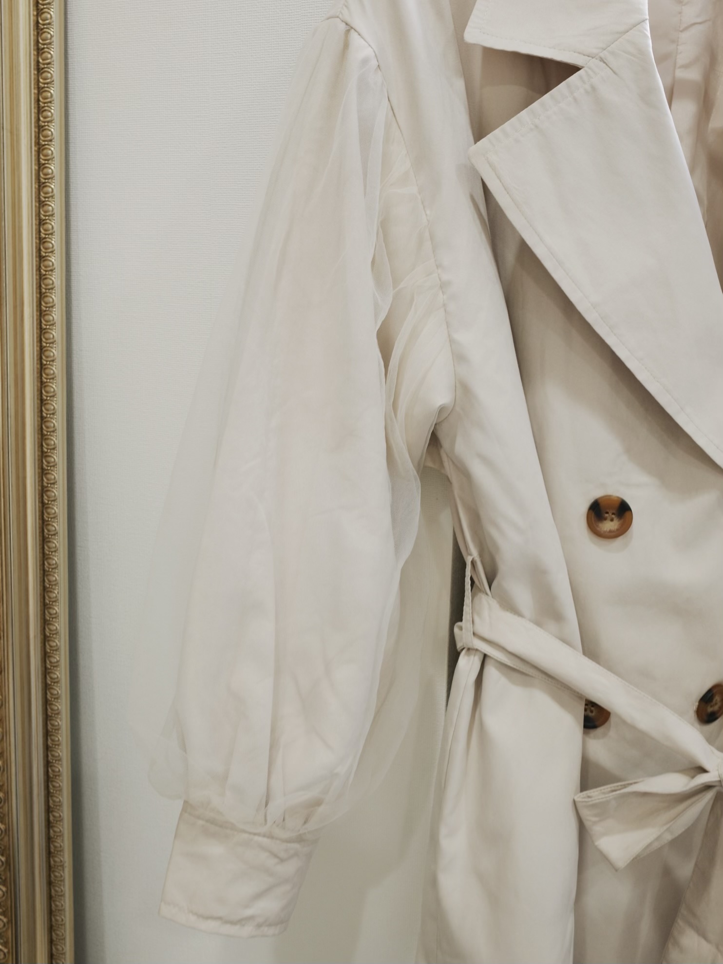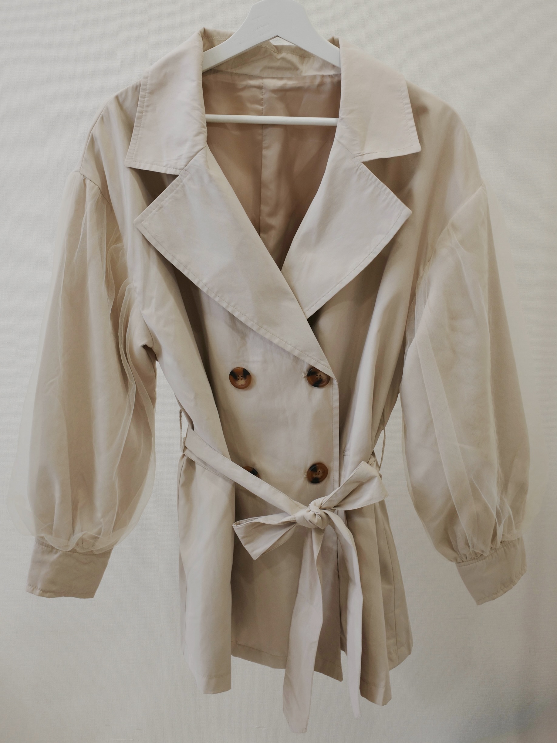 春アウターとして活躍間違いなしのトレンチコート。チュールがあしらわれた、ふんわりボリューミーな袖がポイント。薄手なのでカーディガン感覚で軽く羽織っていただけます。明るいライトベージュがお顔周りをぱっと明るく見せてくれます。STAFF:158cm【サイズ】(平置き採寸)着丈76cm 肩幅56cm 身幅55cm 袖丈53cm【素材】ポリエステル100%■クロネコ代金後払いをご利用のお客様■商品到着後に請求書(払込用紙)が到着します。14日以内にお支払いをお願いします。全国の主要なコンビニで、請求書をレジに持っていくだけでお支払いが可能です。全国の郵便局でも同じ請求書でお支払いできます。※ご請求書が圧着ハガキタイプの場合、郵便局でのお支払いはできません。※弊社の銀行口座宛にお振込頂くものでは御座いません。ご注意下さい。
